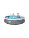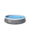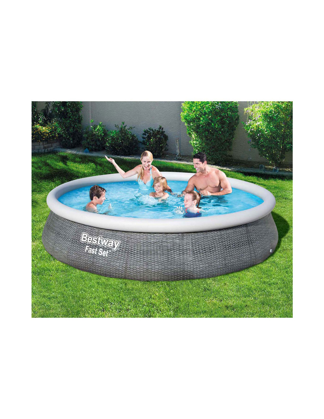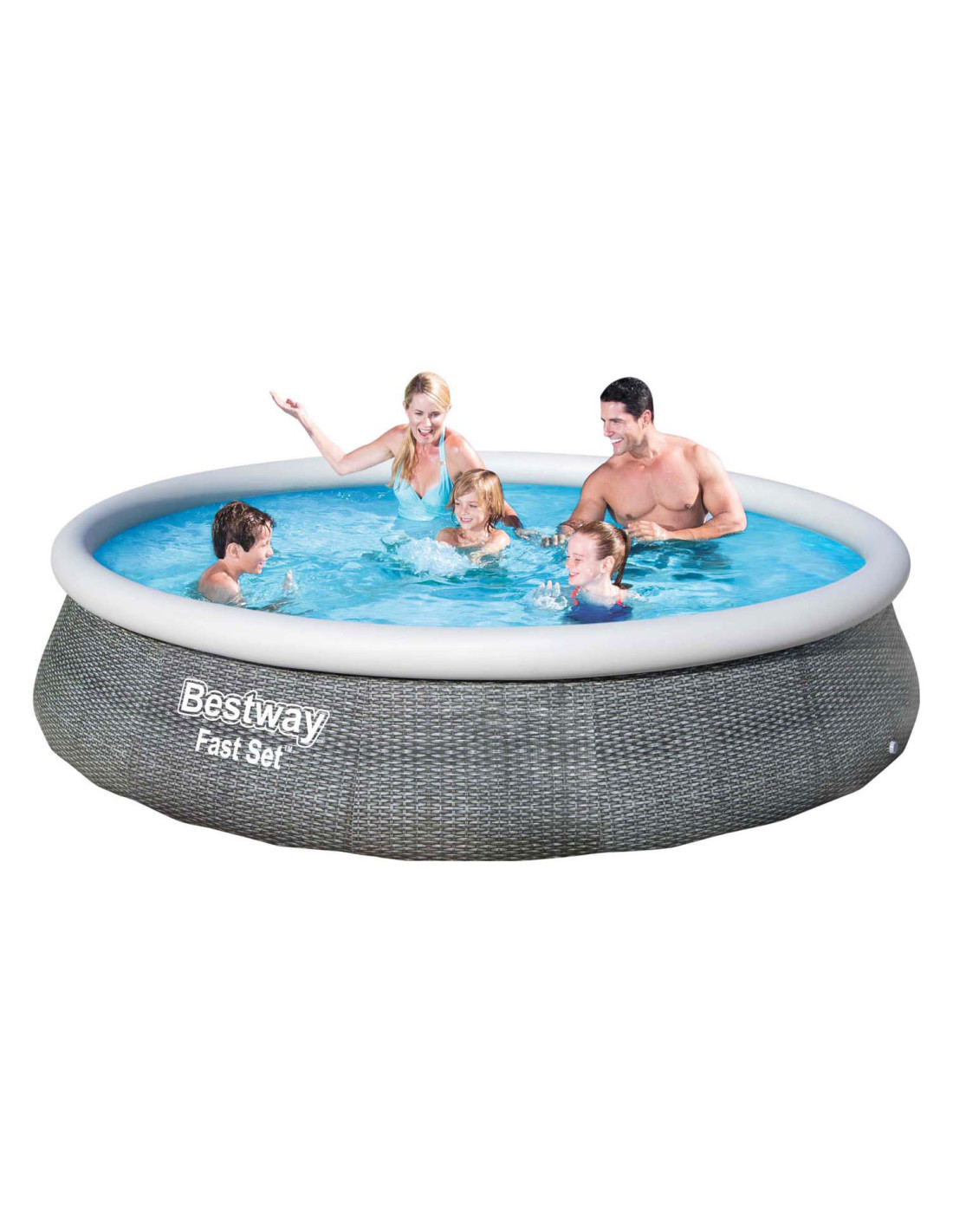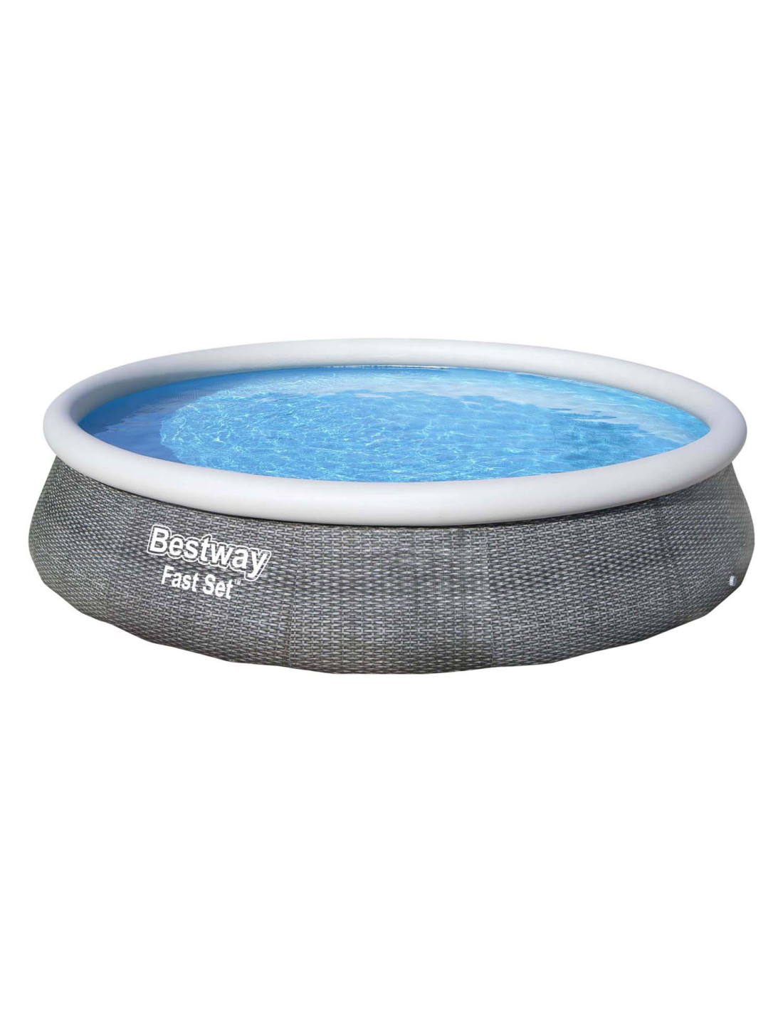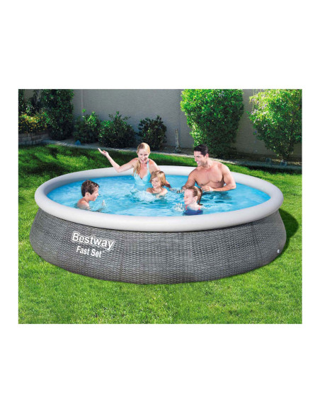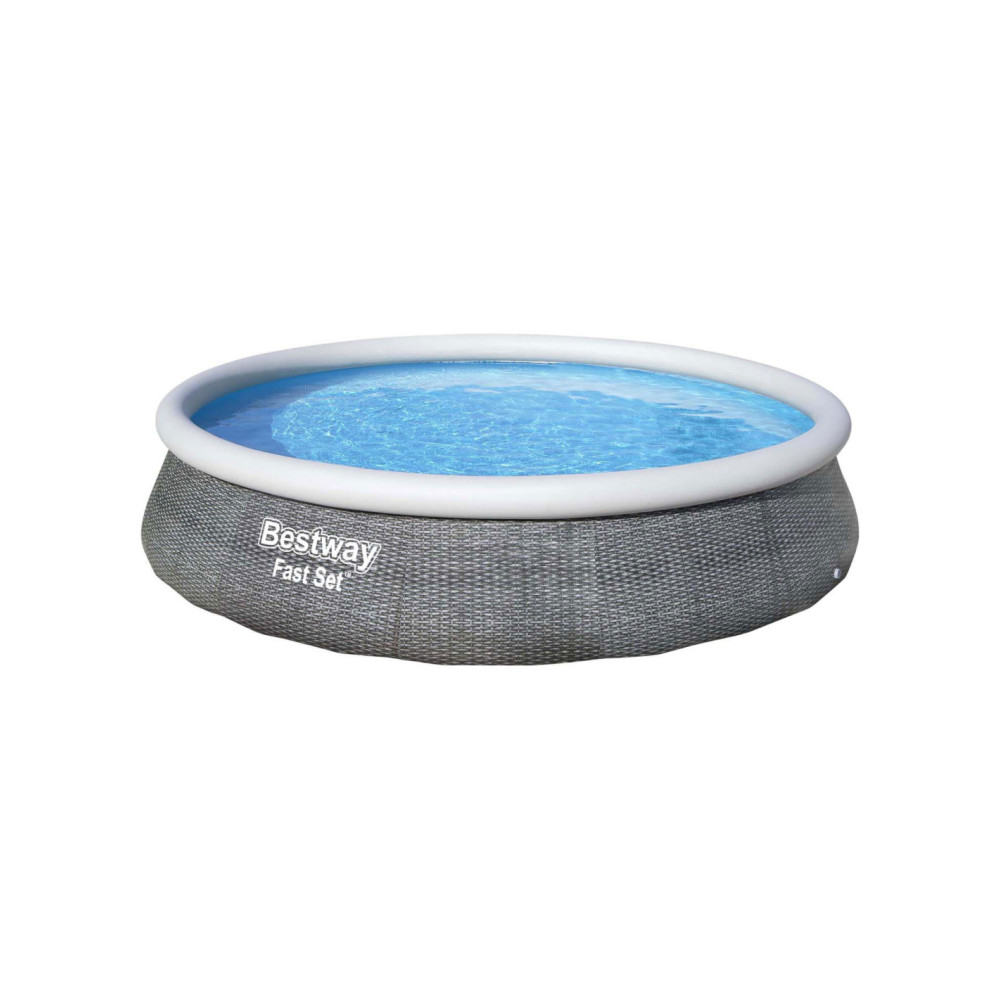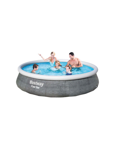 Het vertrouwde zwembad met opblaasrand, maar in een nieuw jasje. Dit zonder gereedschap te plaatsen zwembad heeft een bijzondere look: een rotan print. Gemaakt van Tritech materiaal, dus sterk en duurzaam en voorzien van aftapplug. Vlak stellen, eenvoudig de rand opblazen en dan vullen met water. Wordt geleverd incl. cartridgefilterpomp van 2,0 m³/u. Watercapaciteit: 7,340 ltr. Afmeting: Ø 396x84 cm.