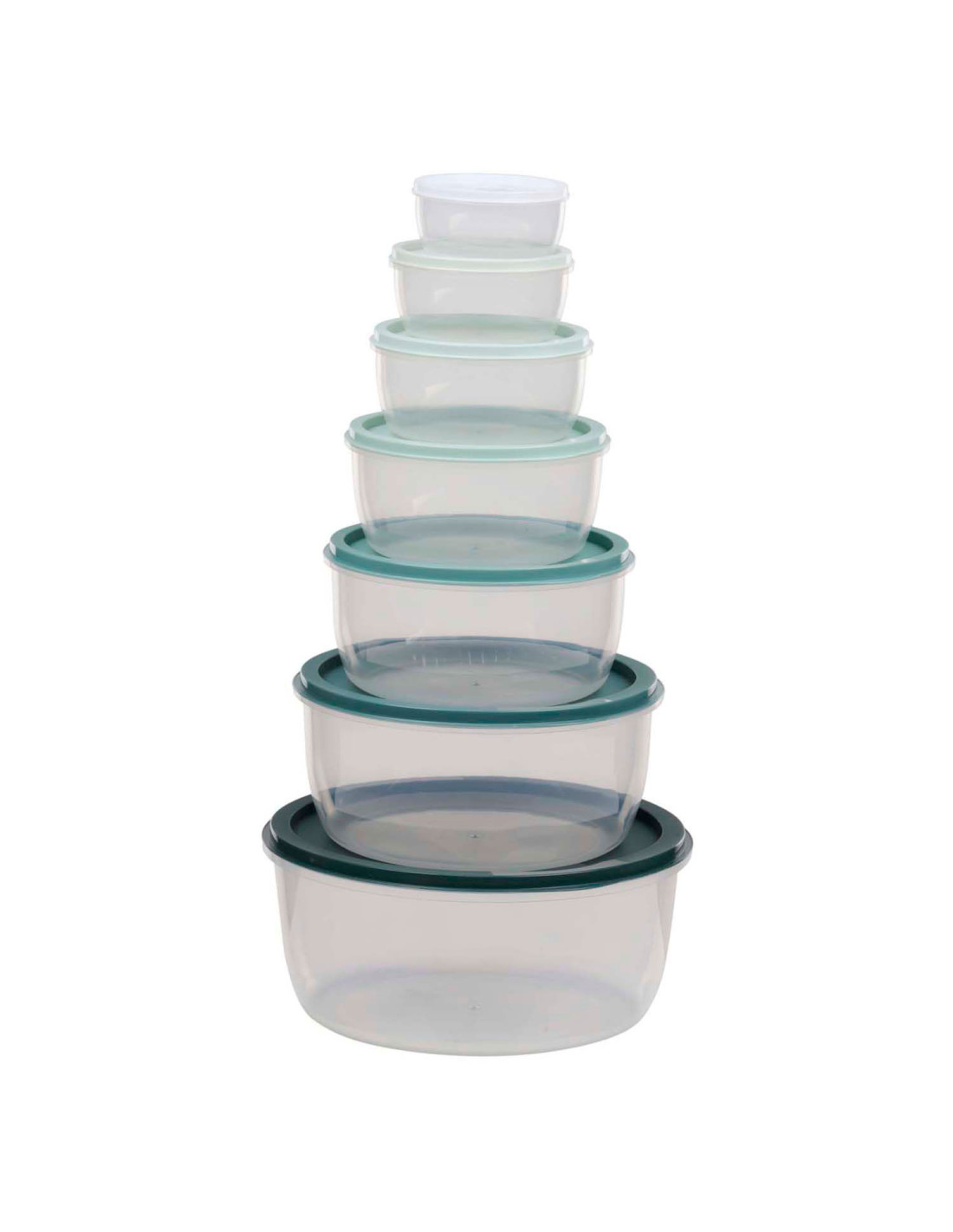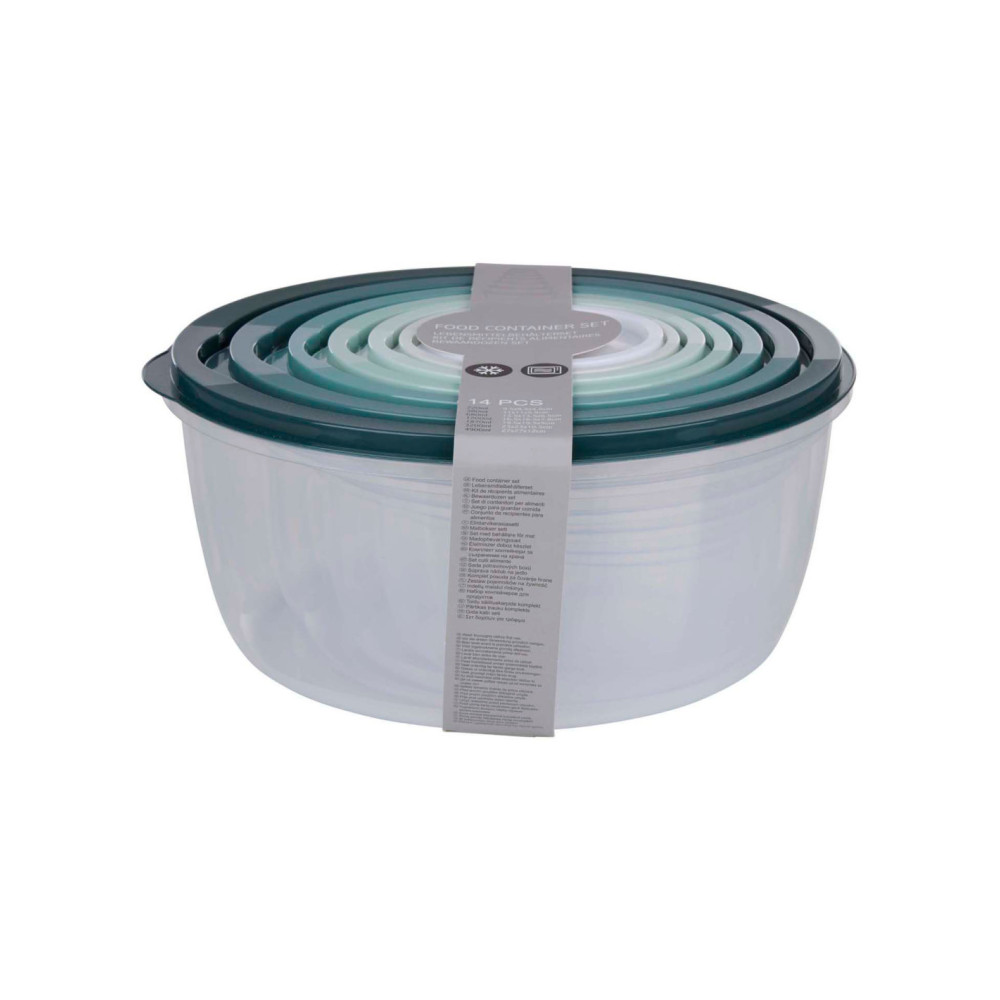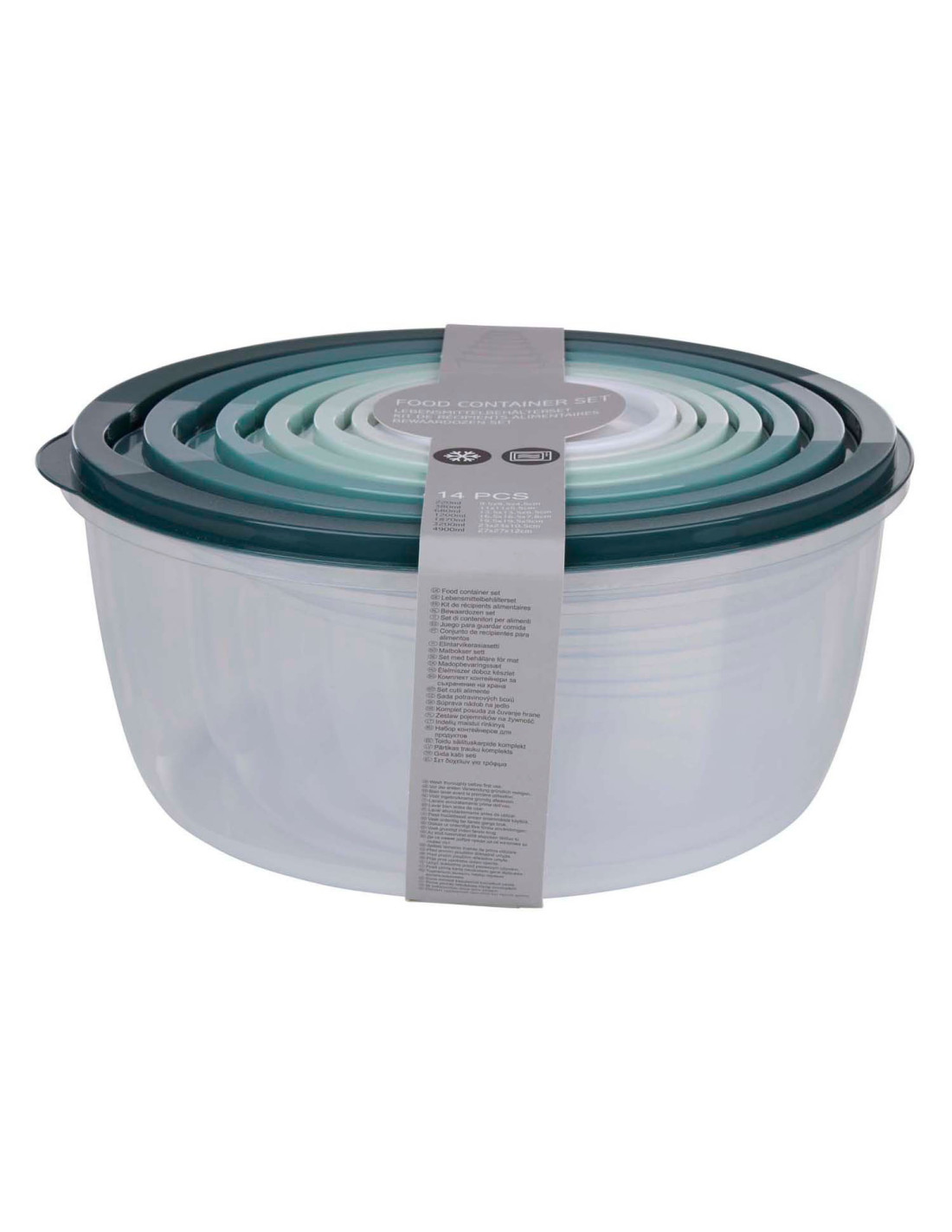 Een veelzijdige set van 14 opbergbakken in diverse kleuren, perfect voor het organiseren van voedsel en andere items. Stapelbaar voor efficiënt ruimtegebruik en beschikbaar in verschillende groottes.
