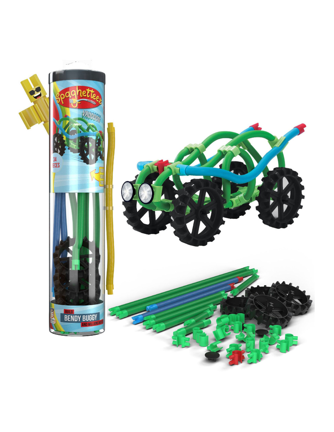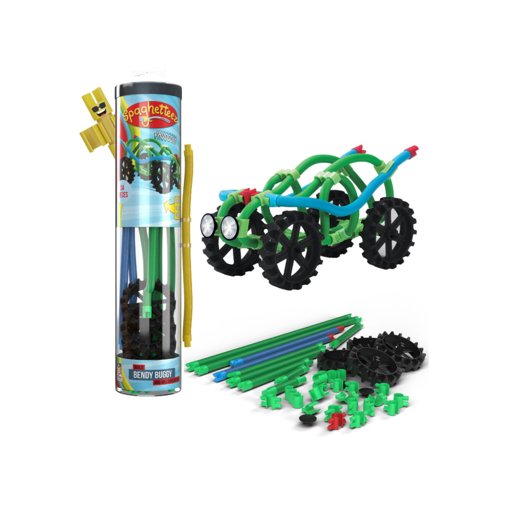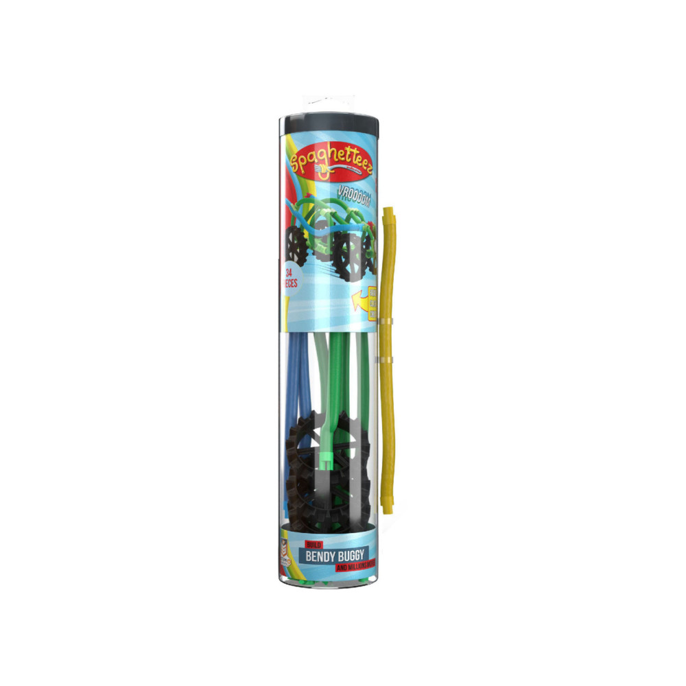 Spaghetteez Bendy Buggy Flexibele Bouwstaafjes. De set bestaat uit 34 onderdelen en stickers. Geschikt voor kinderen vanaf 5 jaar.
