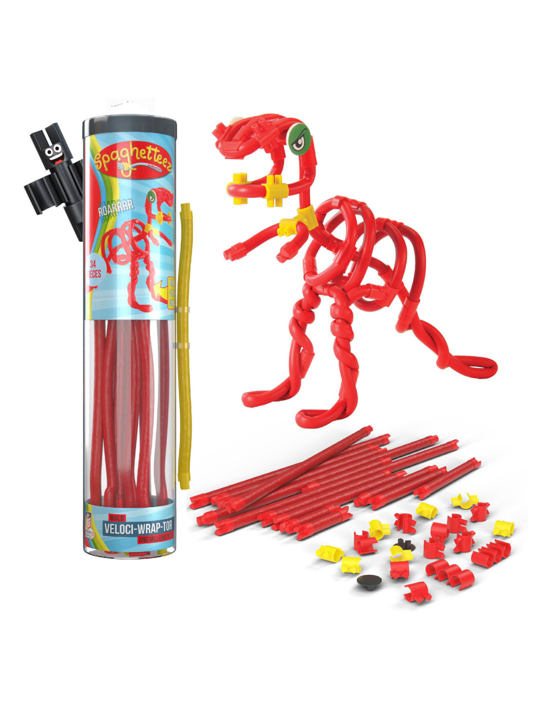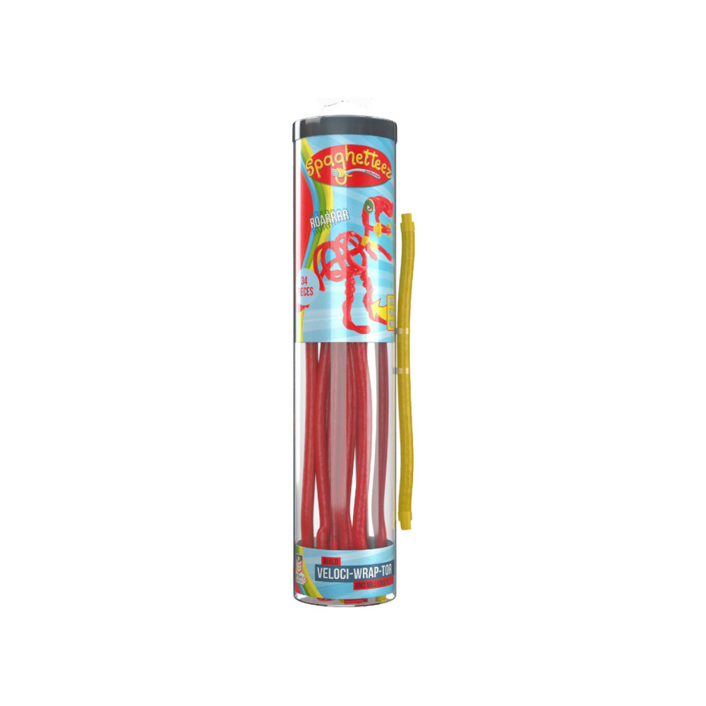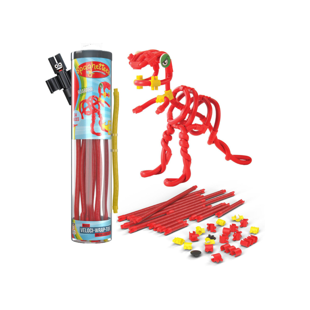 Velociraptor-set van Spaghetteez. Bestaat uit 34 onderdelen. Geschikt voor kinderen vanaf 5 jaar.