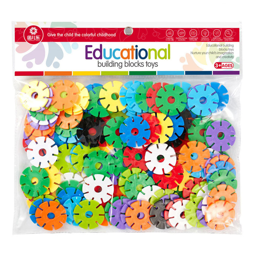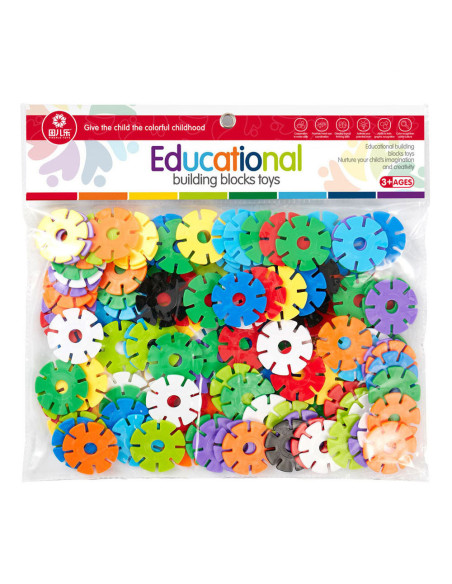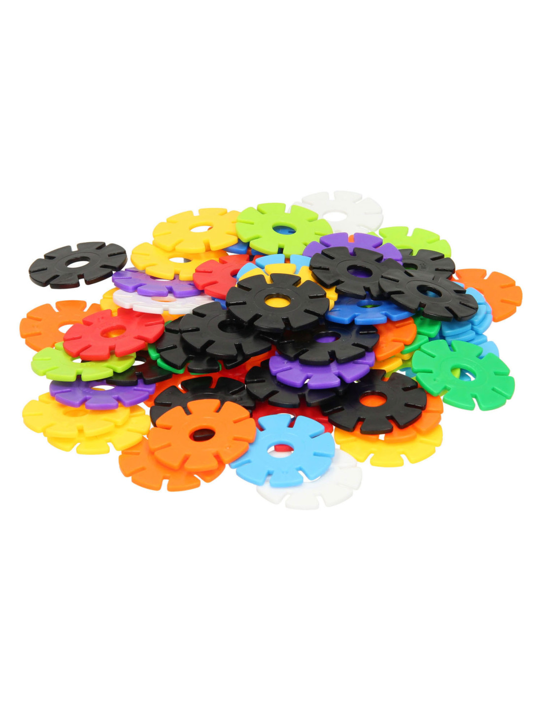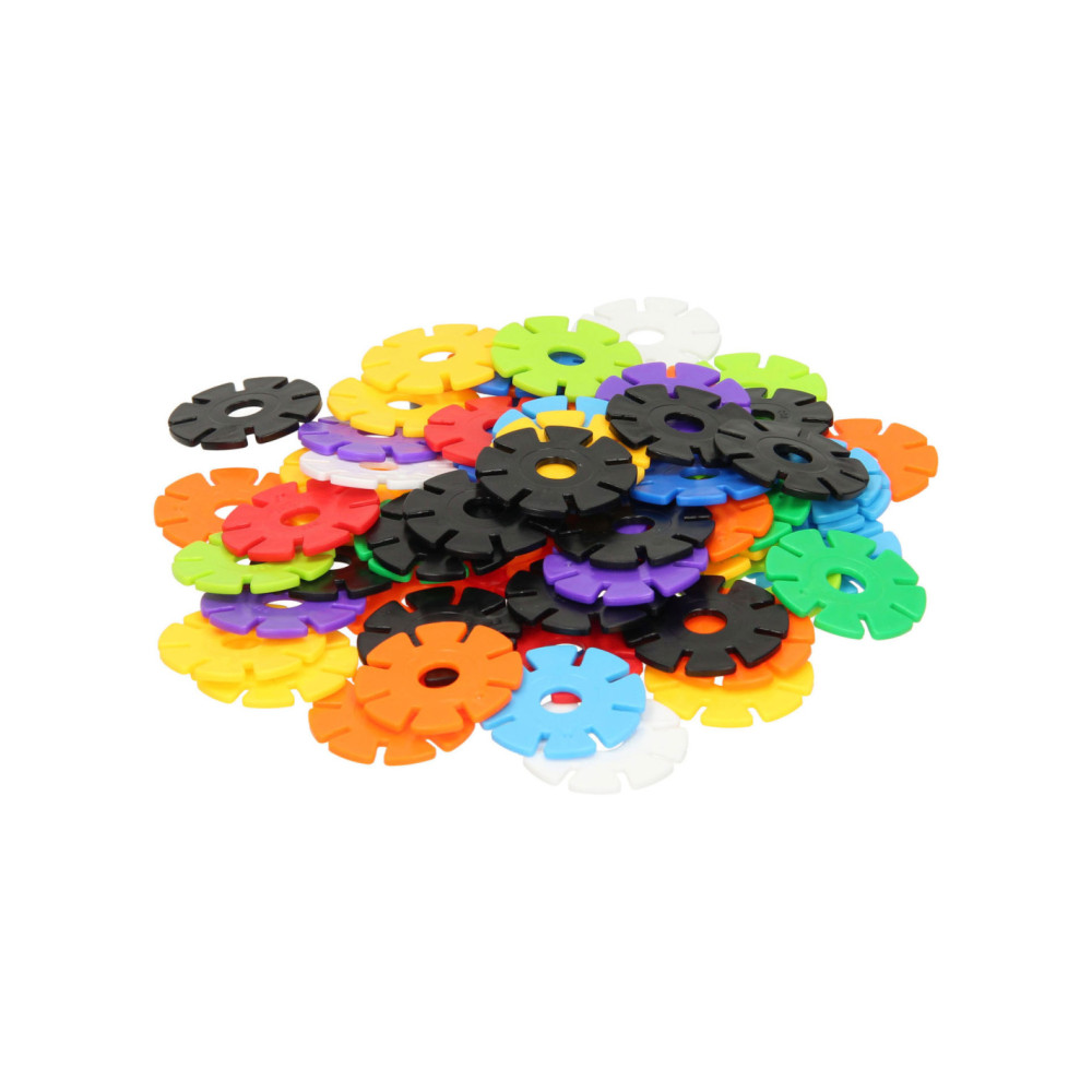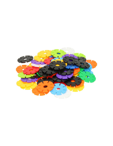 Set van 140 kunststof bouwschijfjes (4,5cm) met inkepingen rondom. Inclusief voorbeelden. Geschikt vanaf 3 jaar.