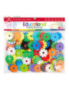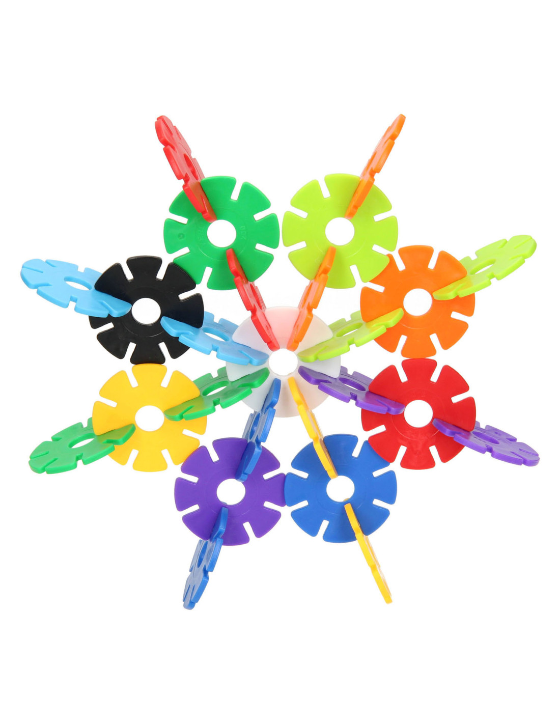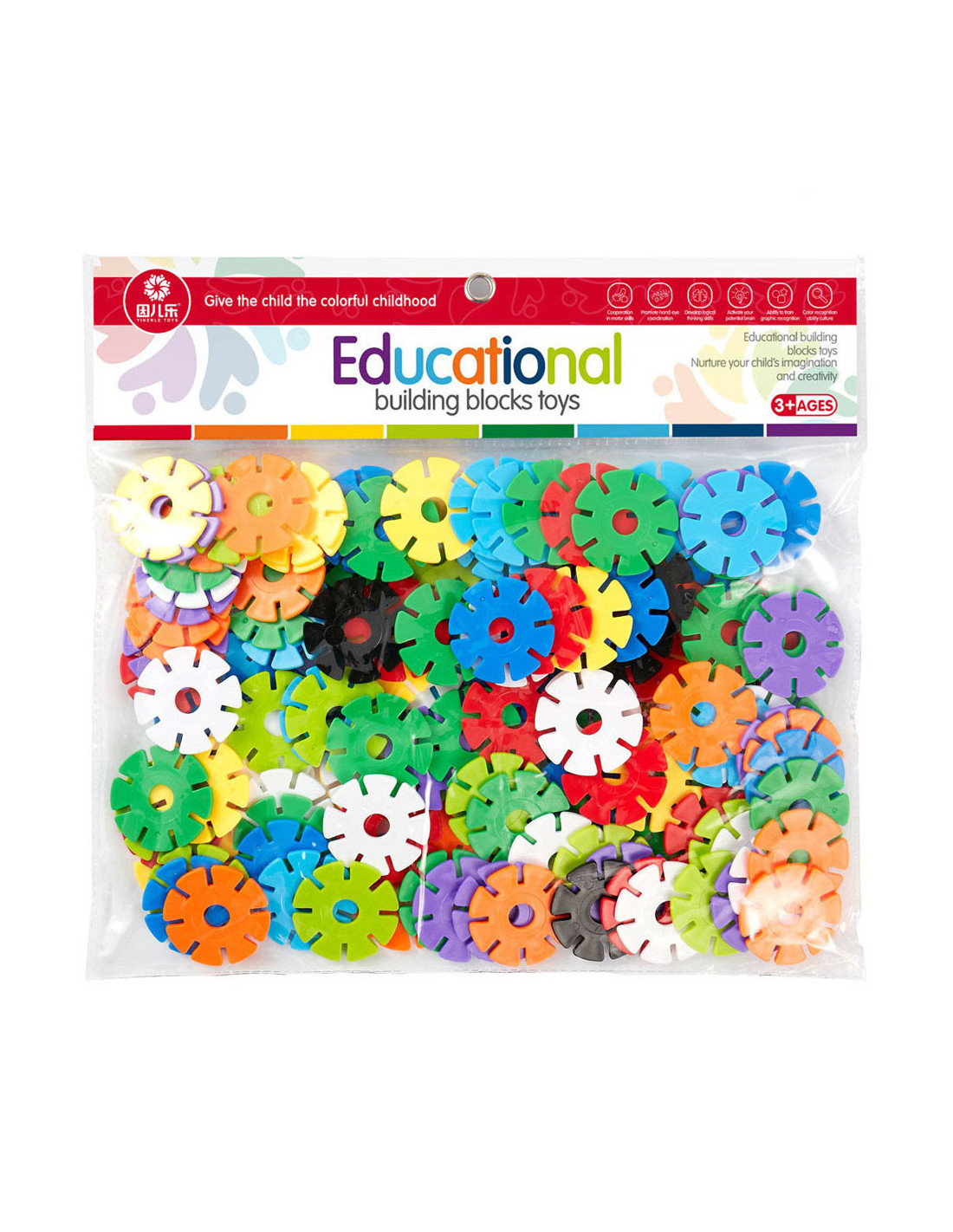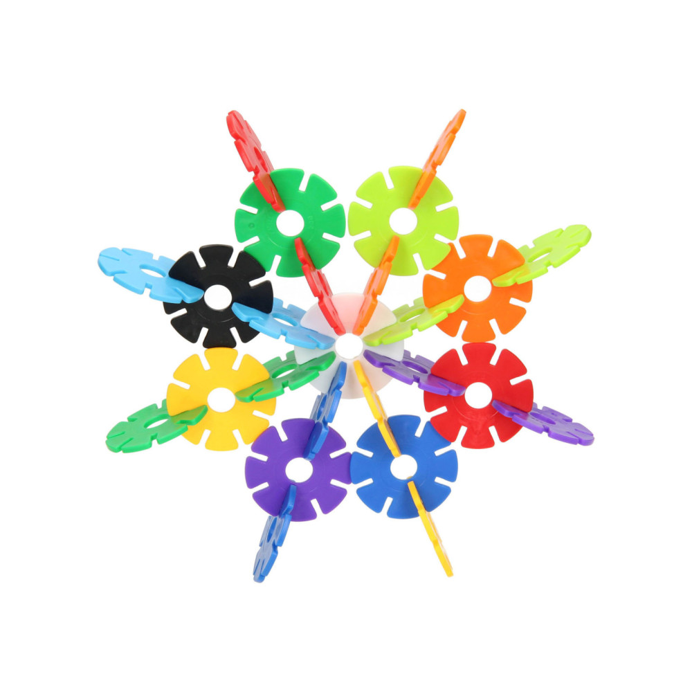 Set van 140 kunststof bouwschijfjes (4,5cm) met inkepingen rondom. Inclusief voorbeelden. Geschikt vanaf 3 jaar.