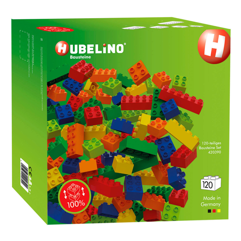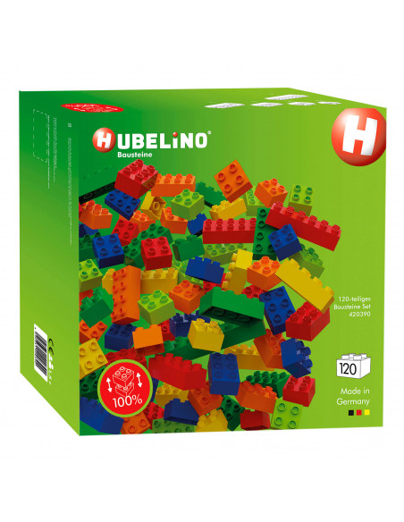 De bouwsteenset van Hubelino bevat 120 bouwstenen in verschillende maten en in de kleuren rood, blauw, groen, geel, oranje en lichtgroen. Eindeloos bouwplezier voor kinderen vanaf 1,5 jaar. De bouwstenen worden uitsluitend in Duitsland geproduceerd en zijn 100% compatibel met populaire bouwbloksystemen van andere fabrikanten.