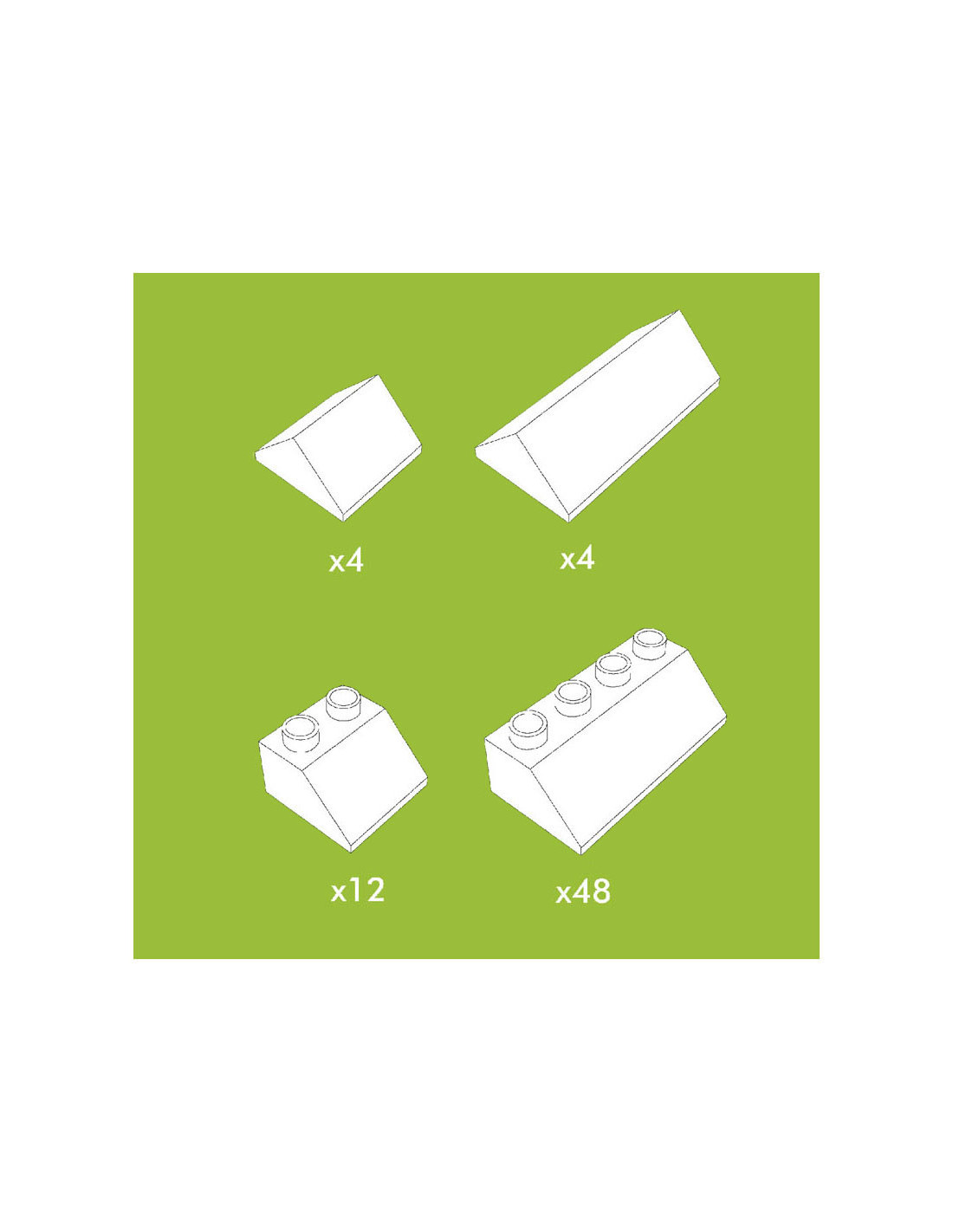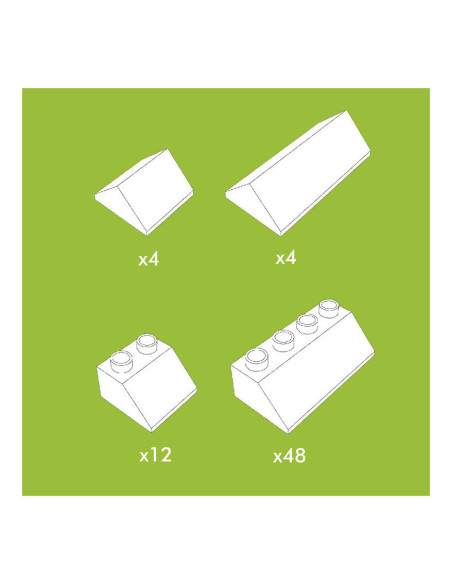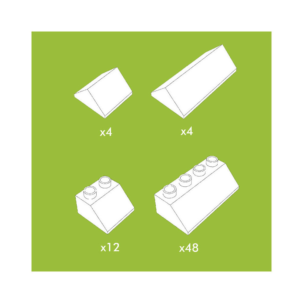 Inhoud: 68 stuks (48 2×4 dakstenen, 12 2×2 dakstenen, 4 2×4 nokstenen en 4 2×2 nokstenen)