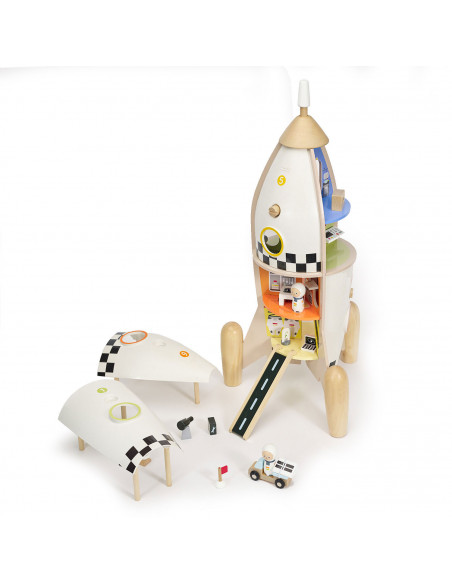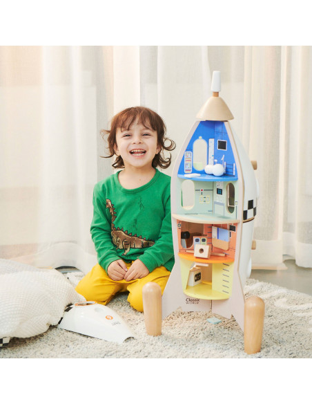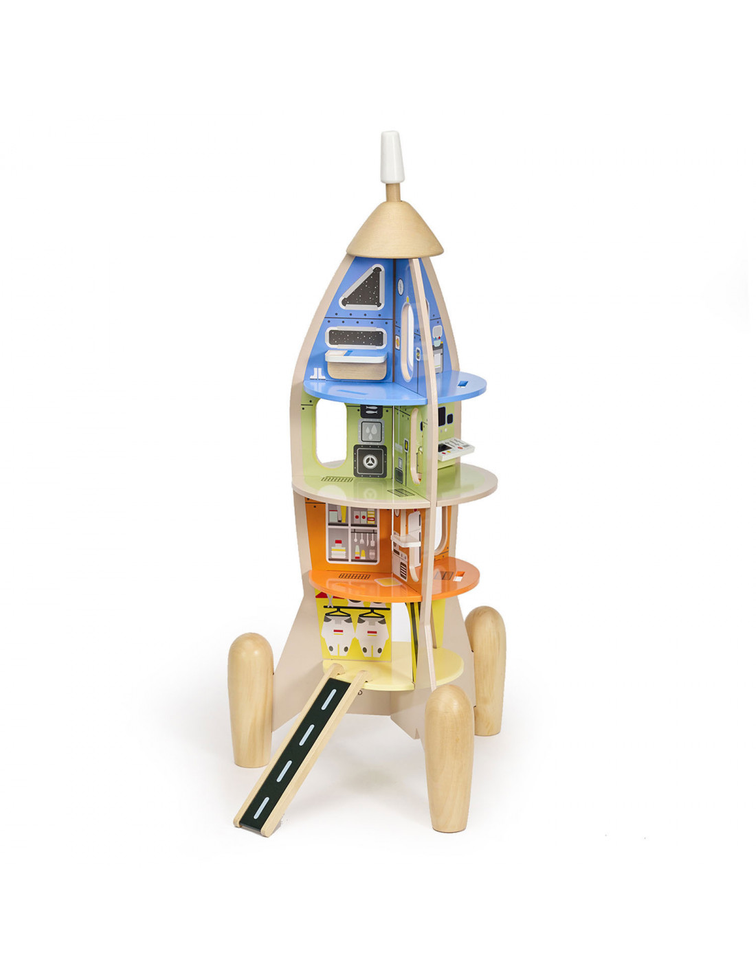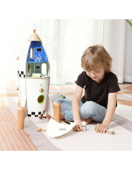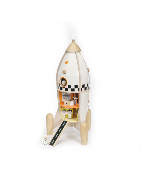 Delen van de buitenkant van de raket kun je los maken en dan zie je allerlei verschillende kamers binnenin de raket.