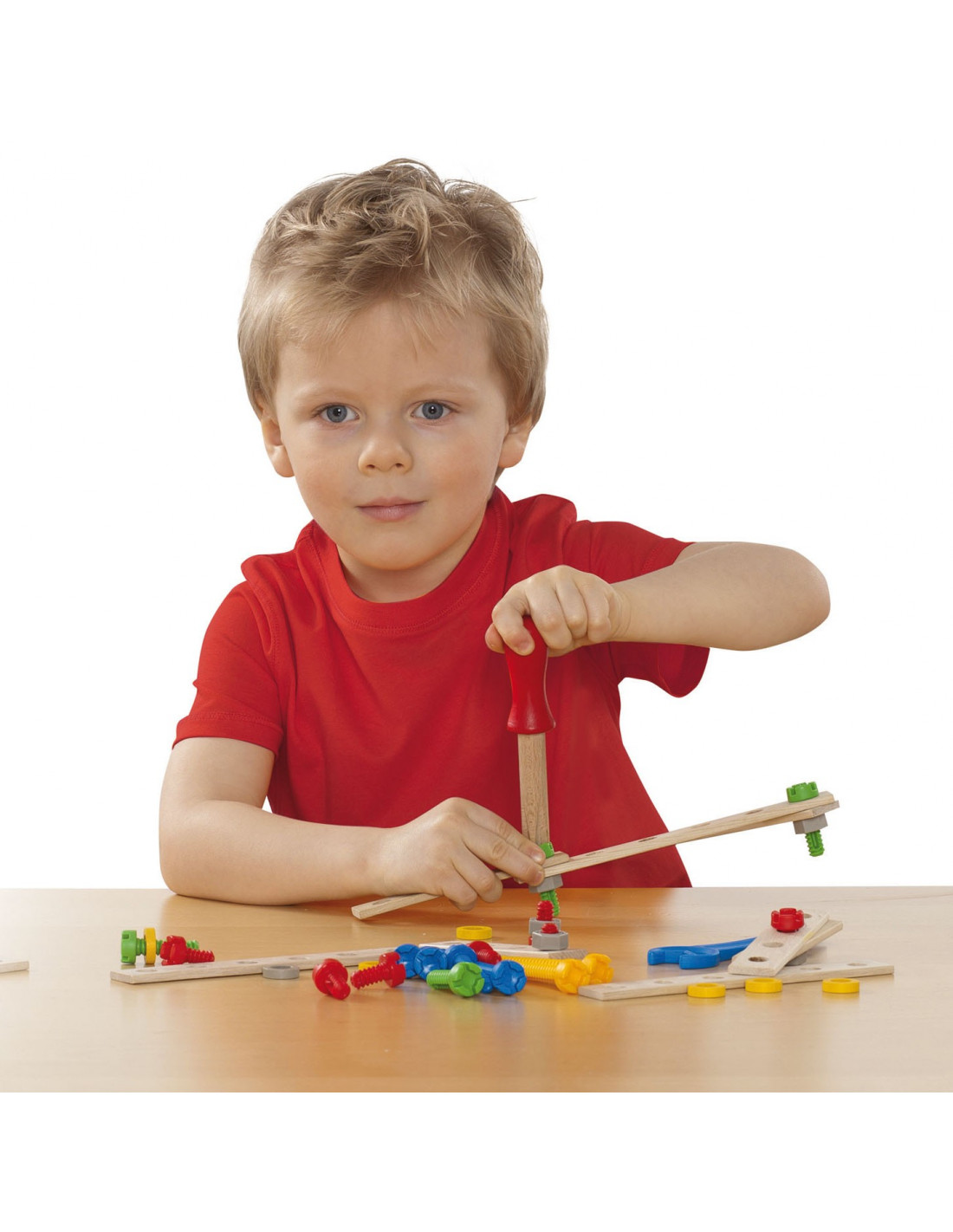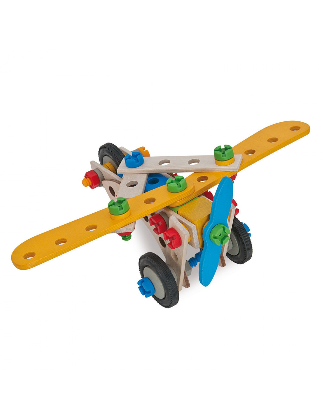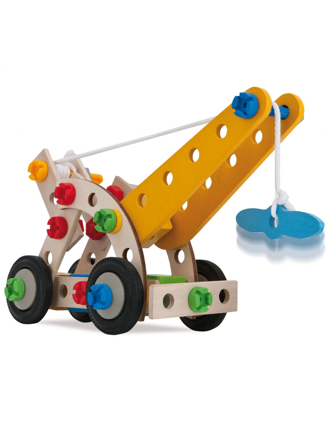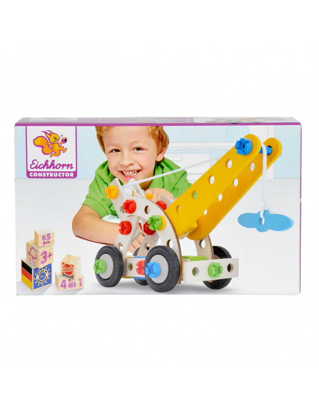 Maak je eigen voertuigen met deze 4in1 constructieset van Eichhhorn. Monteer de 65 vrolijk gekleurde onderdelen van zowel hout als stevig kunststof aan elkaar en creëer een takelwagen, een helikopter, een motor en een helikopter. Bevestig de propeller of de takel en laat je fantasie de vrije loop! Spelen met de Eichhorn constructor set stimuleert de ontwikkeling van fantasie en de fijne motoriek.