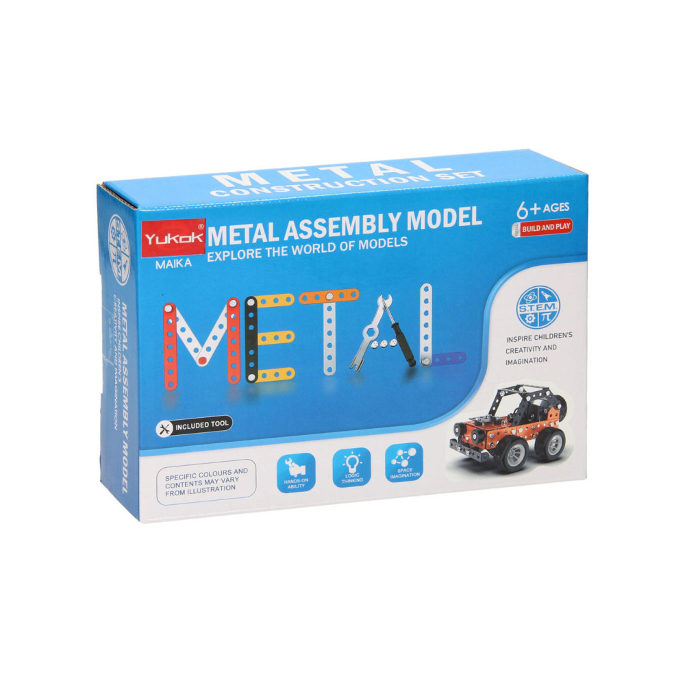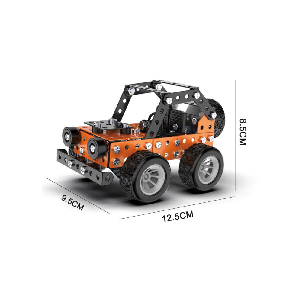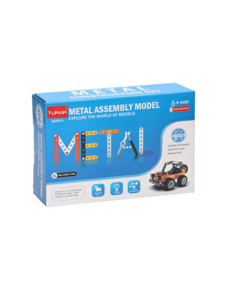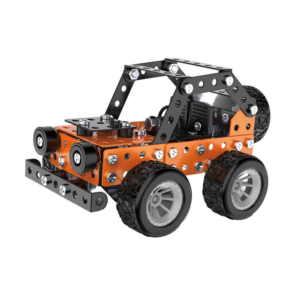 Bouw jouw eigen coole metalen terreinwagen met profielbanden! Dit bouwpakket bestaat uit 164 onderdelen om zelf met schroeven een oranje of blauwe terreinwagen in elkaar te zetten. Een leuke en uitdagende S.T.E.M.-activiteit voor kinderen vanaf 8 jaar oud. In elkaar gezet is de wagen 9,5 x 12,5 x 8,5 centimeter groot. Handleiding en gereedschap zijn inbegrepen.