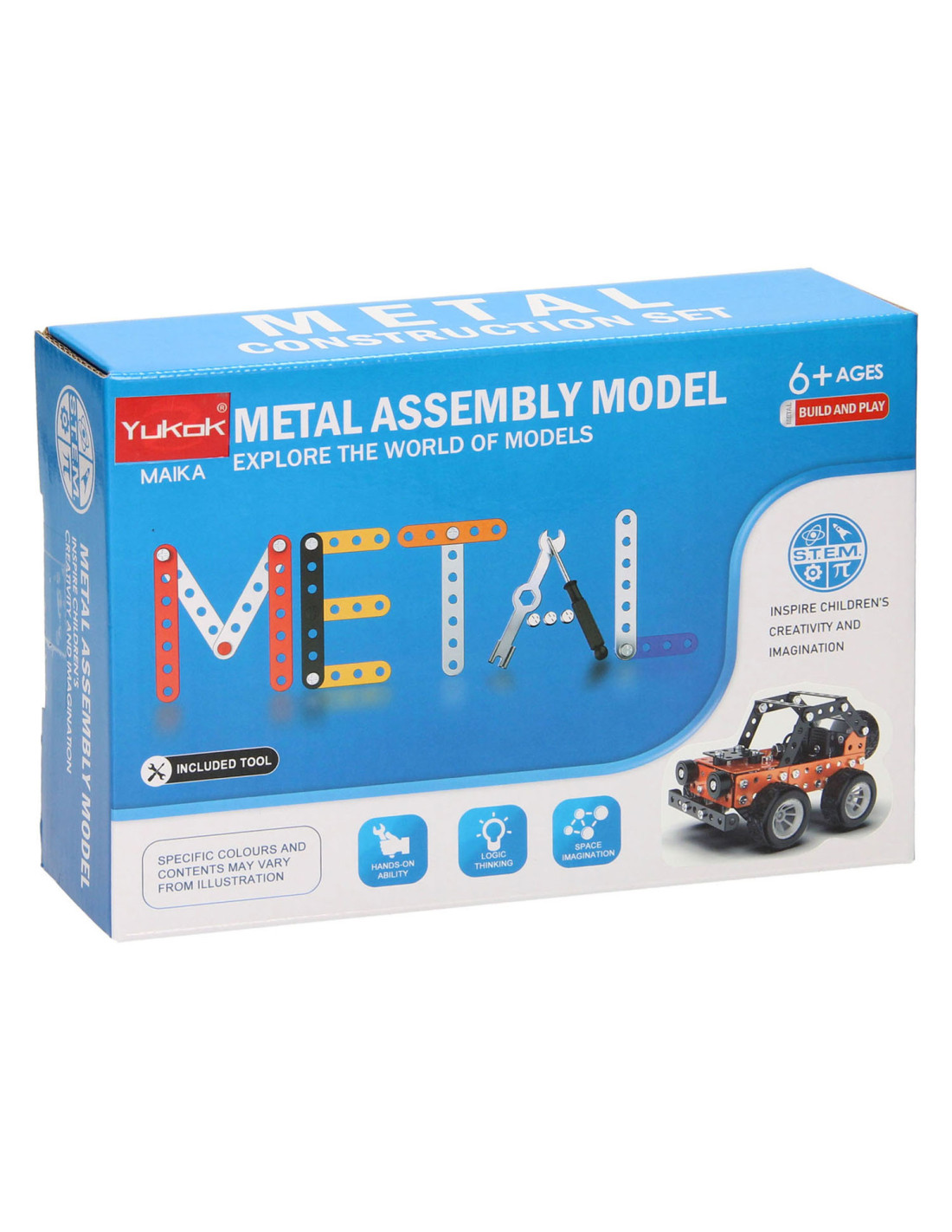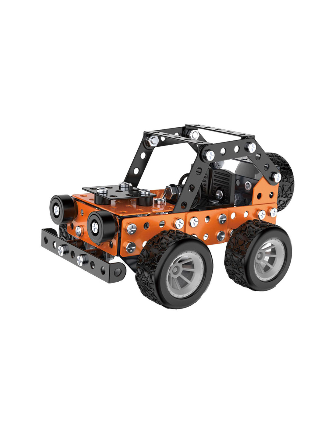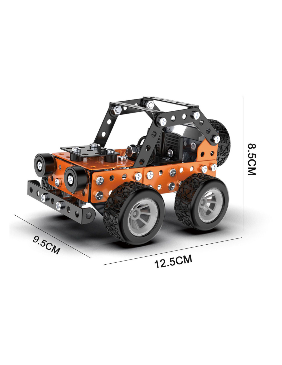 Bouw jouw eigen coole metalen terreinwagen met profielbanden! Dit bouwpakket bestaat uit 164 onderdelen om zelf met schroeven een oranje of blauwe terreinwagen in elkaar te zetten. Een leuke en uitdagende S.T.E.M.-activiteit voor kinderen vanaf 8 jaar oud. In elkaar gezet is de wagen 9,5 x 12,5 x 8,5 centimeter groot. Handleiding en gereedschap zijn inbegrepen.
