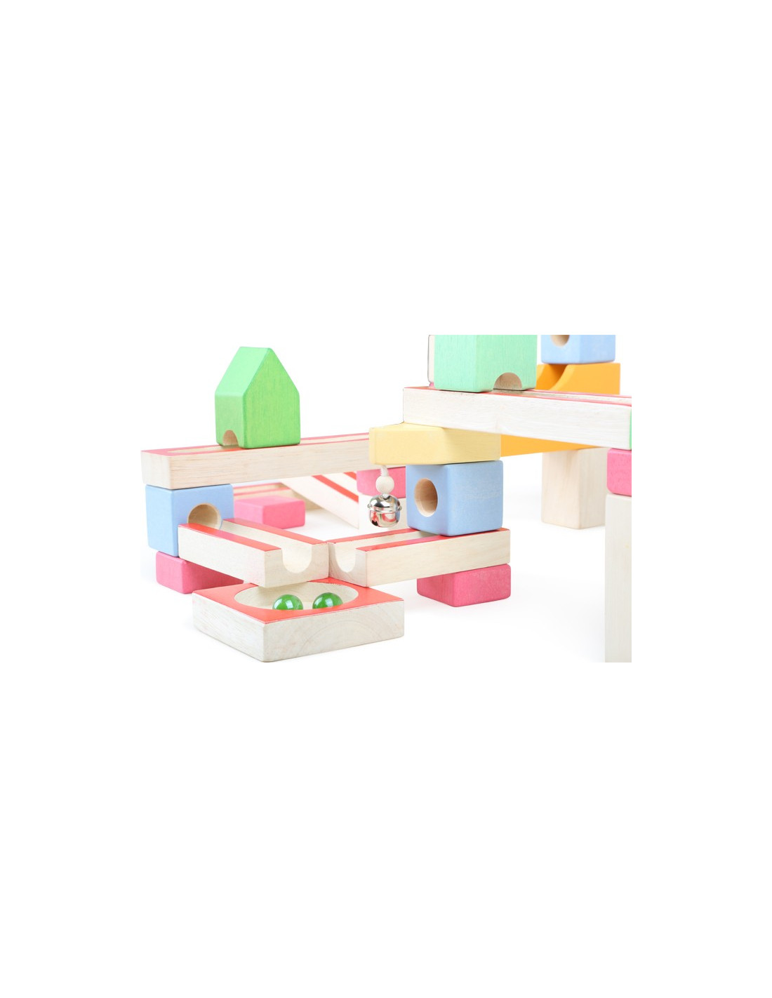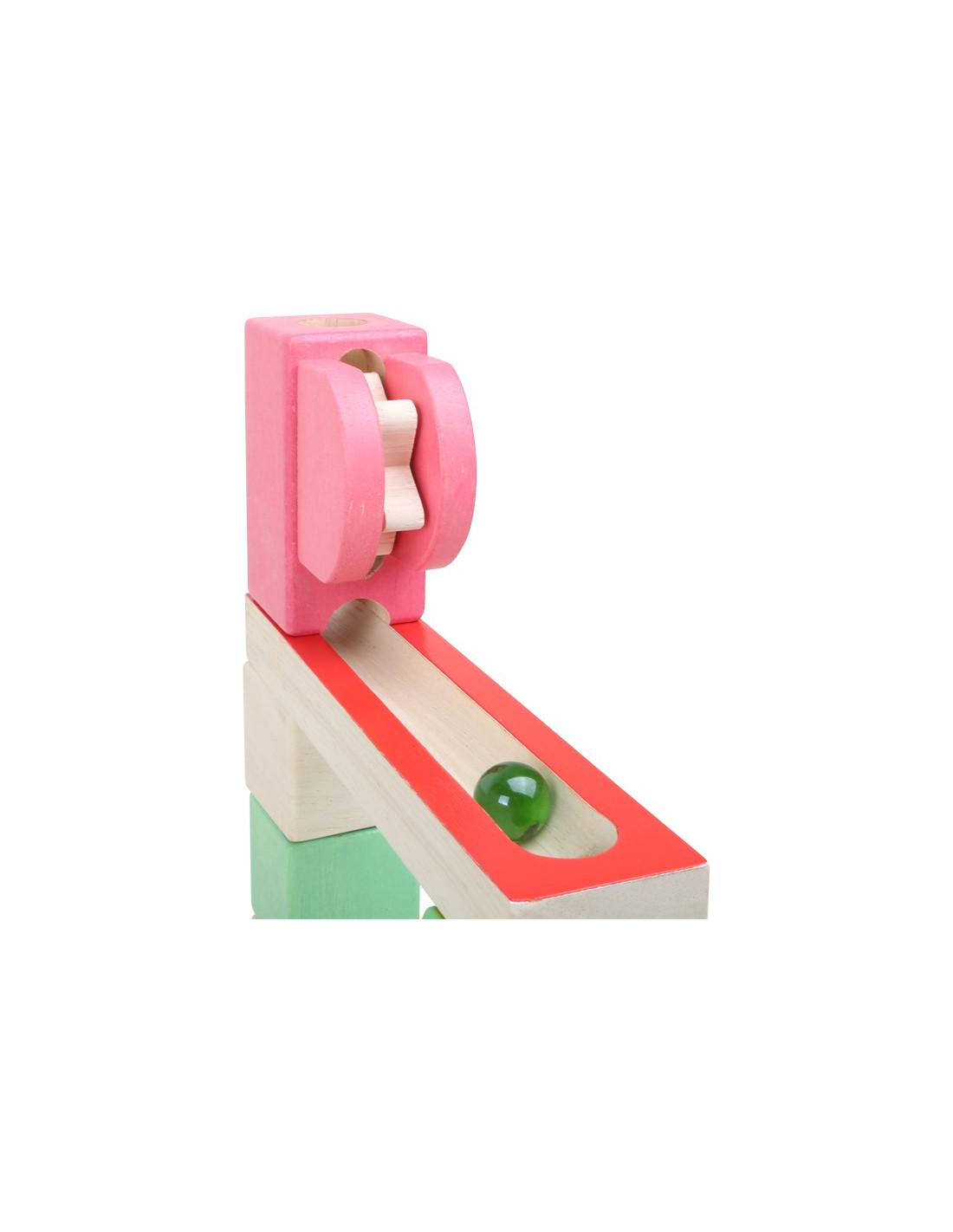 Door houten blokken van diverse afmetingen kunnen torens van uiteenlopende hoogtes worden gestapeld. Door de gaten in de bouwblokken kunnen de knikkers op gang worden gebracht en gaan ze met pijlsnelle manoeuvres door de ingekerfde houten banen.