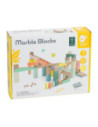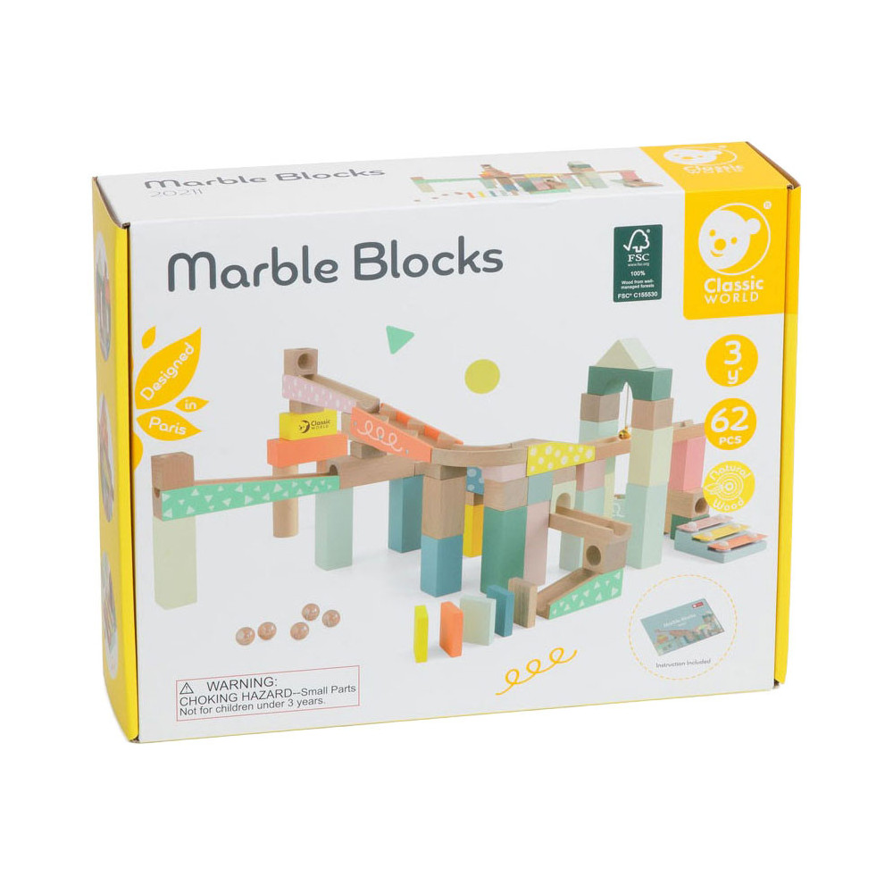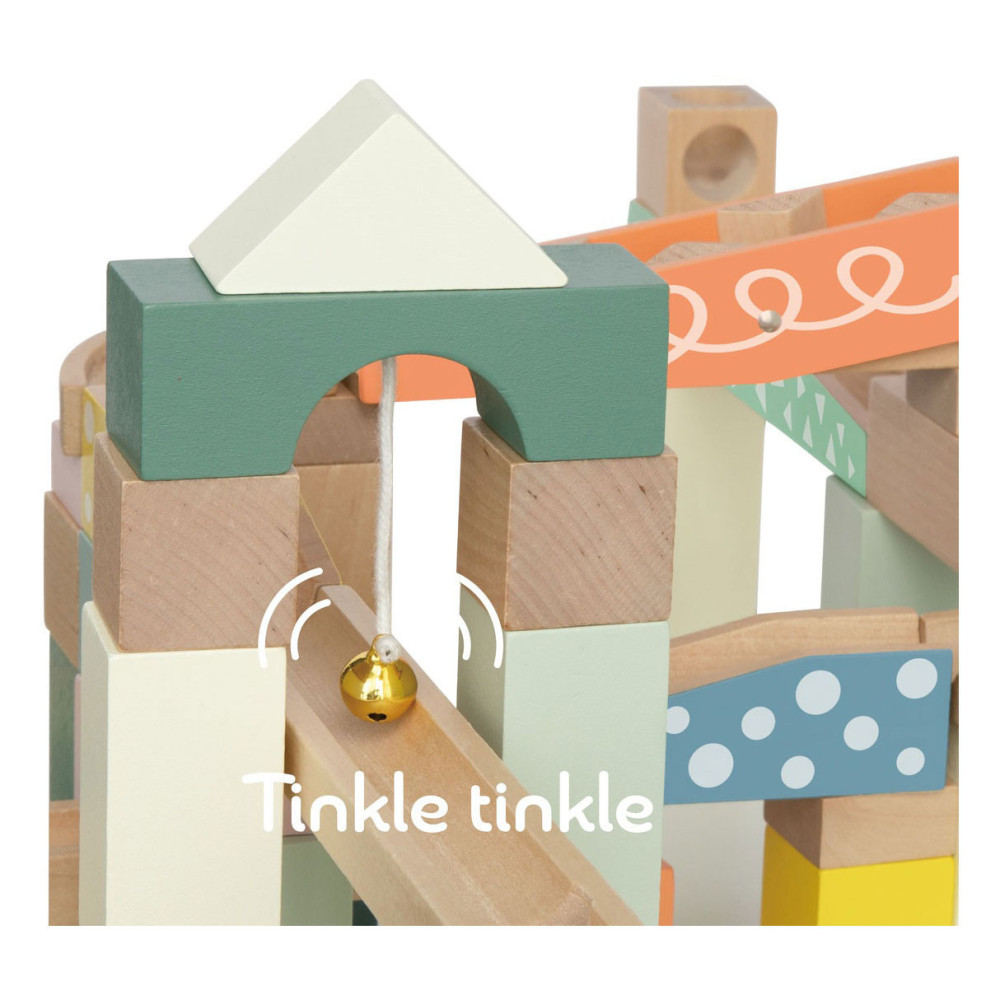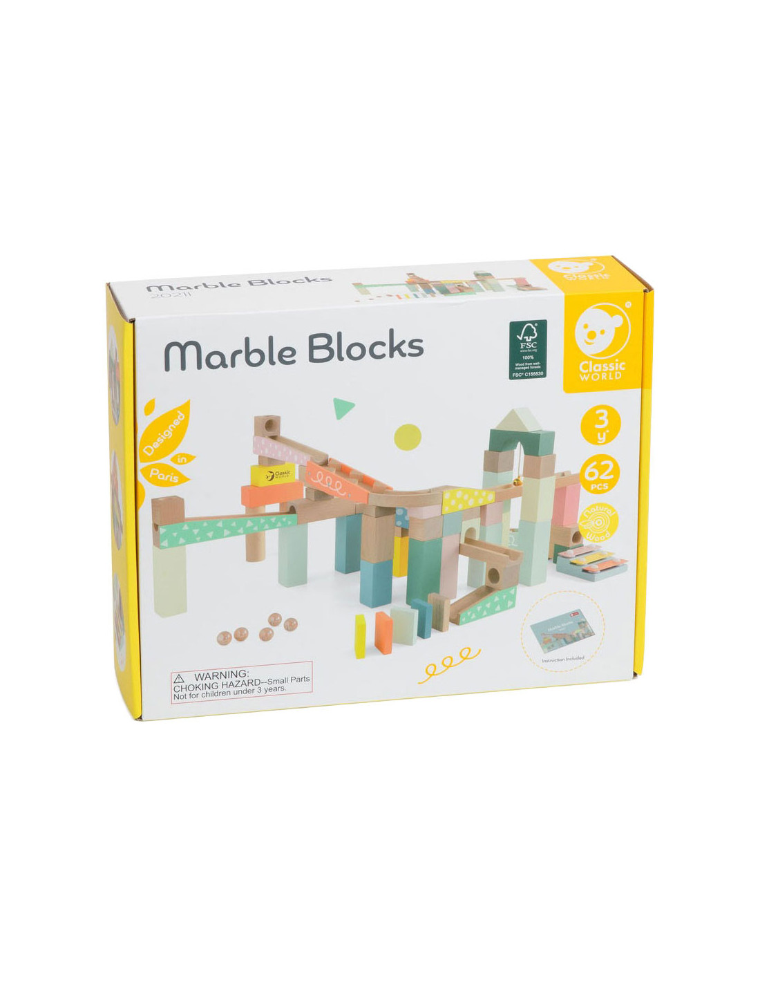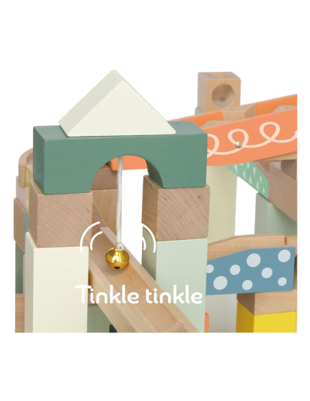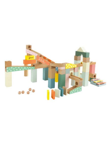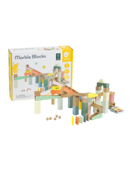 Gekleurde. houten blokken waarmee een uitgebreide knikkerbaan gemaakt kan worden. De blokken stimuleren het creatieve denkvermogen, concentratie en de hand-oog-coördinatie. De doos bevat 62 items, inclusief knikkers. De set is geschikt voor kinderen vanaf 3 jaar.