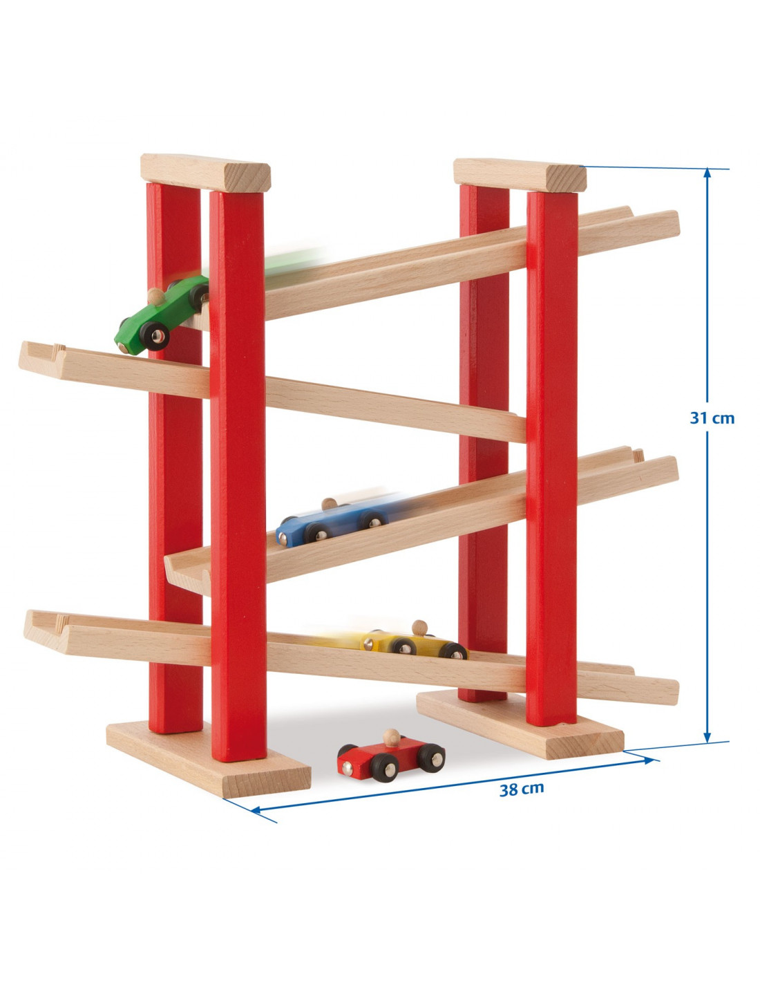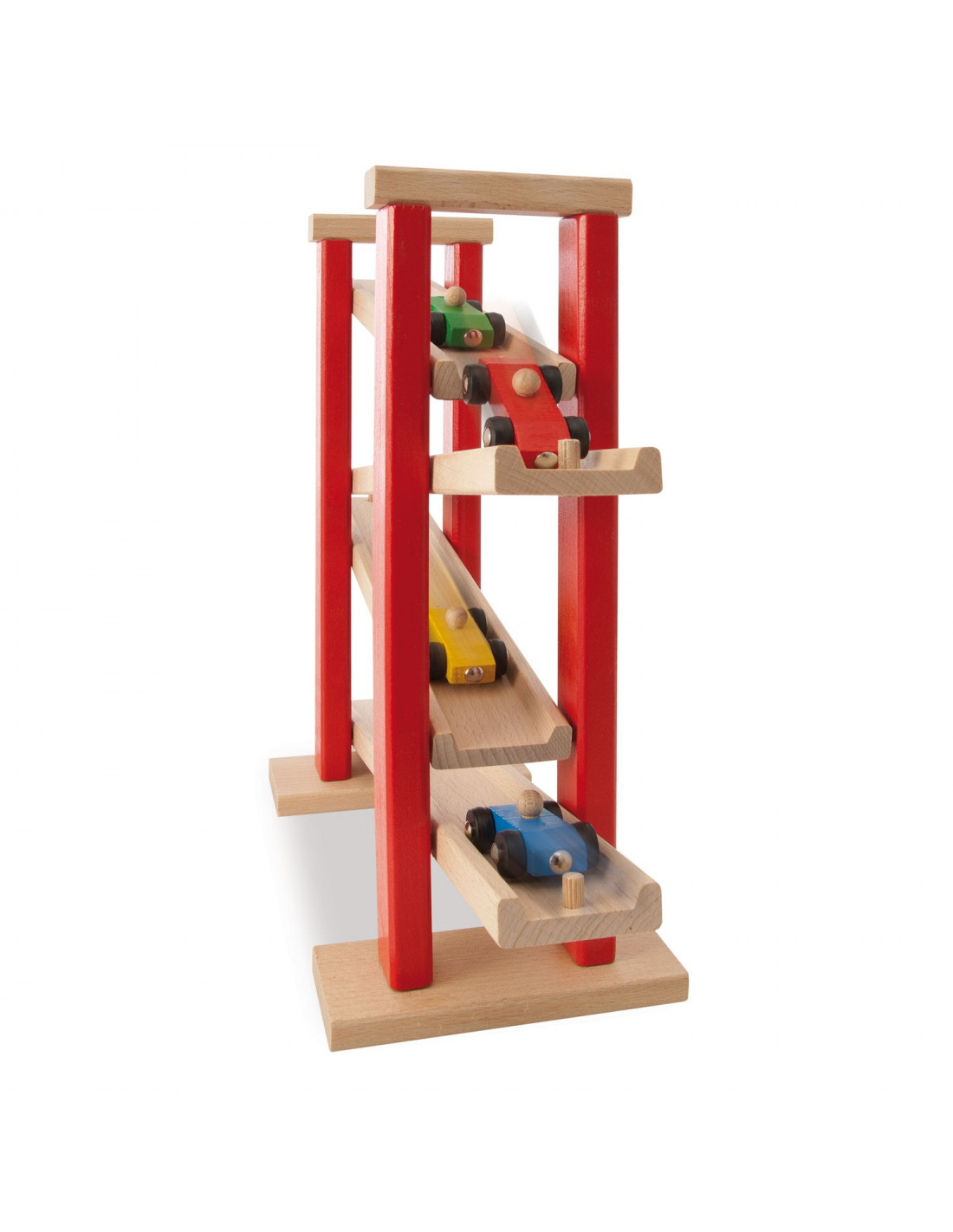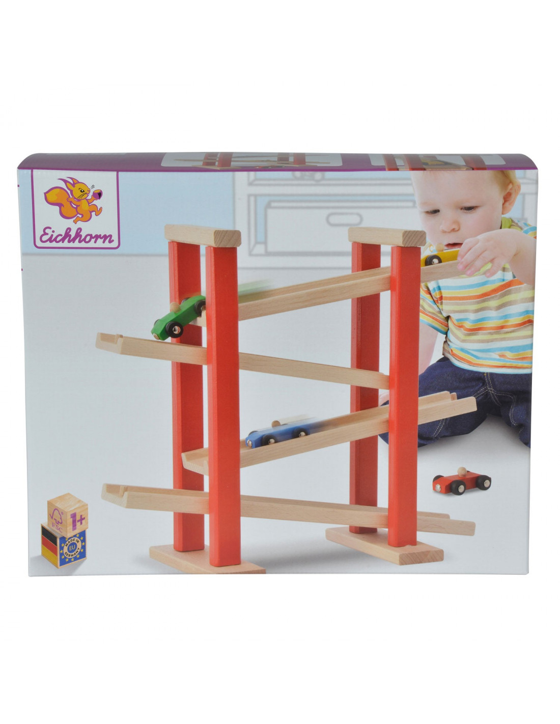 Laat je auto’s zo snel mogelijk naar beneden rijden van deze houten autobaan van Eichhorn. De autobaan heeft 4 diagonale banen en bevat 3 kleine autootjes. Spelen met de Eichhorn autobaan stimuleert oog-handcoördinatie en geeft inzicht in oorzaak-gevolgrelaties.