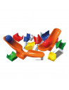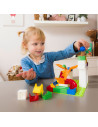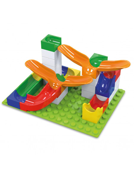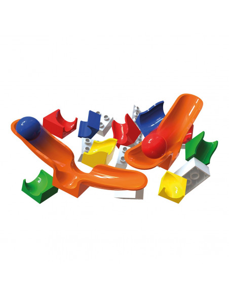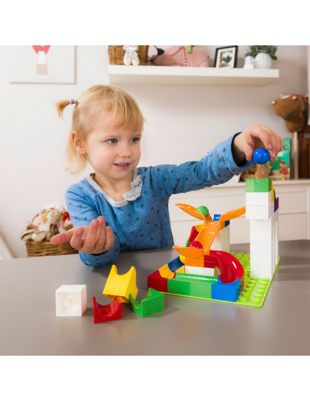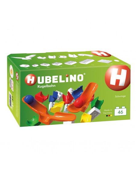 Wil je nog meer snelheid? Daag de bouwmeester in jou dan eens uit met de nieuwe slingergoot-set van Hubelino! Met zijn fraaie slingertechniek biedt deze set jou spannende en onvoorspelbare mogelijkheden: rolt je knikker naar de volgende goot of neemt hij onverwacht een andere wending?Met de twee slingergoten van deze set kan de knikker vier verschillende richtingen opgaan. En net als alle Hubelino-producten kan ook deze 46-delige set met alle andere bouwelementen van Hubelino gecombineerd worden. Plaats de slingergoten in je bouwwerk en creëer een onvoorspelbaar en nog spannender knikkerlabyrint! De set bevat 2 slingergooten, 16 baanelementen, 25 constructiebouwstenen, 1 grondplaat en 2 knikkers.