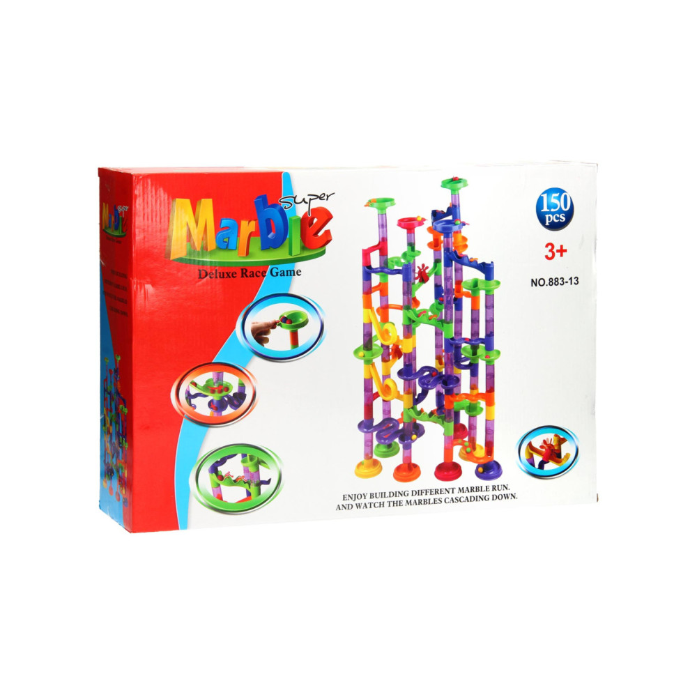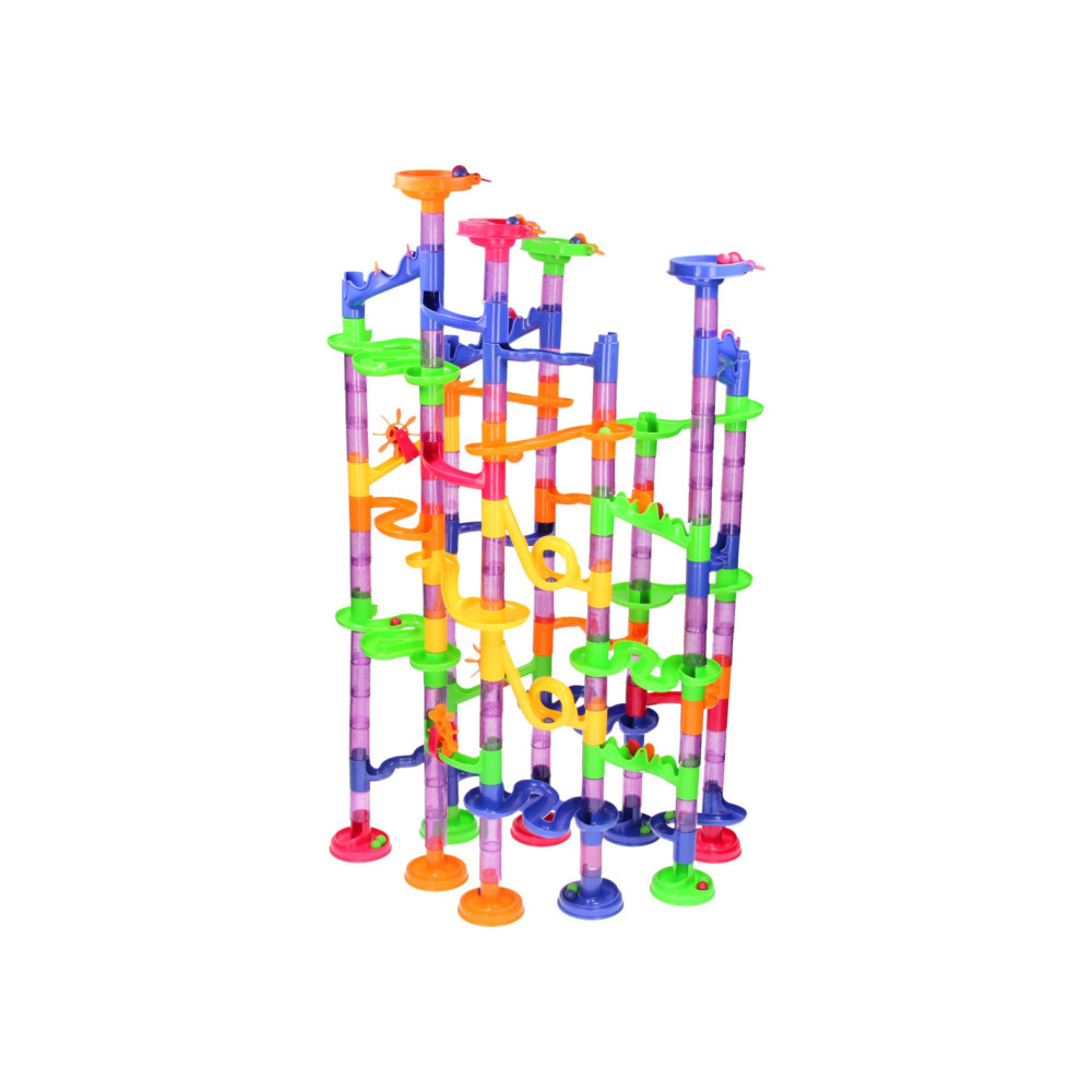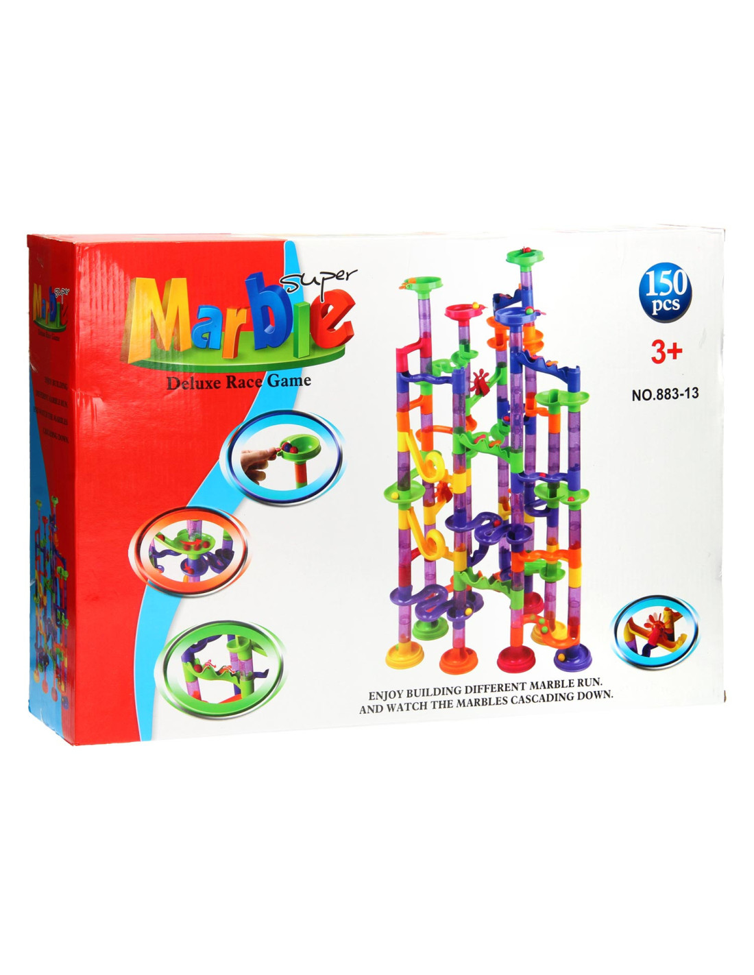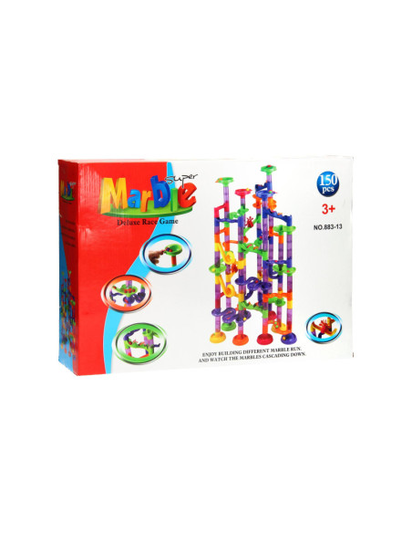 Maak een spectaculaire knikkerbaan met deze megaset. Bouw de spannende baan van het voorbeeld na of laat je fantasie de vrije loop en creëer je eigen ontwerp. Met de 150 verschillende onderdelen creëer je eindeloos veel verschillende banen. Onderdelen zoals snelle spiralen, loopings, ratelende bochten en transparante glitterbuizen maken van elke baan een avontuur. De megaset is gemaakt van stevig kunststof. Inclusief geïllustreerde instructies en knikkers.