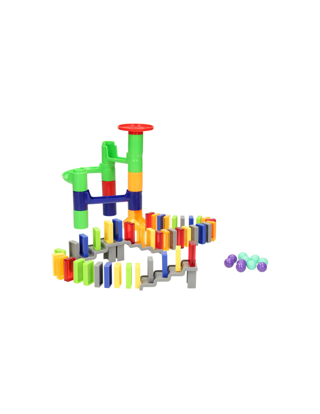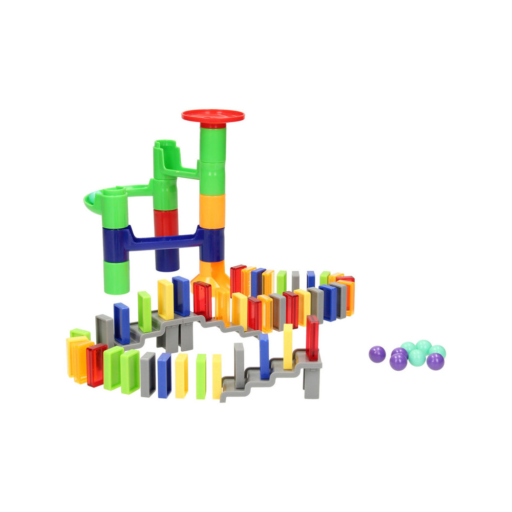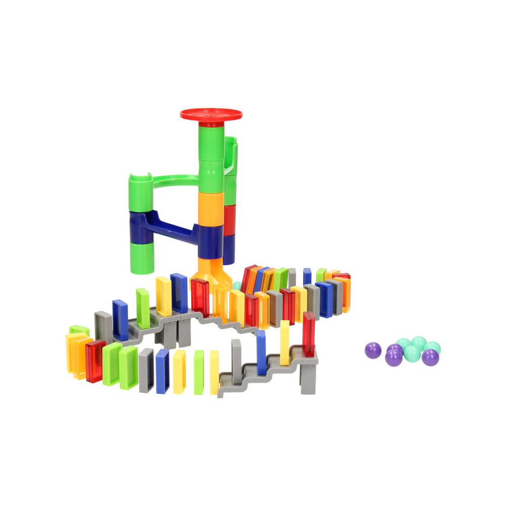 66-delige knikkerbaan met dominostenen. Met verschillende trapetjes, transparante dominostenen en 8 balletjes.