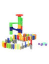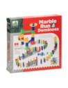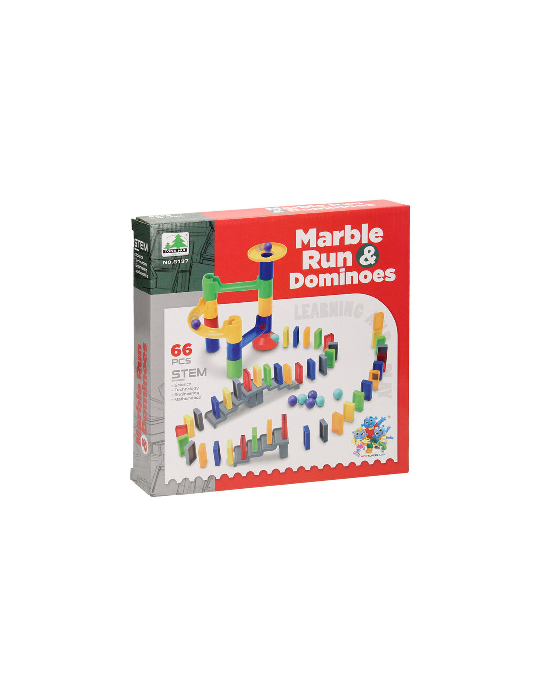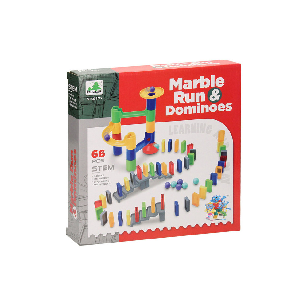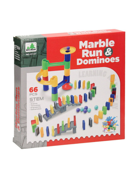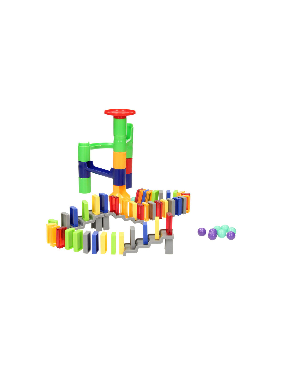 66-delige knikkerbaan met dominostenen. Met verschillende trapetjes, transparante dominostenen en 8 balletjes.