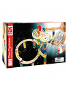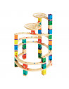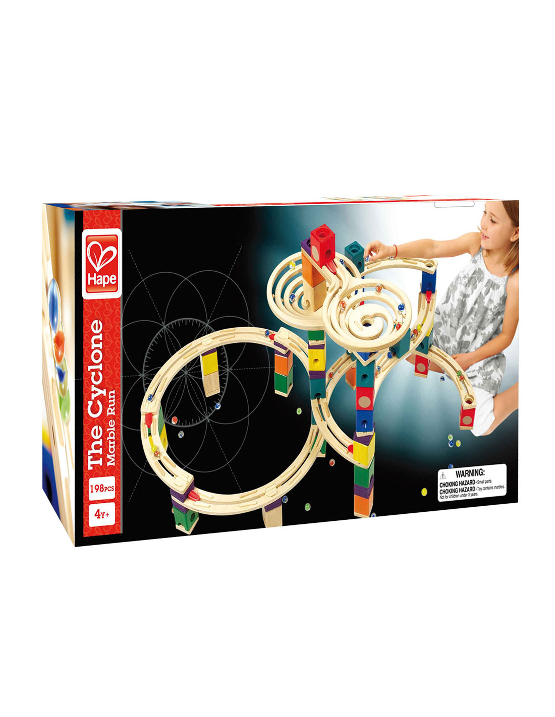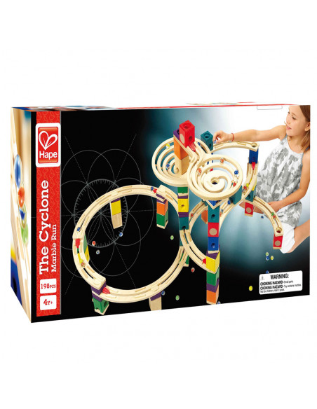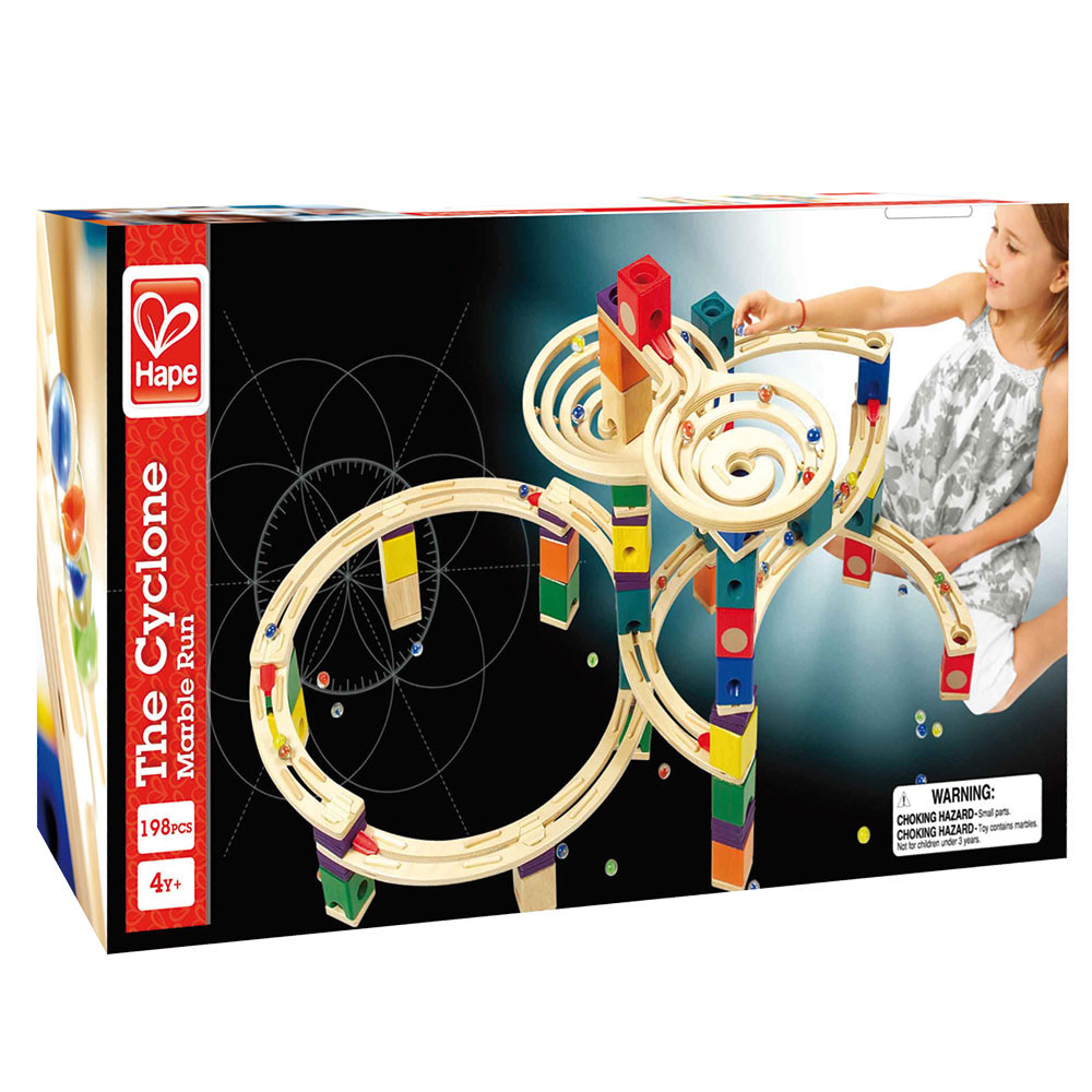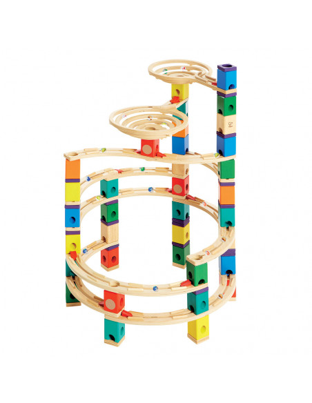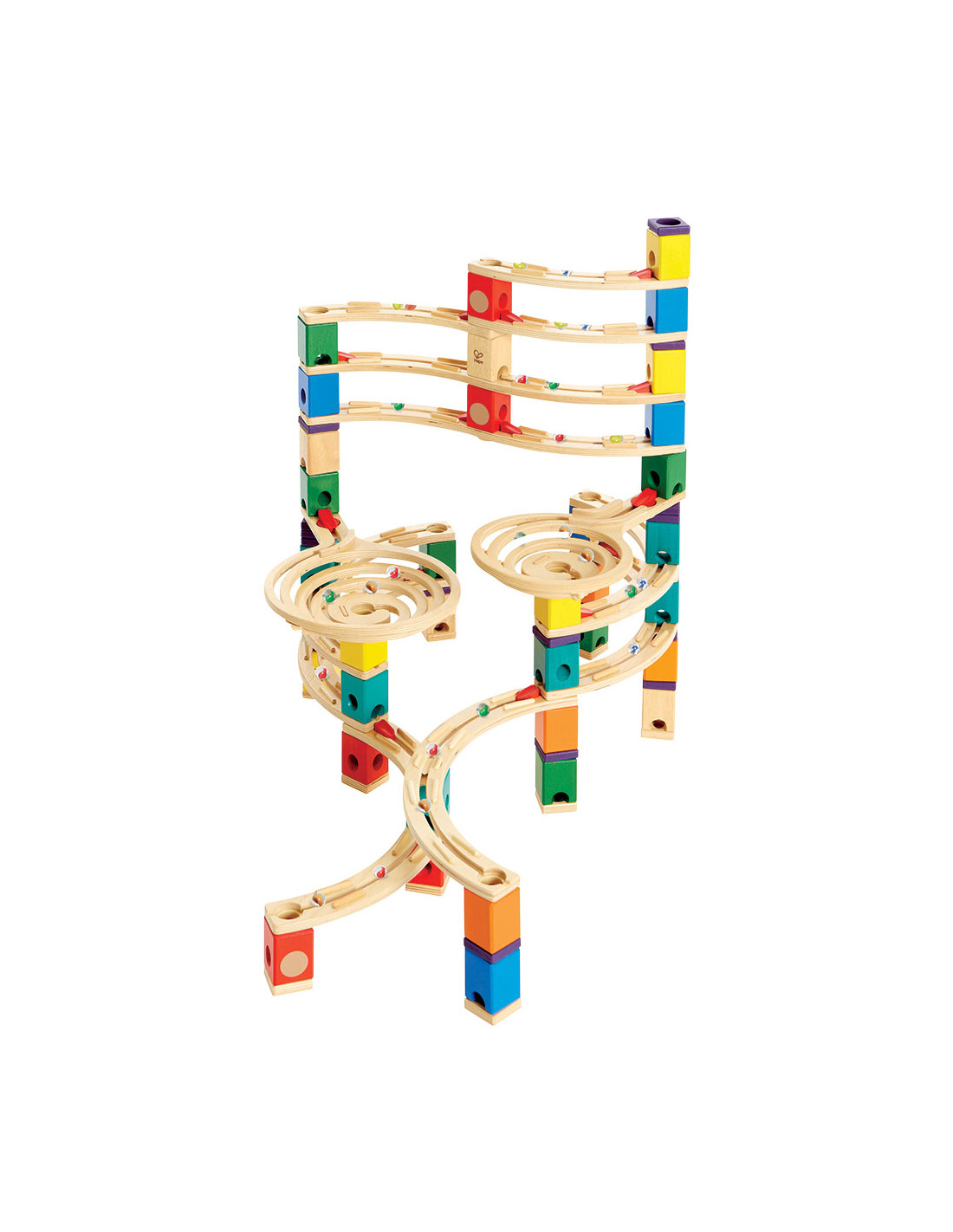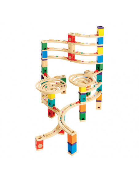 198-delige houten Hape Quadrilla knikkerbaan met twee draaiende trechters. Welke knikker is als eerste beneden? De knikkerbaan kan op verschillende manieren worden opgebouwd.