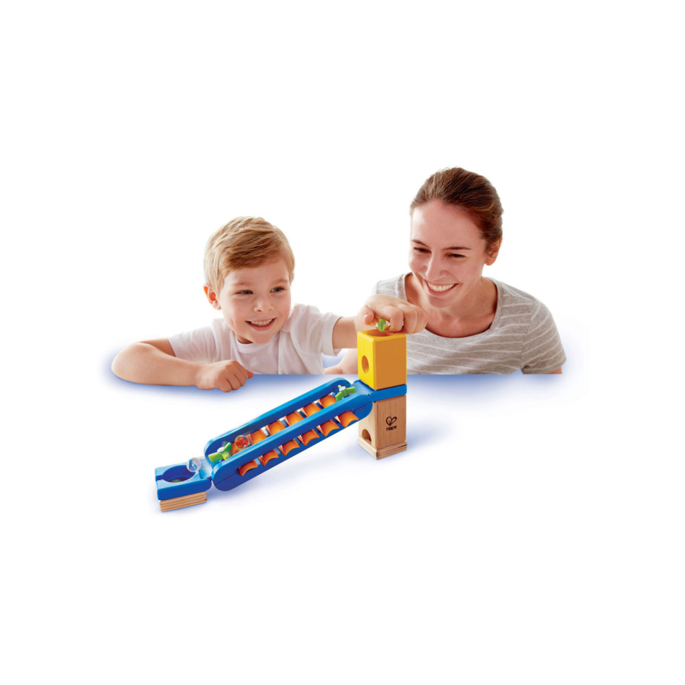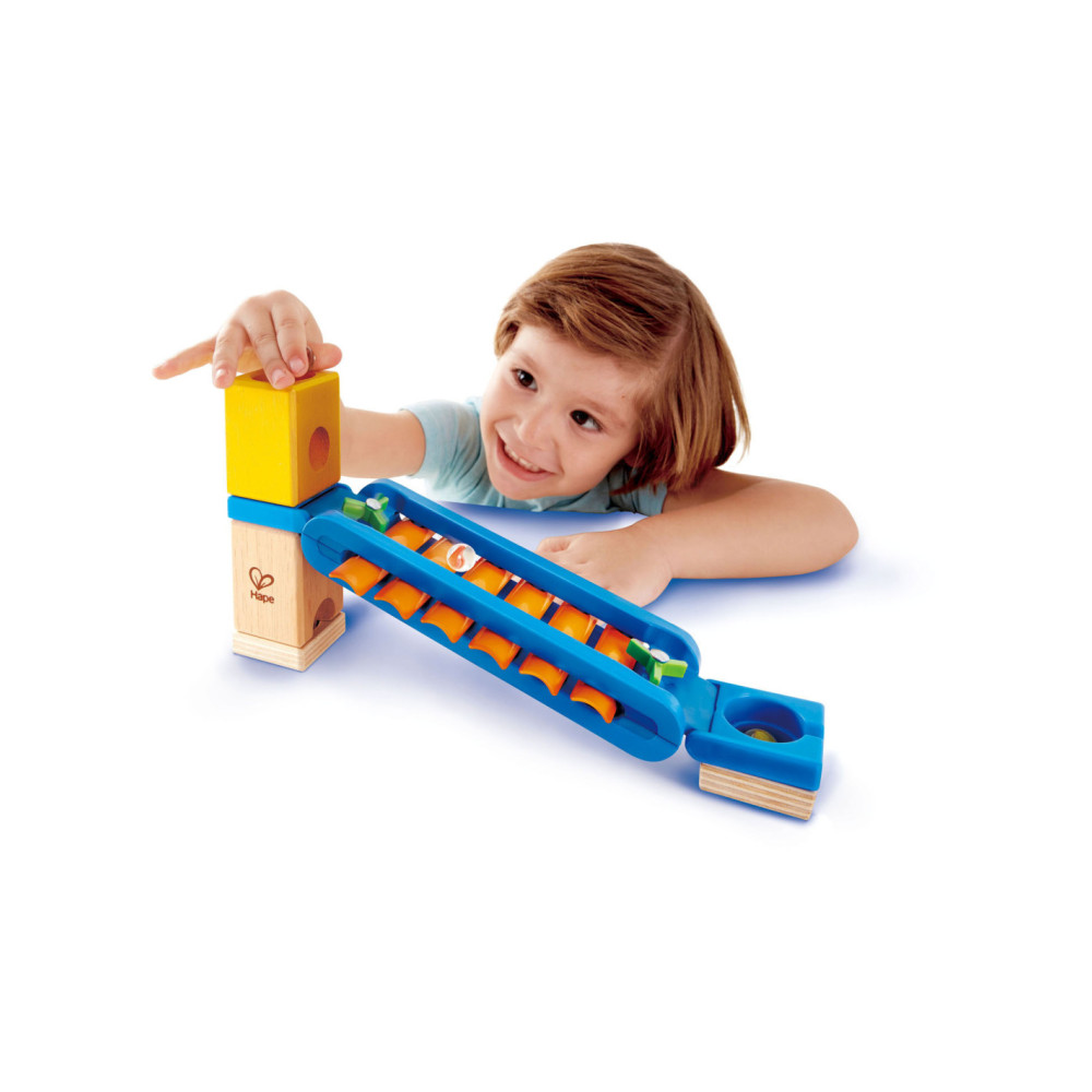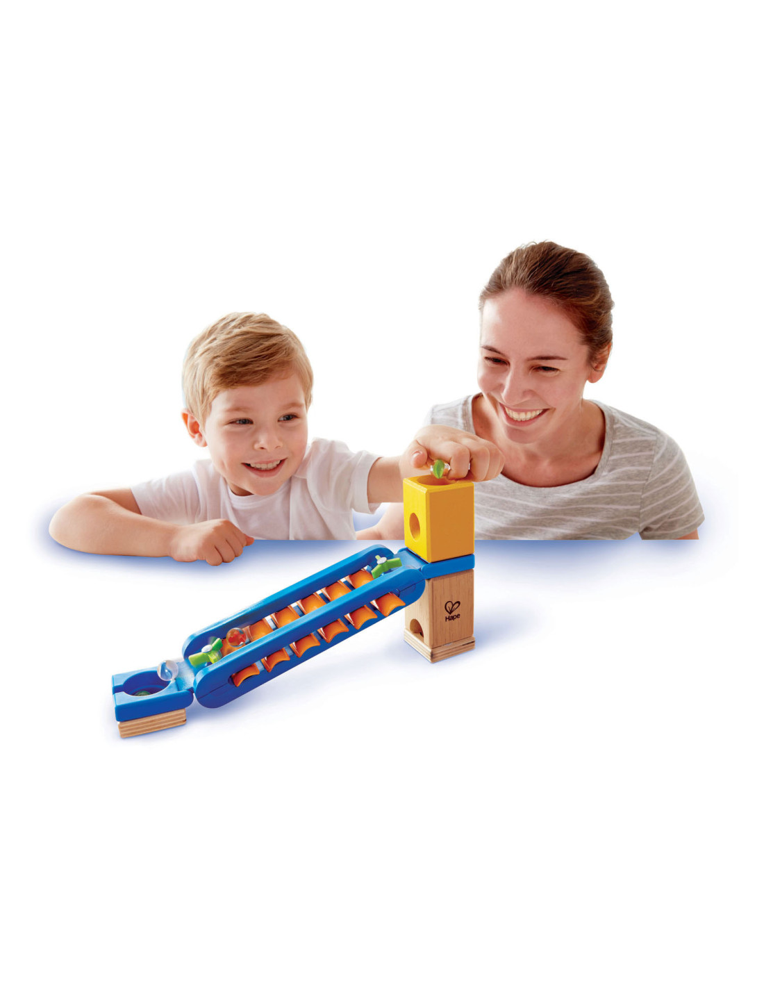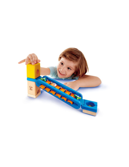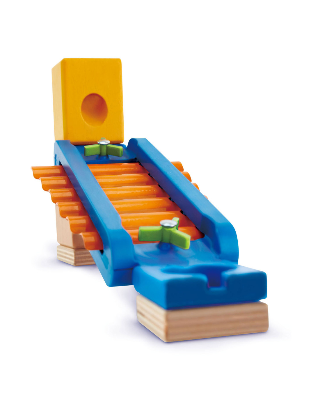 Bouw de lay-out afgebeeld op de doos en verbindt deze met een bestaande Quadrilla-set. Luister naar je knikkers als ze langs de xylofoonrails naar beneden dalen. Draai de richting van de rails om als je een andere melodie wilt afspelen.