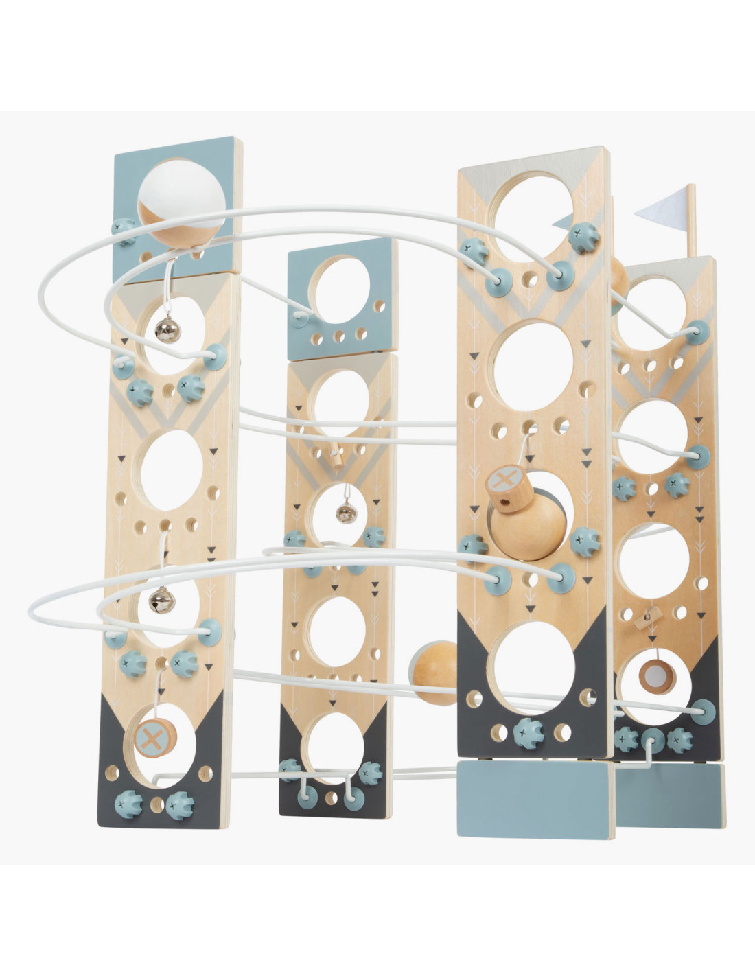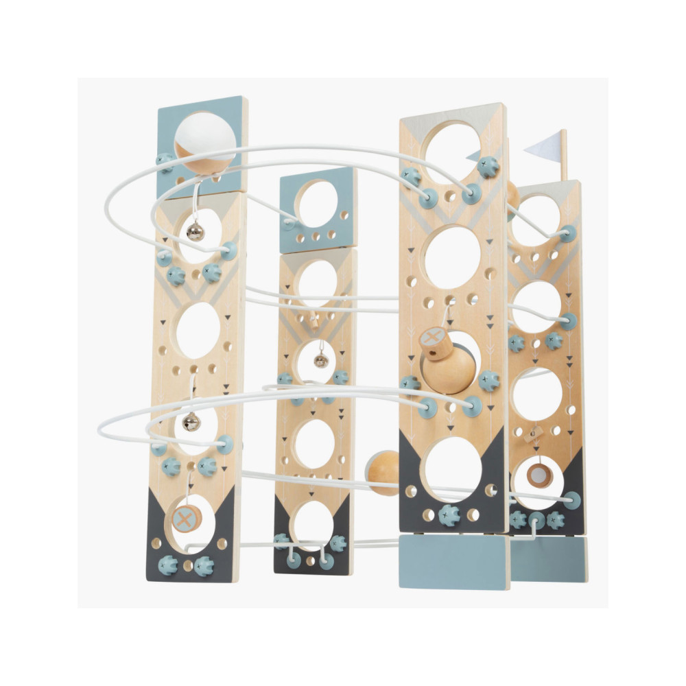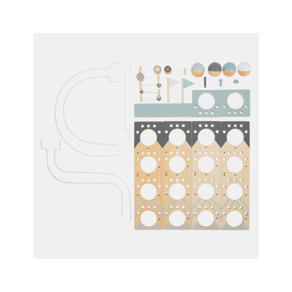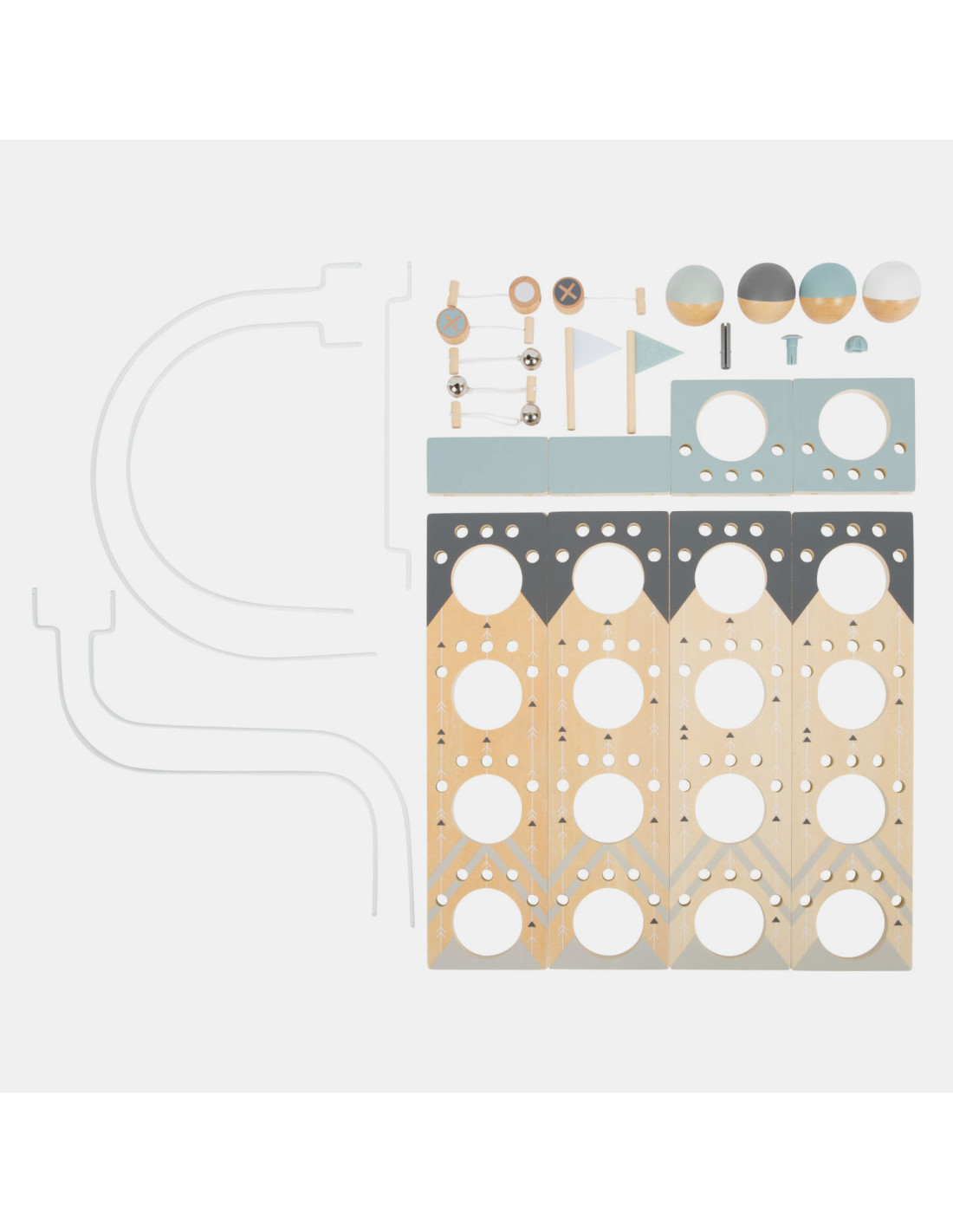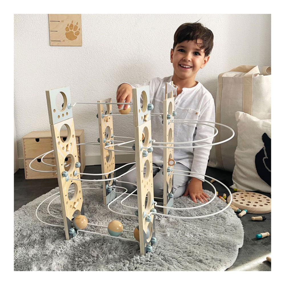 Bouwspeelgoed en knikkerbaan in één! Deze modulaire knikkerbaan in minimalistisch Scandinavisch design trekt jonge, ambitieuze bouwers aan als magie! Dankzij het flexibele systeem van verschillende metalen palen en speciale verbindingselementen biedt deze knikkerbaan volop montage- en constructiemogelijkheden. Met de vier grote ballen van massief hout, stoppers, belletjes en een finishvlag is langdurig speelplezier gegarandeerd! Wordt geleverd met instructies met montagesuggesties. Het modulaire montageprincipe maakt nieuwe, unieke tracks mogelijk en inspireert tot experimenteel en fantasierijk spel. De stoppers en belletjes helpen de ballen te vertragen tijdens hun snelle run door de bochten en de steile hellingen, terwijl de witte en blauwe vlaggen het begin en einde van de run aangeven. Door de verschillende onderdelen in elkaar te zetten, wordt op een speelse manier de fijne motoriek getraind, terwijl de bellen akoestische hoogtepunten bieden. Met zijn subtiele dessin met trendy rookblauw en veel natuurlijk, onbehandeld hout, past deze knikkerbaan prachtig in elke woonkamer of kinderkamer! En dat is bijzonder praktisch: na de speeltijd kan de knikkerbaan weer worden gedemonteerd en ruimtebesparend worden opgeborgen.