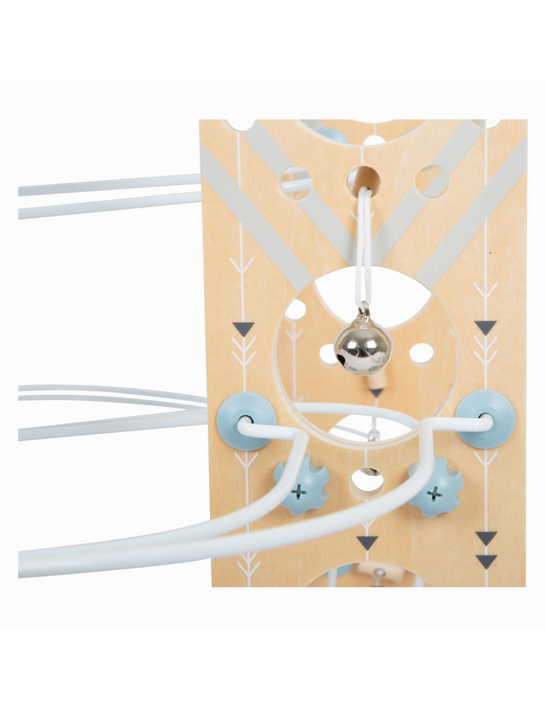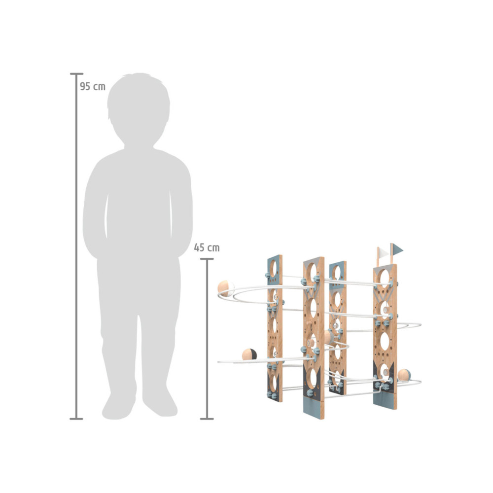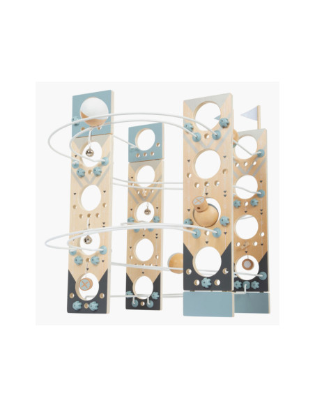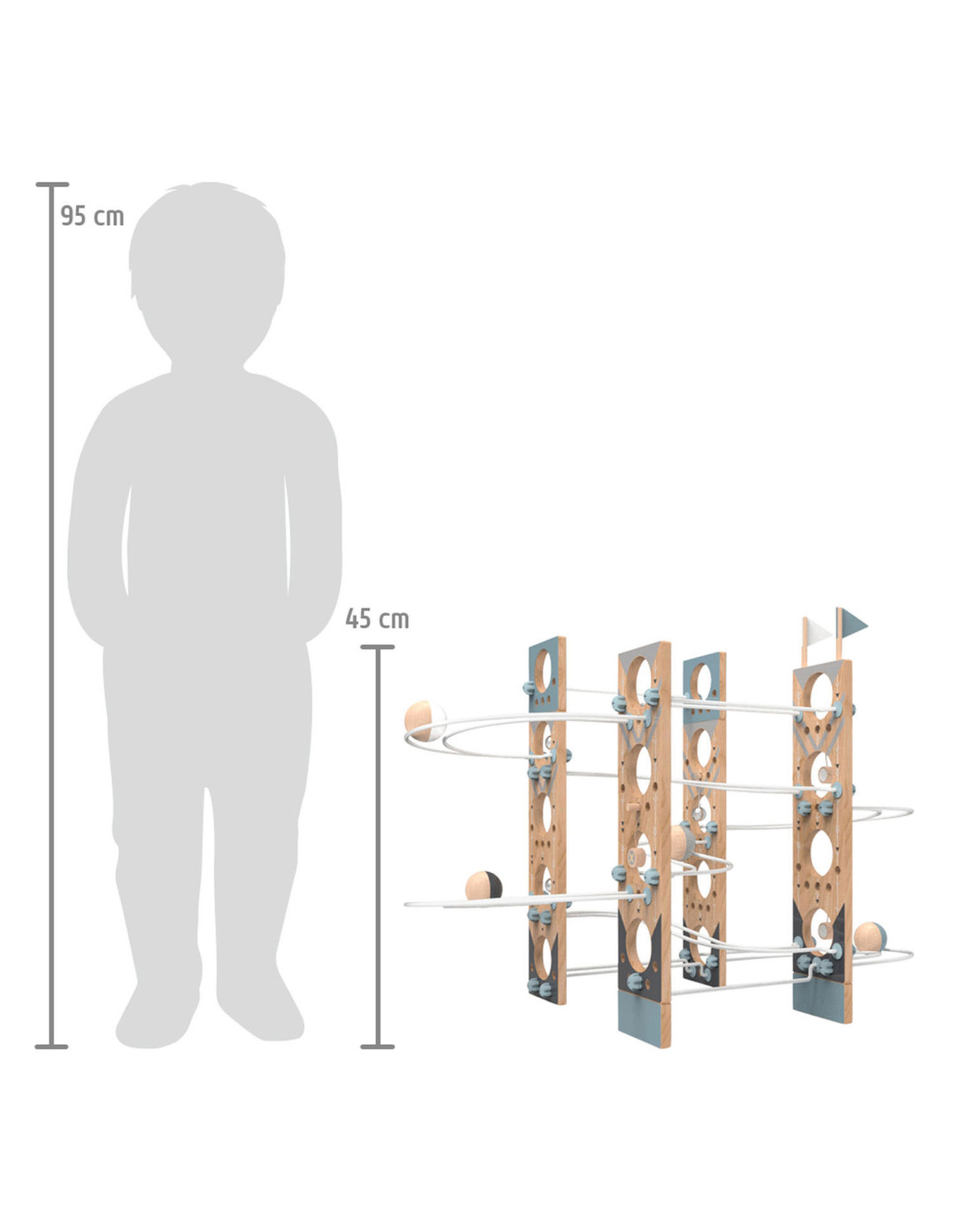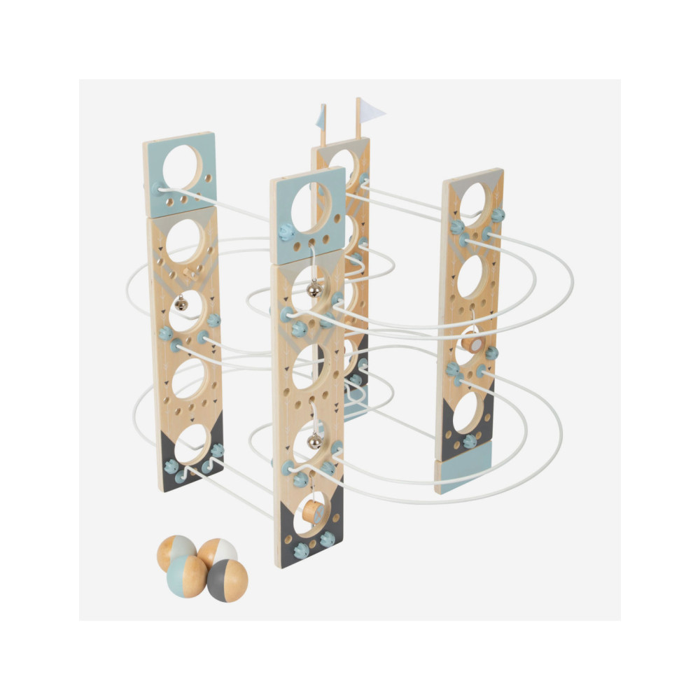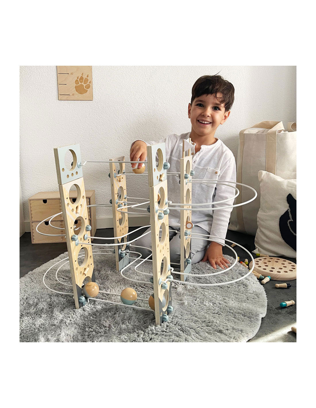 Bouwspeelgoed en knikkerbaan in één! Deze modulaire knikkerbaan in minimalistisch Scandinavisch design trekt jonge, ambitieuze bouwers aan als magie! Dankzij het flexibele systeem van verschillende metalen palen en speciale verbindingselementen biedt deze knikkerbaan volop montage- en constructiemogelijkheden. Met de vier grote ballen van massief hout, stoppers, belletjes en een finishvlag is langdurig speelplezier gegarandeerd! Wordt geleverd met instructies met montagesuggesties. Het modulaire montageprincipe maakt nieuwe, unieke tracks mogelijk en inspireert tot experimenteel en fantasierijk spel. De stoppers en belletjes helpen de ballen te vertragen tijdens hun snelle run door de bochten en de steile hellingen, terwijl de witte en blauwe vlaggen het begin en einde van de run aangeven. Door de verschillende onderdelen in elkaar te zetten, wordt op een speelse manier de fijne motoriek getraind, terwijl de bellen akoestische hoogtepunten bieden. Met zijn subtiele dessin met trendy rookblauw en veel natuurlijk, onbehandeld hout, past deze knikkerbaan prachtig in elke woonkamer of kinderkamer! En dat is bijzonder praktisch: na de speeltijd kan de knikkerbaan weer worden gedemonteerd en ruimtebesparend worden opgeborgen.