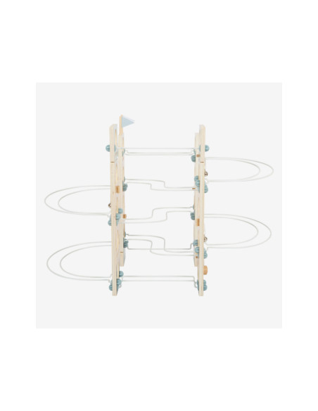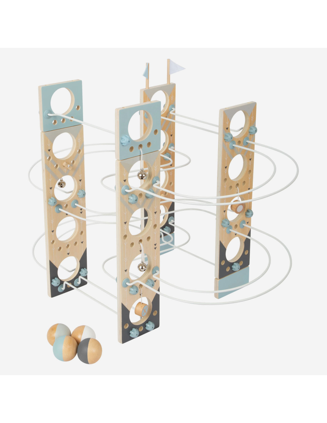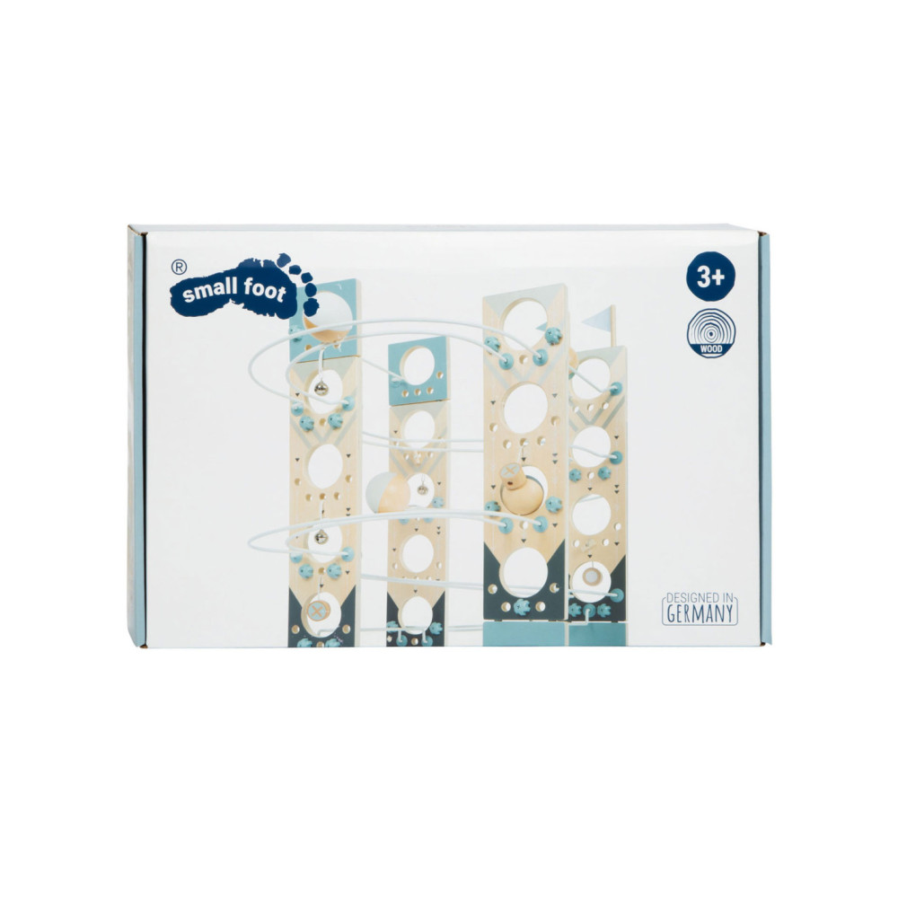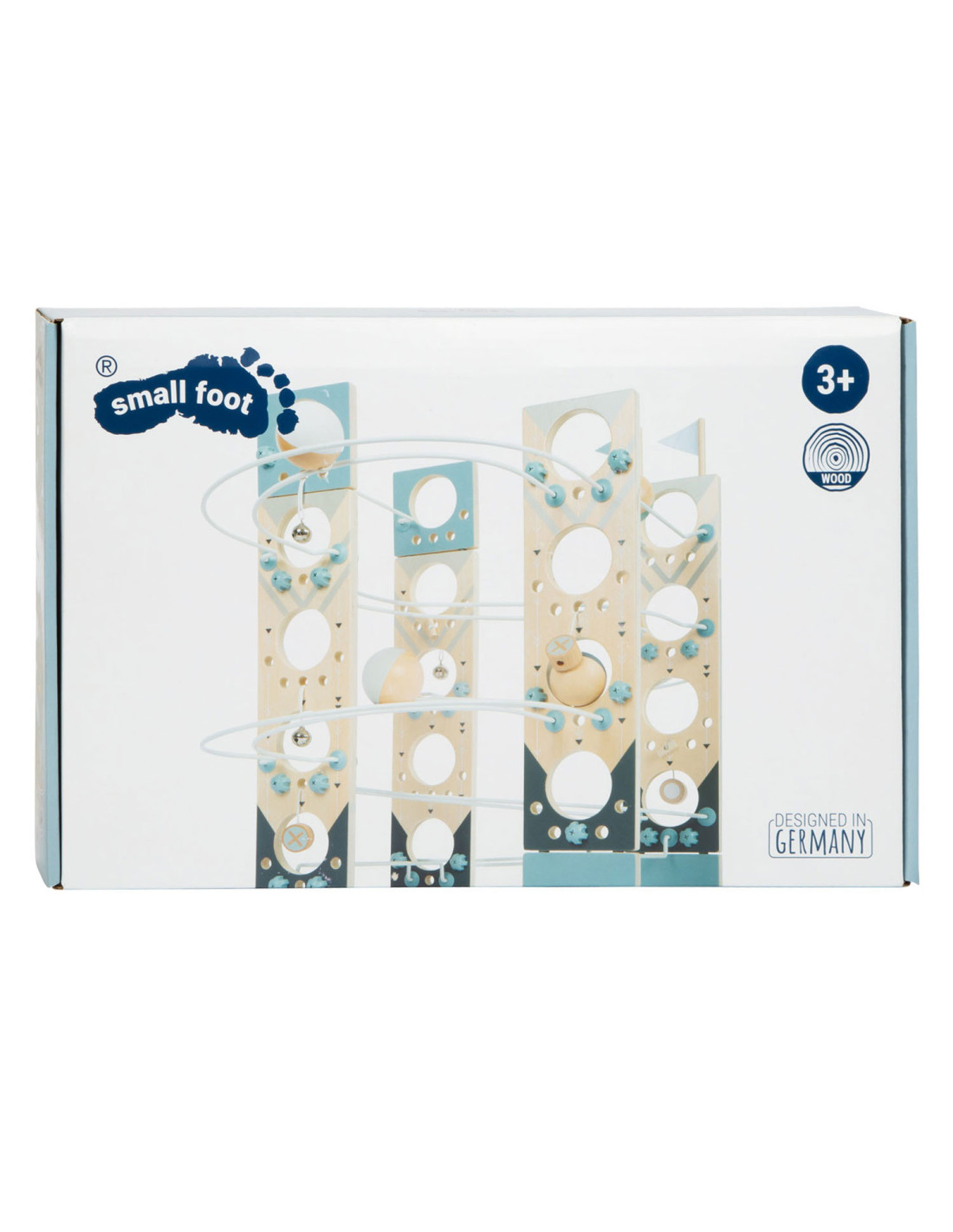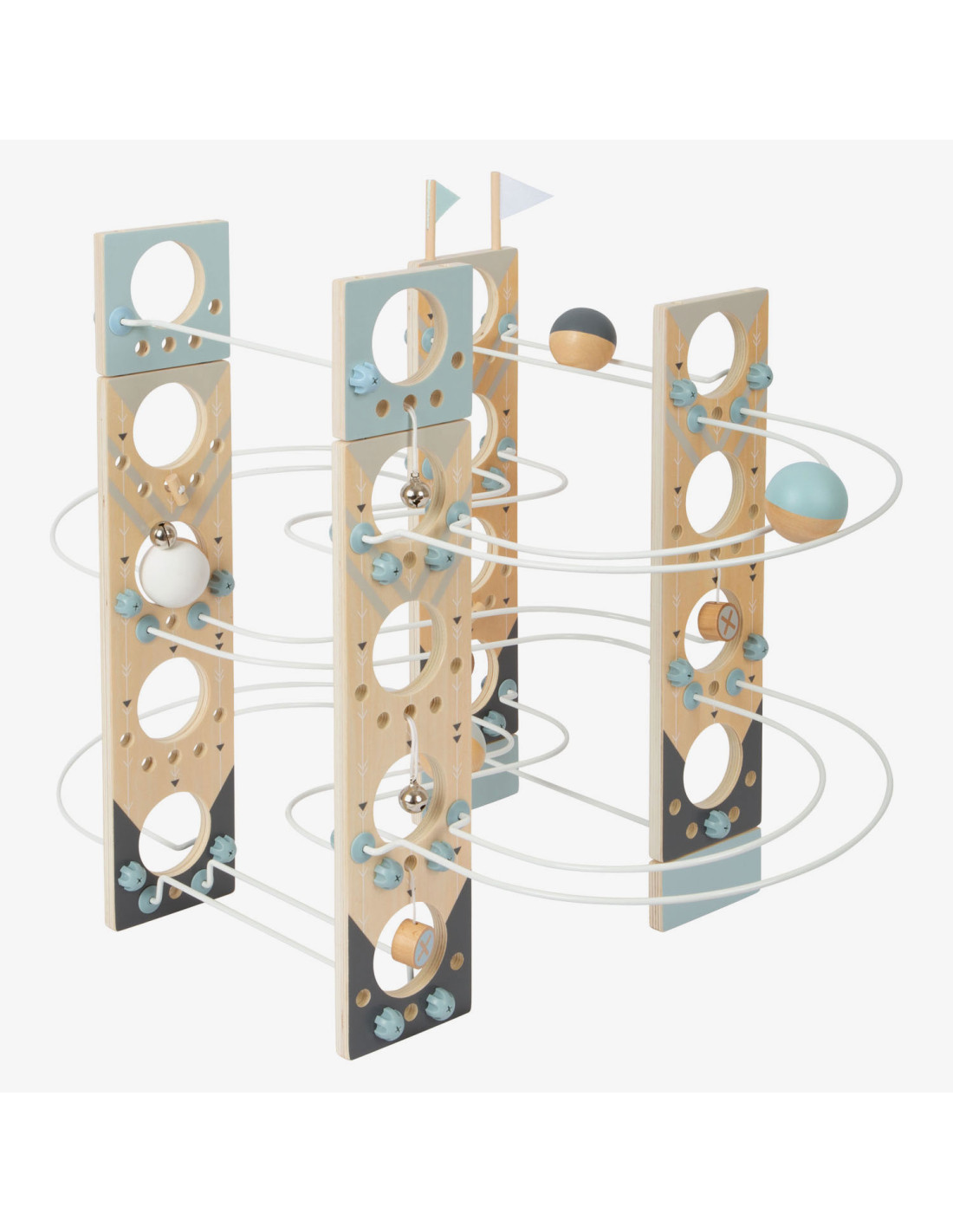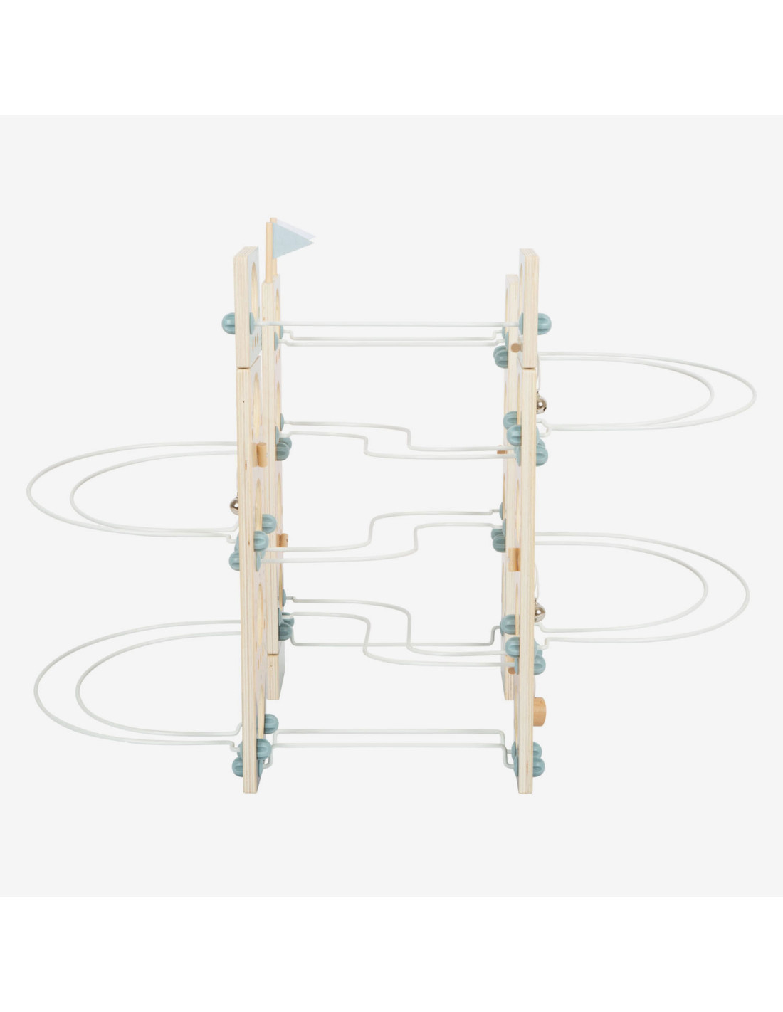 Bouwspeelgoed en knikkerbaan in één! Deze modulaire knikkerbaan in minimalistisch Scandinavisch design trekt jonge, ambitieuze bouwers aan als magie! Dankzij het flexibele systeem van verschillende metalen palen en speciale verbindingselementen biedt deze knikkerbaan volop montage- en constructiemogelijkheden. Met de vier grote ballen van massief hout, stoppers, belletjes en een finishvlag is langdurig speelplezier gegarandeerd! Wordt geleverd met instructies met montagesuggesties. Het modulaire montageprincipe maakt nieuwe, unieke tracks mogelijk en inspireert tot experimenteel en fantasierijk spel. De stoppers en belletjes helpen de ballen te vertragen tijdens hun snelle run door de bochten en de steile hellingen, terwijl de witte en blauwe vlaggen het begin en einde van de run aangeven. Door de verschillende onderdelen in elkaar te zetten, wordt op een speelse manier de fijne motoriek getraind, terwijl de bellen akoestische hoogtepunten bieden. Met zijn subtiele dessin met trendy rookblauw en veel natuurlijk, onbehandeld hout, past deze knikkerbaan prachtig in elke woonkamer of kinderkamer! En dat is bijzonder praktisch: na de speeltijd kan de knikkerbaan weer worden gedemonteerd en ruimtebesparend worden opgeborgen.
