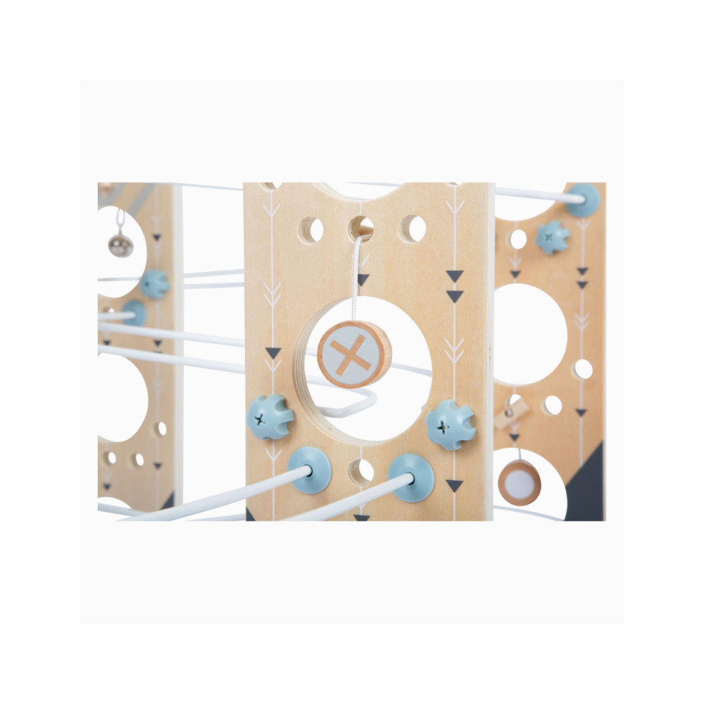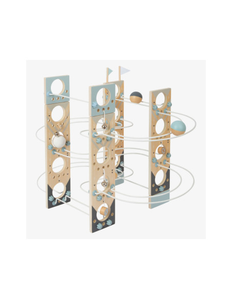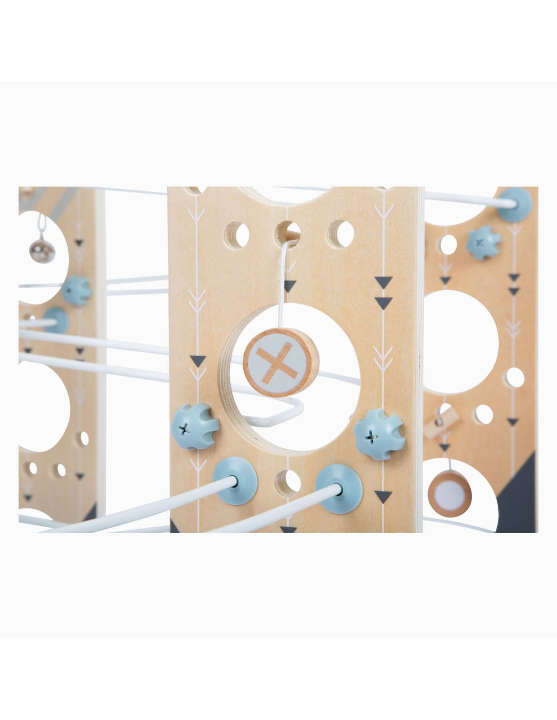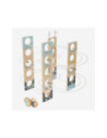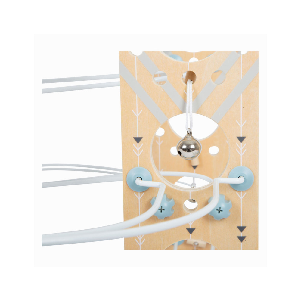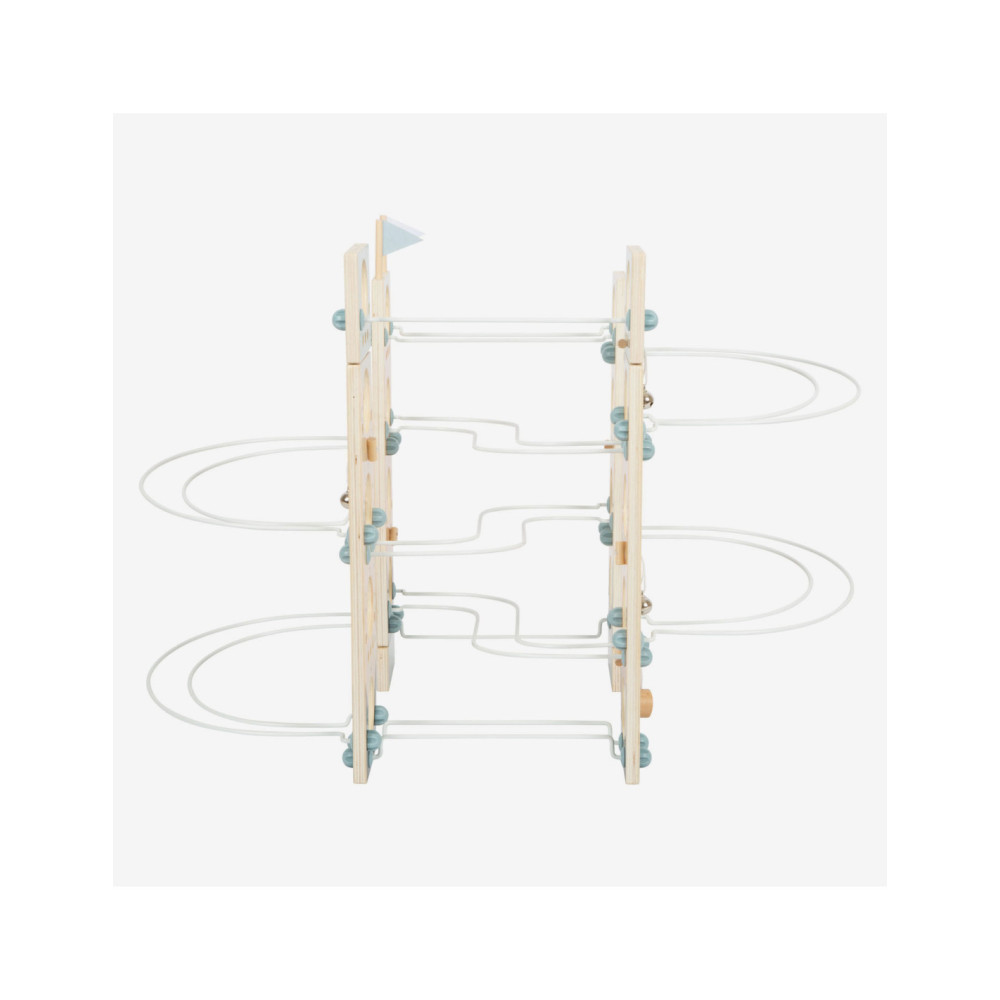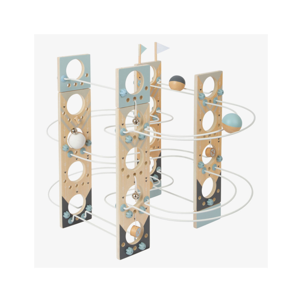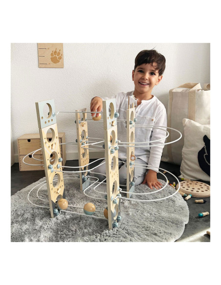 Bouwspeelgoed en knikkerbaan in één! Deze modulaire knikkerbaan in minimalistisch Scandinavisch design trekt jonge, ambitieuze bouwers aan als magie! Dankzij het flexibele systeem van verschillende metalen palen en speciale verbindingselementen biedt deze knikkerbaan volop montage- en constructiemogelijkheden. Met de vier grote ballen van massief hout, stoppers, belletjes en een finishvlag is langdurig speelplezier gegarandeerd! Wordt geleverd met instructies met montagesuggesties. Het modulaire montageprincipe maakt nieuwe, unieke tracks mogelijk en inspireert tot experimenteel en fantasierijk spel. De stoppers en belletjes helpen de ballen te vertragen tijdens hun snelle run door de bochten en de steile hellingen, terwijl de witte en blauwe vlaggen het begin en einde van de run aangeven. Door de verschillende onderdelen in elkaar te zetten, wordt op een speelse manier de fijne motoriek getraind, terwijl de bellen akoestische hoogtepunten bieden. Met zijn subtiele dessin met trendy rookblauw en veel natuurlijk, onbehandeld hout, past deze knikkerbaan prachtig in elke woonkamer of kinderkamer! En dat is bijzonder praktisch: na de speeltijd kan de knikkerbaan weer worden gedemonteerd en ruimtebesparend worden opgeborgen.