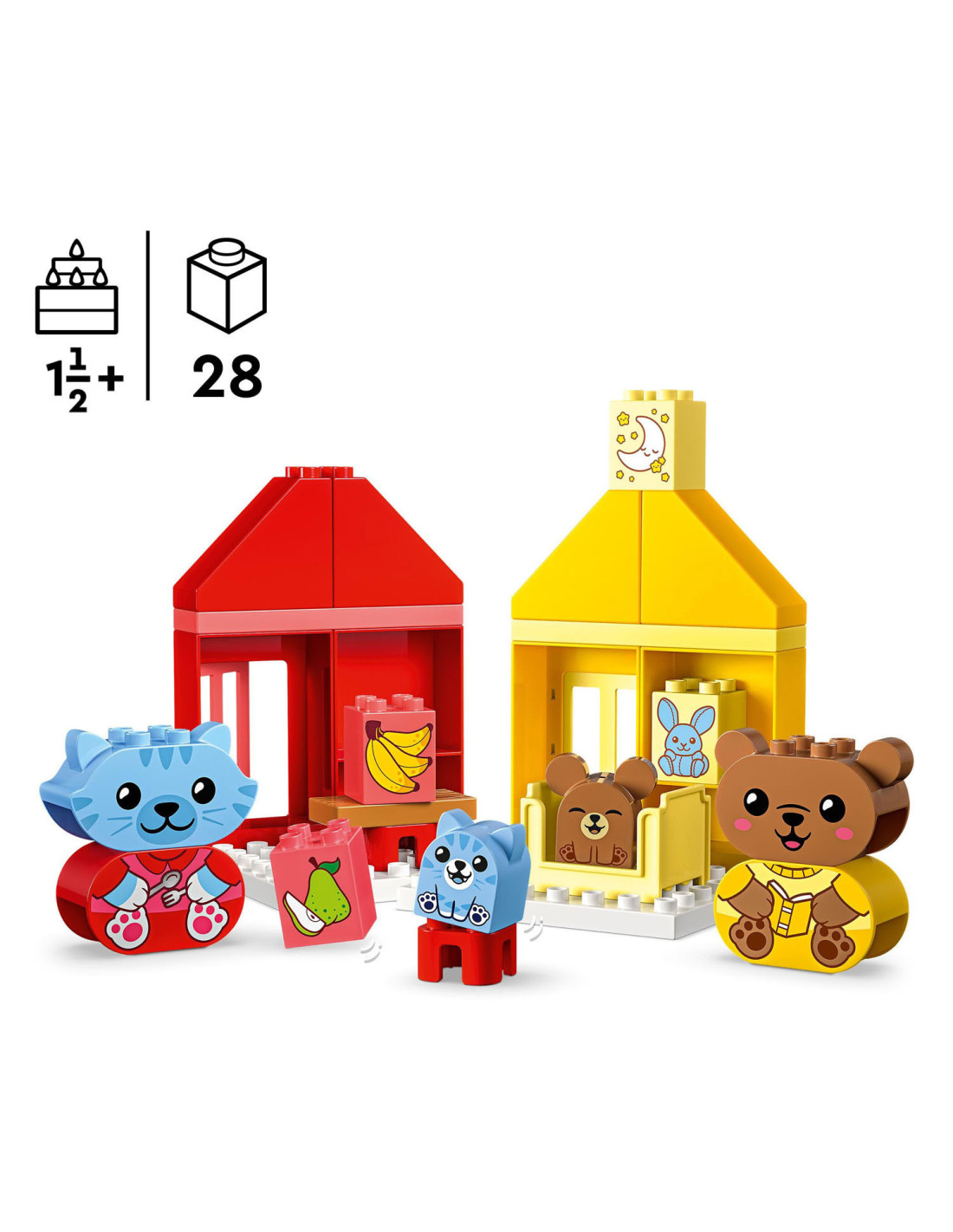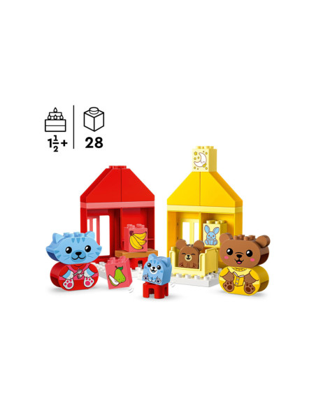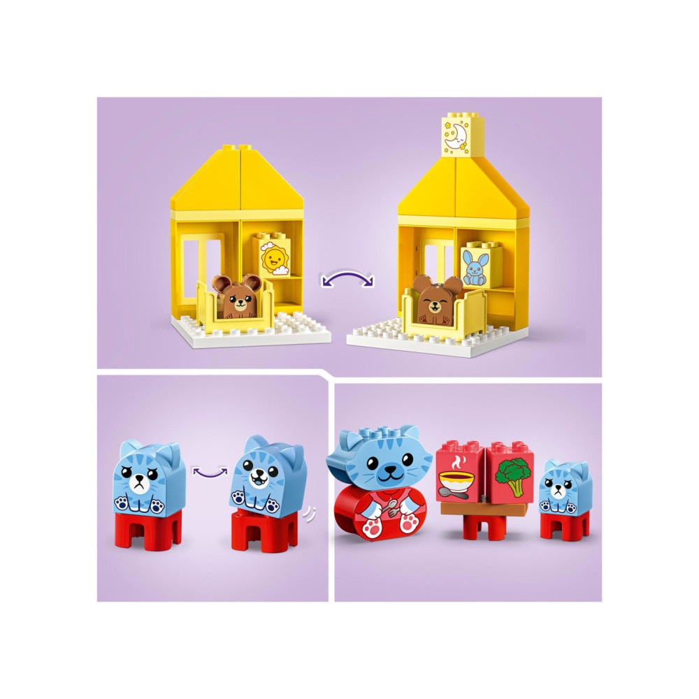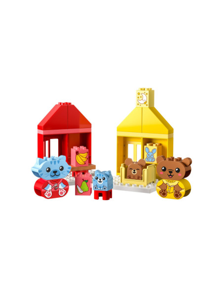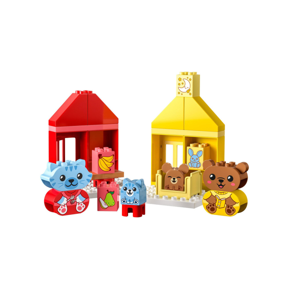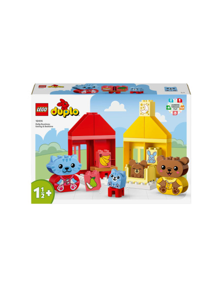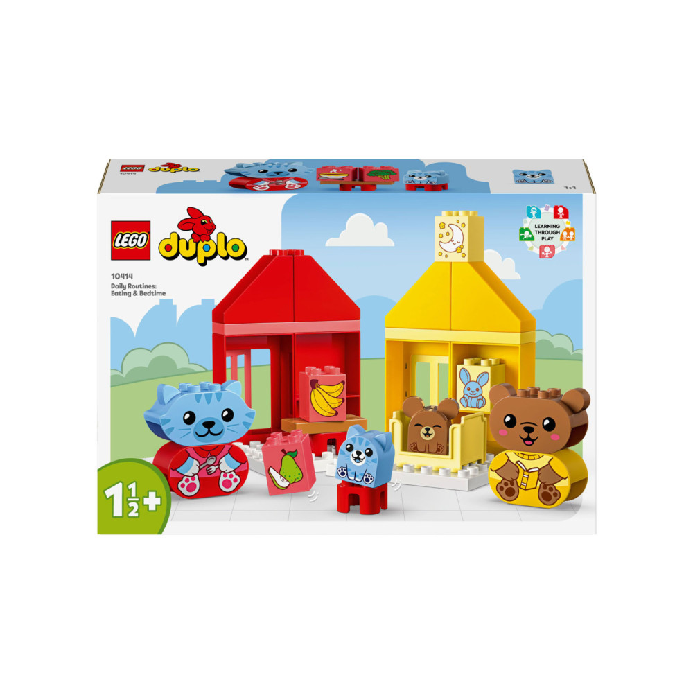 Help peuters hun gevoelens te verkennen met LEGO DUPLO Mijn eerste dagelijkse gewoontes �?? eten en slapen (10414). Dit leuke, educatieve speelgoed voor peuters vanaf 18 maanden wordt geleverd met 4 herkenbare speelgoed dieren figuren.Bedtijd en etenstijd kunnen lastige momenten zijn voor kleintjes, maar met dit peuterspeelgoed kunnen ze uiten hoe ze zich voelen tijdens deze activiteiten. De set bevat 2 schattige DUPLO dieren families bestaande uit een ouder en een kind. De kitten en berenwelp hebben 2 gezichtsuitdrukkingen �?? de ene blij, de andere verdrietig �?? waardoor peuters die nog niet kunnen praten gemakkelijk kunnen laten zien hoe ze zich voelen.LEGO DUPLO sets zijn een geweldige manier om spelenderwijs te leren. Tijdens het interactieve rollenspel kunnen ouders de speelgoed figuren gebruiken om peuters het belang van gewoontes uit te leggen. Peuters ontwikkelen hun fijne motoriek met dit huis speelgoed terwijl ze de kleurrijke stenen op elkaar zetten. De kleuren maken het bouwen een fluitje van een cent. Een leuk cadeau voor peuters en kleuters!Afmetingen �?? deze set is ca. 17 cm hoog, 53 cm breed en 13 cm diep.