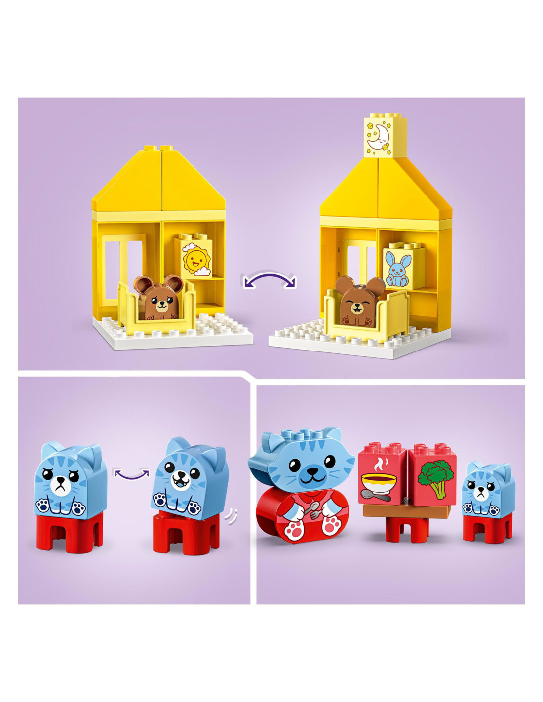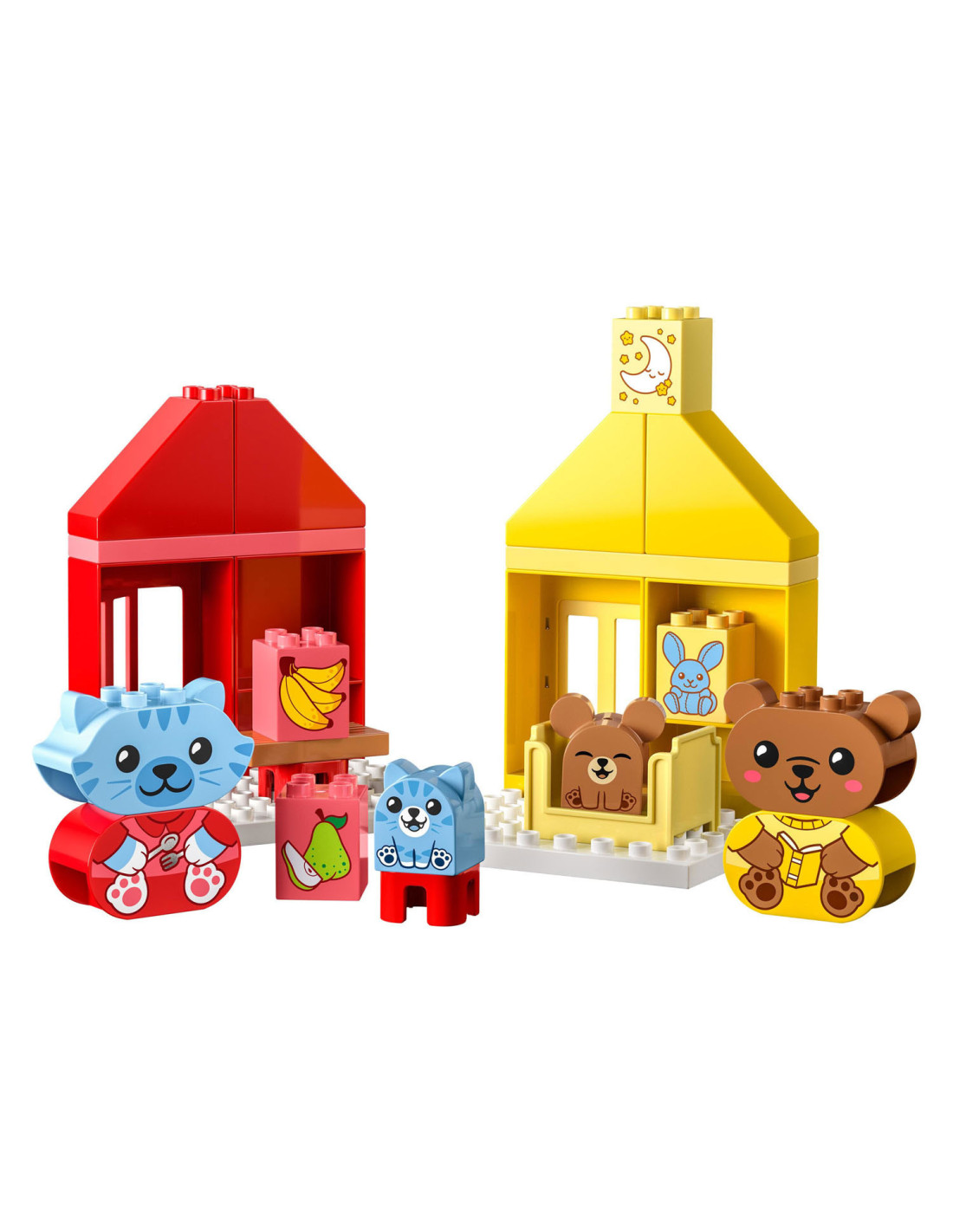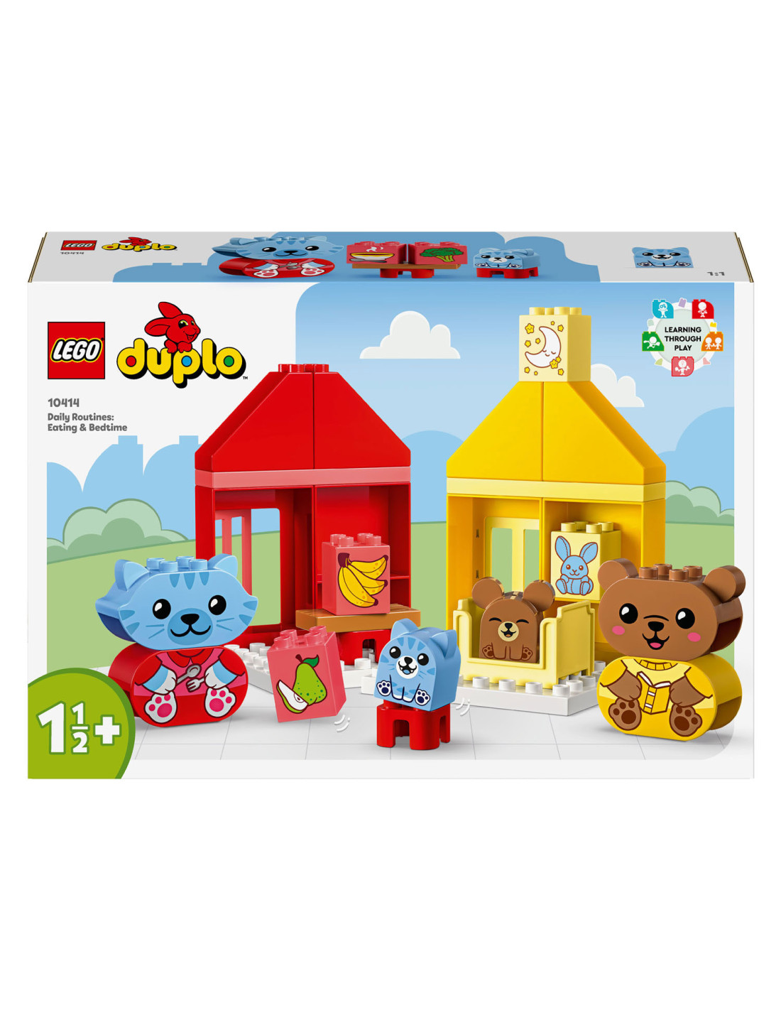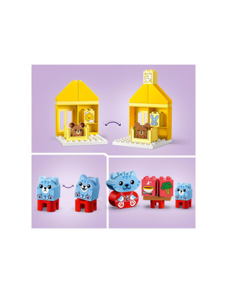 Help peuters hun gevoelens te verkennen met LEGO DUPLO Mijn eerste dagelijkse gewoontes �?? eten en slapen (10414). Dit leuke, educatieve speelgoed voor peuters vanaf 18 maanden wordt geleverd met 4 herkenbare speelgoed dieren figuren.Bedtijd en etenstijd kunnen lastige momenten zijn voor kleintjes, maar met dit peuterspeelgoed kunnen ze uiten hoe ze zich voelen tijdens deze activiteiten. De set bevat 2 schattige DUPLO dieren families bestaande uit een ouder en een kind. De kitten en berenwelp hebben 2 gezichtsuitdrukkingen �?? de ene blij, de andere verdrietig �?? waardoor peuters die nog niet kunnen praten gemakkelijk kunnen laten zien hoe ze zich voelen.LEGO DUPLO sets zijn een geweldige manier om spelenderwijs te leren. Tijdens het interactieve rollenspel kunnen ouders de speelgoed figuren gebruiken om peuters het belang van gewoontes uit te leggen. Peuters ontwikkelen hun fijne motoriek met dit huis speelgoed terwijl ze de kleurrijke stenen op elkaar zetten. De kleuren maken het bouwen een fluitje van een cent. Een leuk cadeau voor peuters en kleuters!Afmetingen �?? deze set is ca. 17 cm hoog, 53 cm breed en 13 cm diep.