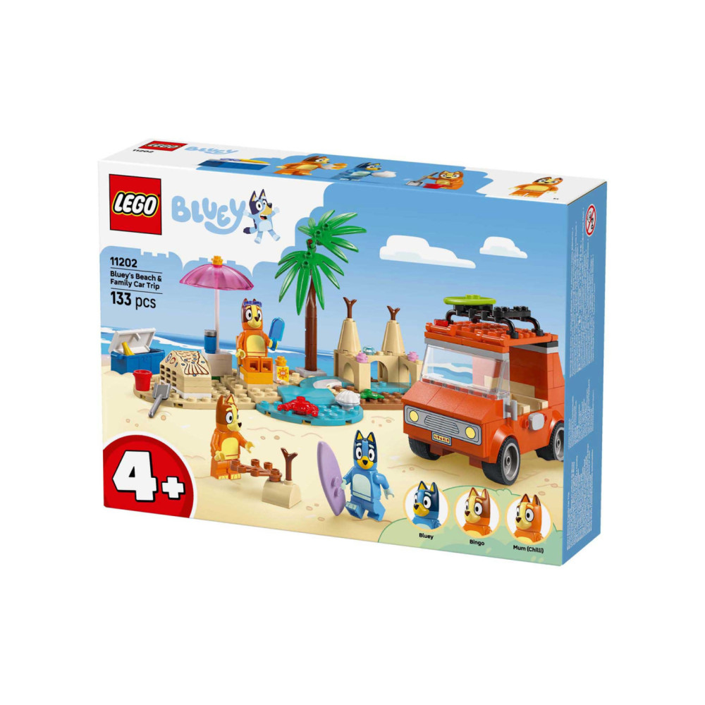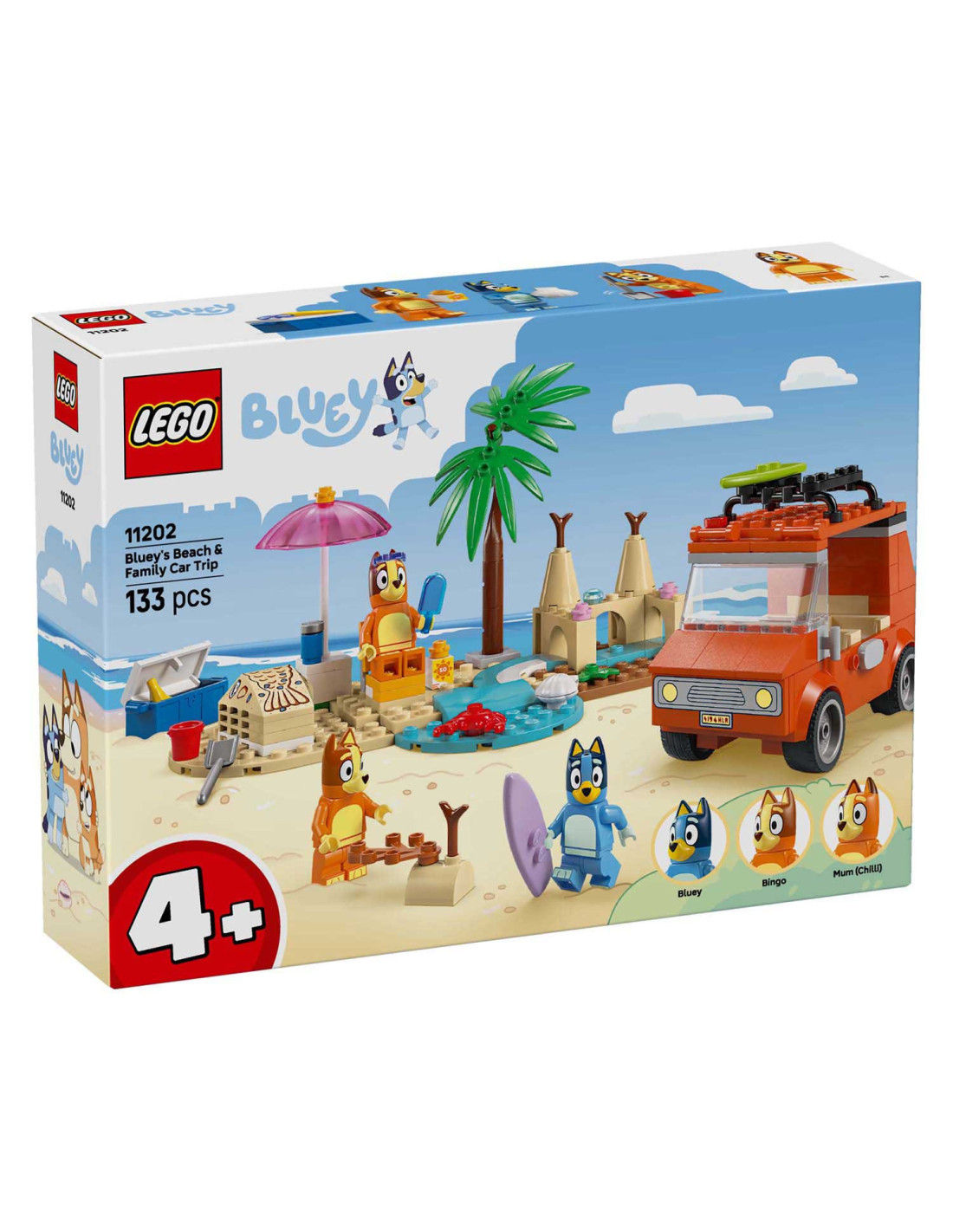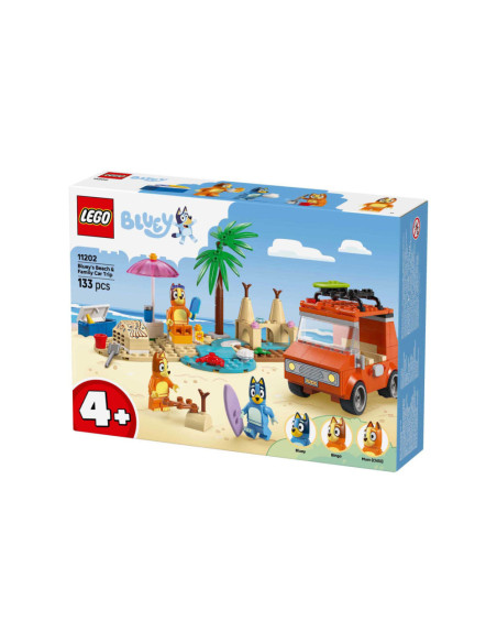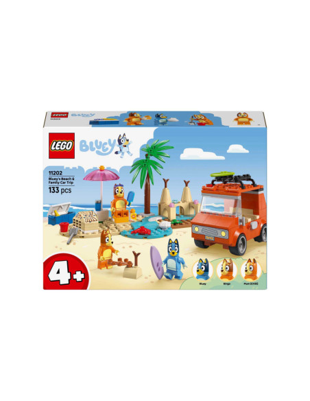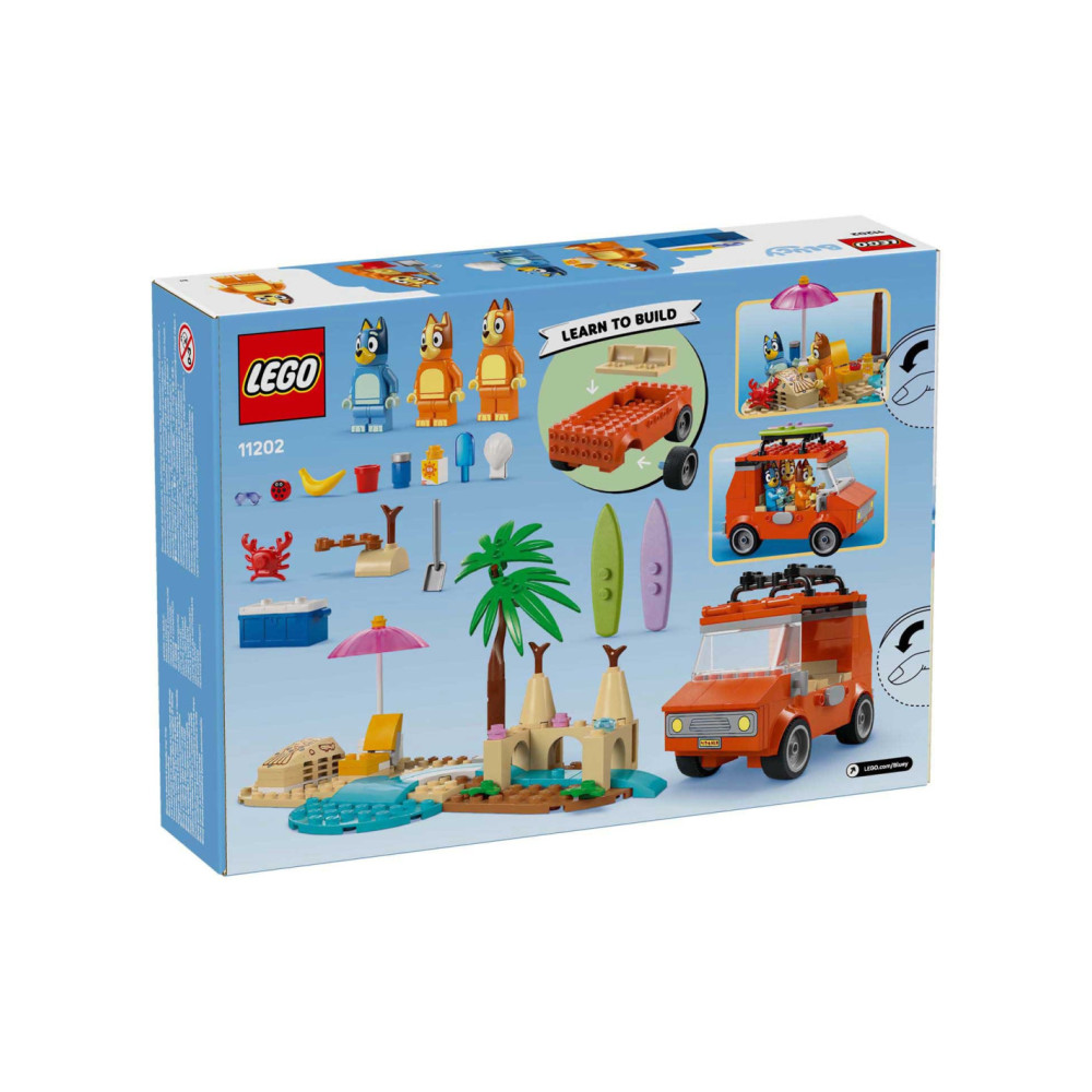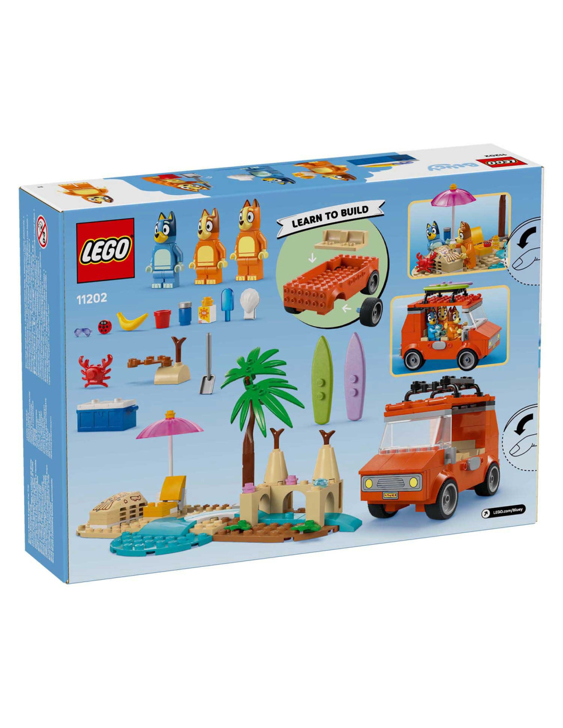 Dit LEGO® speelgoed bevat de bekende auto uit de tv-serie Bluey, met 2 surfplanken bovenop en een kofferbak aan de achterkant om de koelbox in op te bergen. Het dak kan open en er zijn zitplaatsen voor de minifiguren van Bluey, Bingo en Chilli (Bluey's moeder). Een indrukwekkend zandkasteel, een zandmeerminstaart waar een minifiguur in past, een strandstoel, een parasol en een palmboom zorgen voor fantasierijk speelplezier. Accessoires zijn onder andere een krab, een ijsje, een zonnebril en zonnebrandcrème.