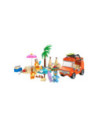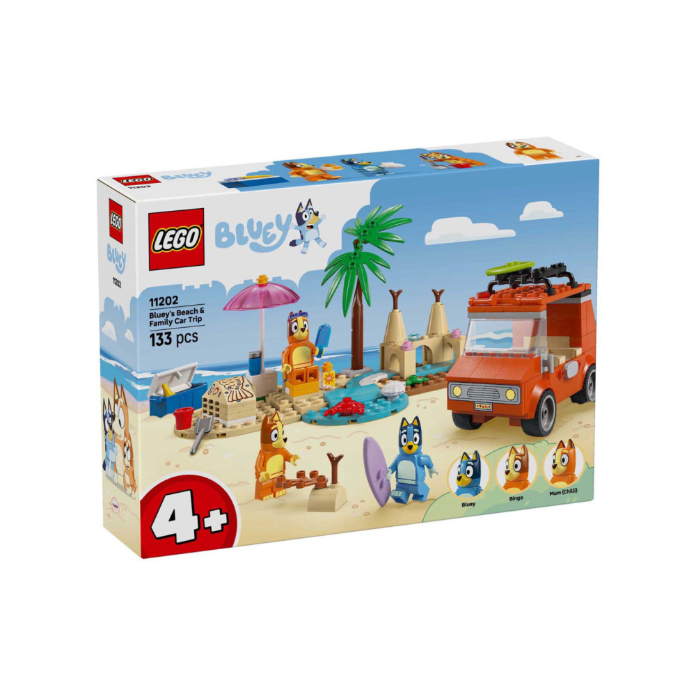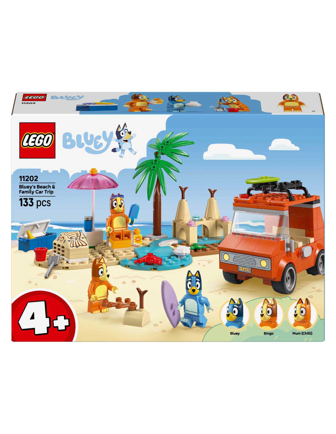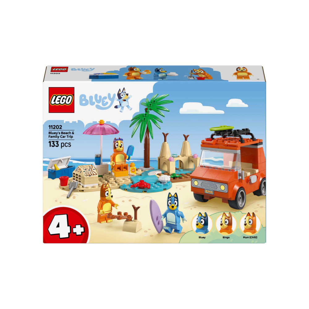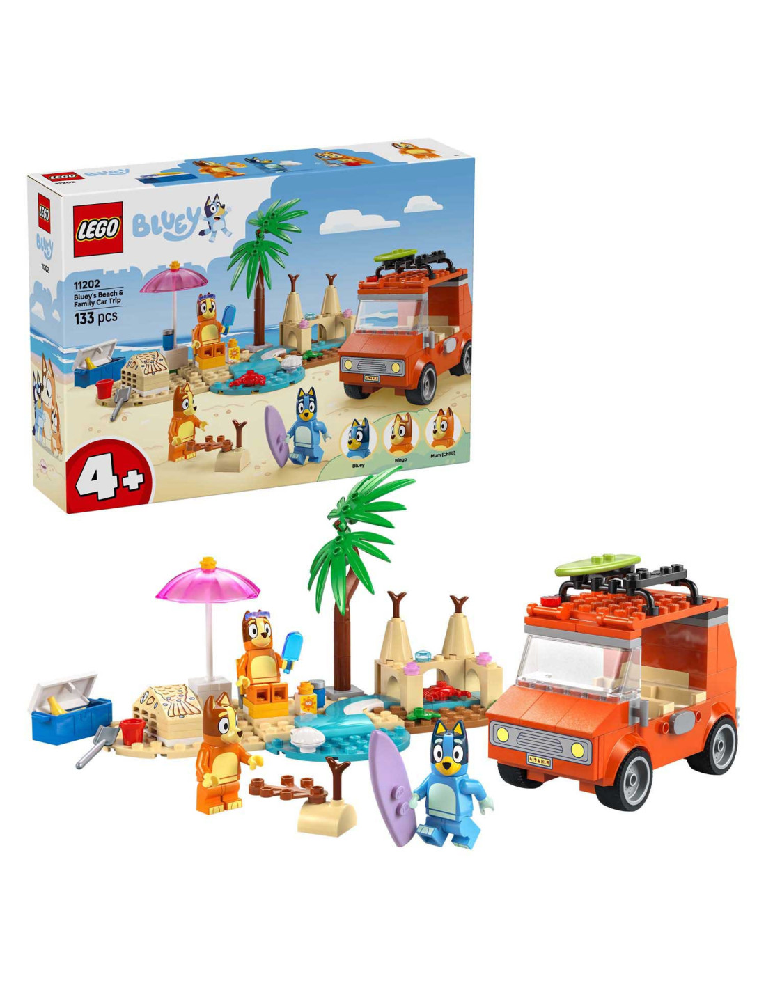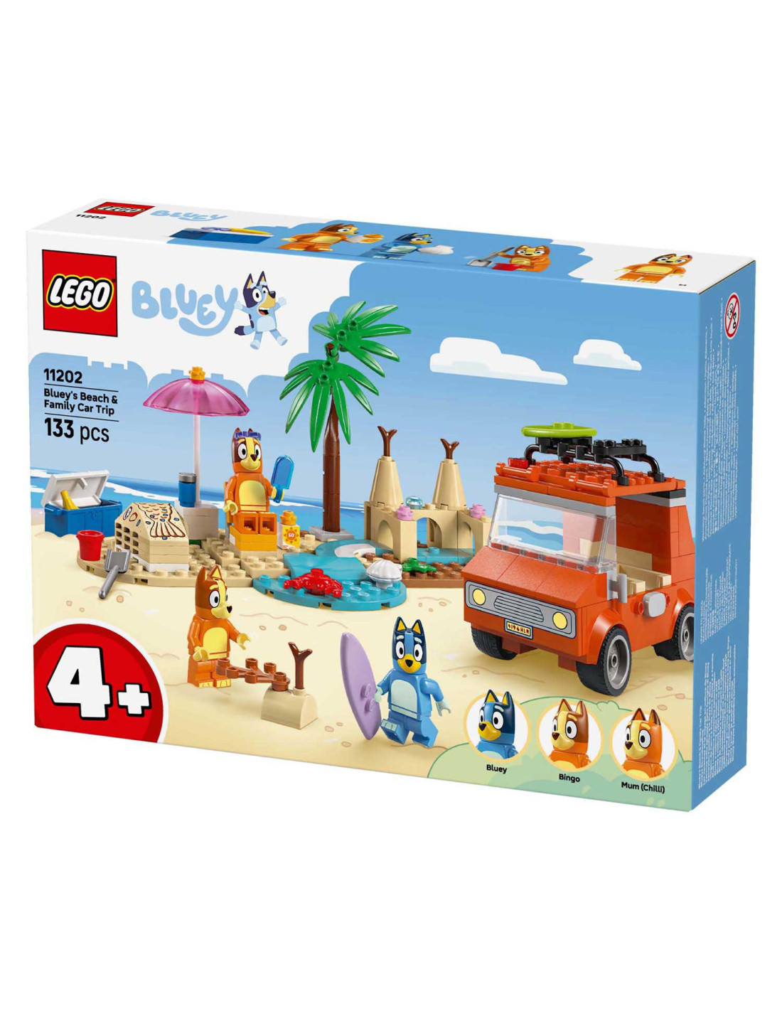 Dit LEGO® speelgoed bevat de bekende auto uit de tv-serie Bluey, met 2 surfplanken bovenop en een kofferbak aan de achterkant om de koelbox in op te bergen. Het dak kan open en er zijn zitplaatsen voor de minifiguren van Bluey, Bingo en Chilli (Bluey's moeder). Een indrukwekkend zandkasteel, een zandmeerminstaart waar een minifiguur in past, een strandstoel, een parasol en een palmboom zorgen voor fantasierijk speelplezier. Accessoires zijn onder andere een krab, een ijsje, een zonnebril en zonnebrandcrème.