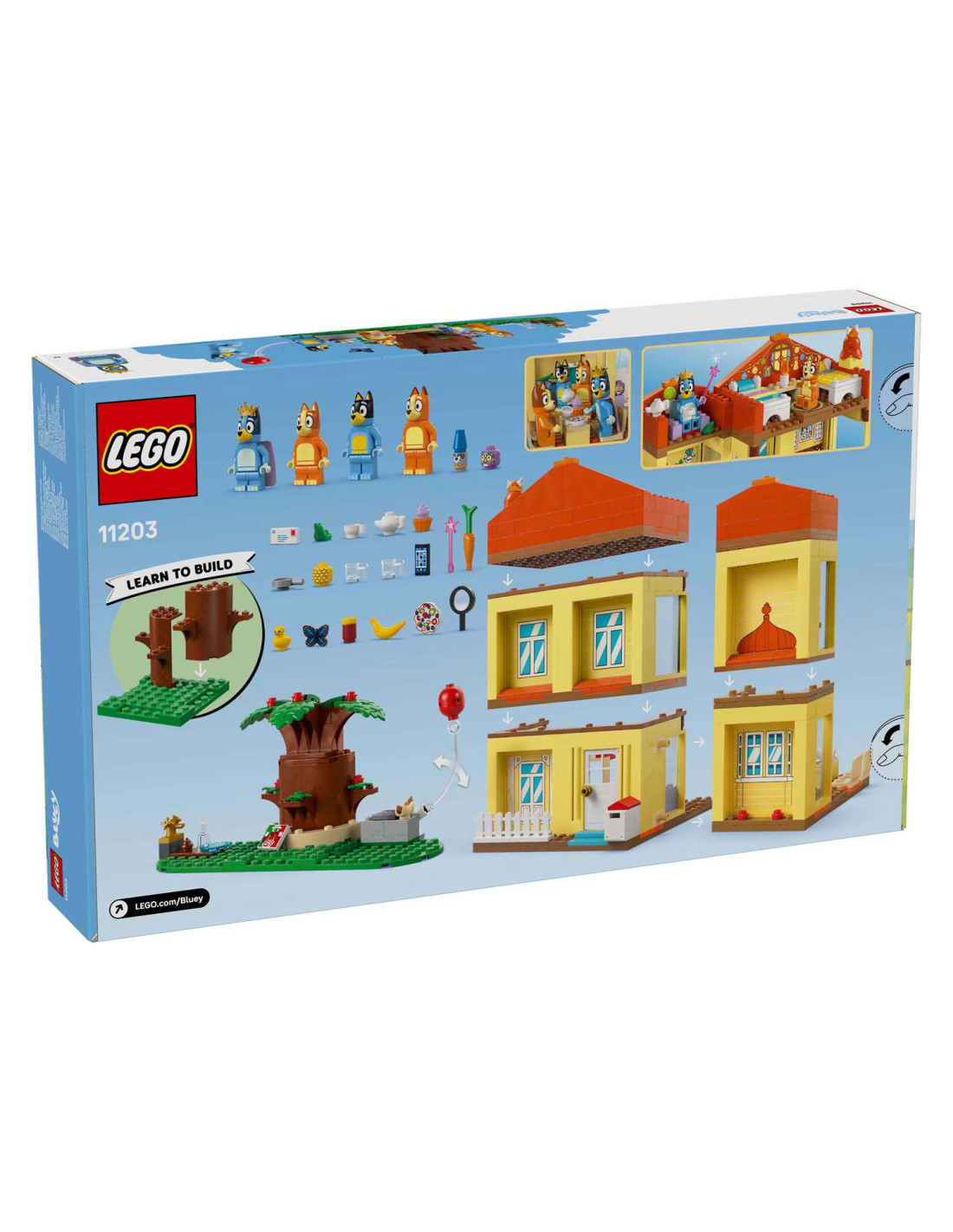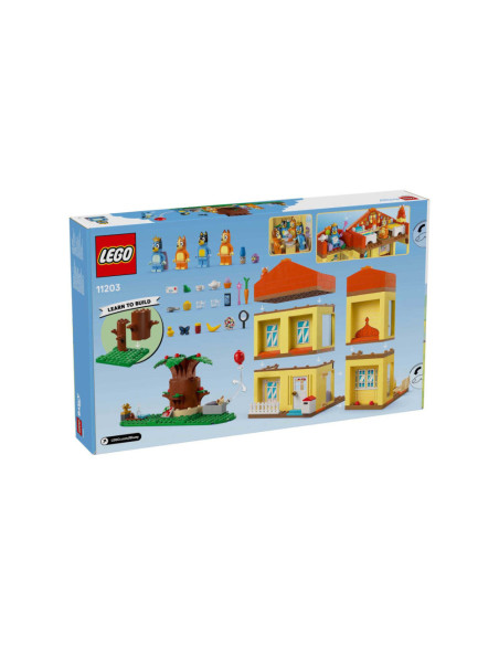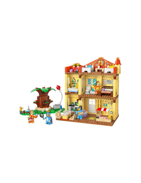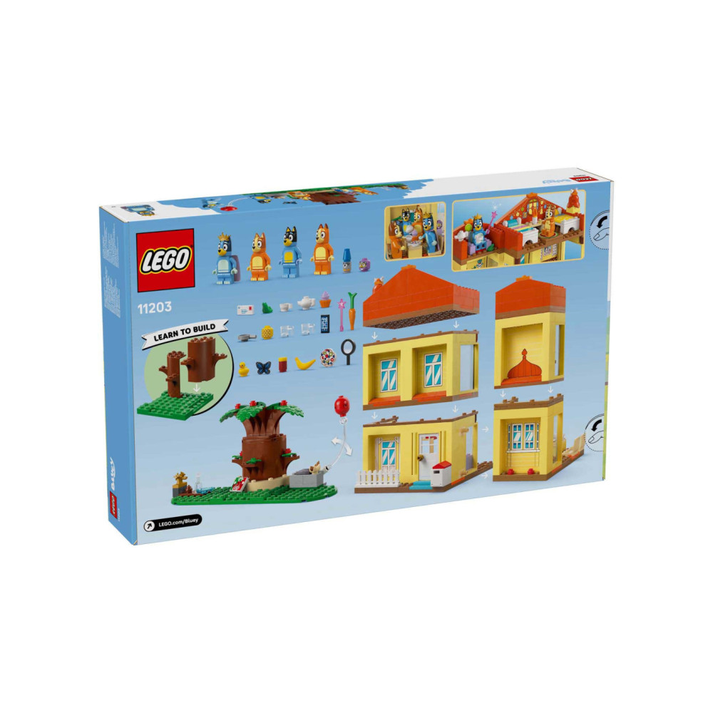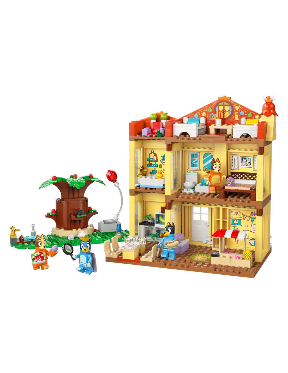 Het modulaire speelhuis bevat 4 minifiguren van Bluey, Bingo, Chilli (Bluey's moeder) en Buster (Bluey's vader) en accessoires, waaronder een regenboogcape, toverstaf en vergrootglas. Alle kamers zijn uitneembaar. In de speelkamer staan een poppenhuis, piano en kraampje met eten. De keuken heeft een koelkast, oven, fornuis, tafel en stoelen. Boven is de slaapkamer van mama en papa en een badkamer. De slaapkamer van Bluey en Bingo op zolder heeft een kleed, een lamp en een figuur van Babbel-uil. Naast de deur staat de troon van de koningin, compleet met theepot, kopje en kikker. In de tuin vind je een grote boom, hotdog, pizza, waterkraan, Gerritje en een ballon.