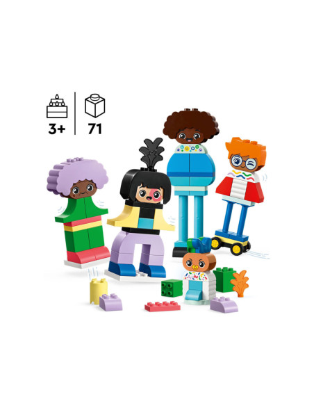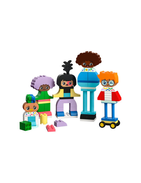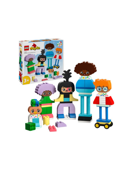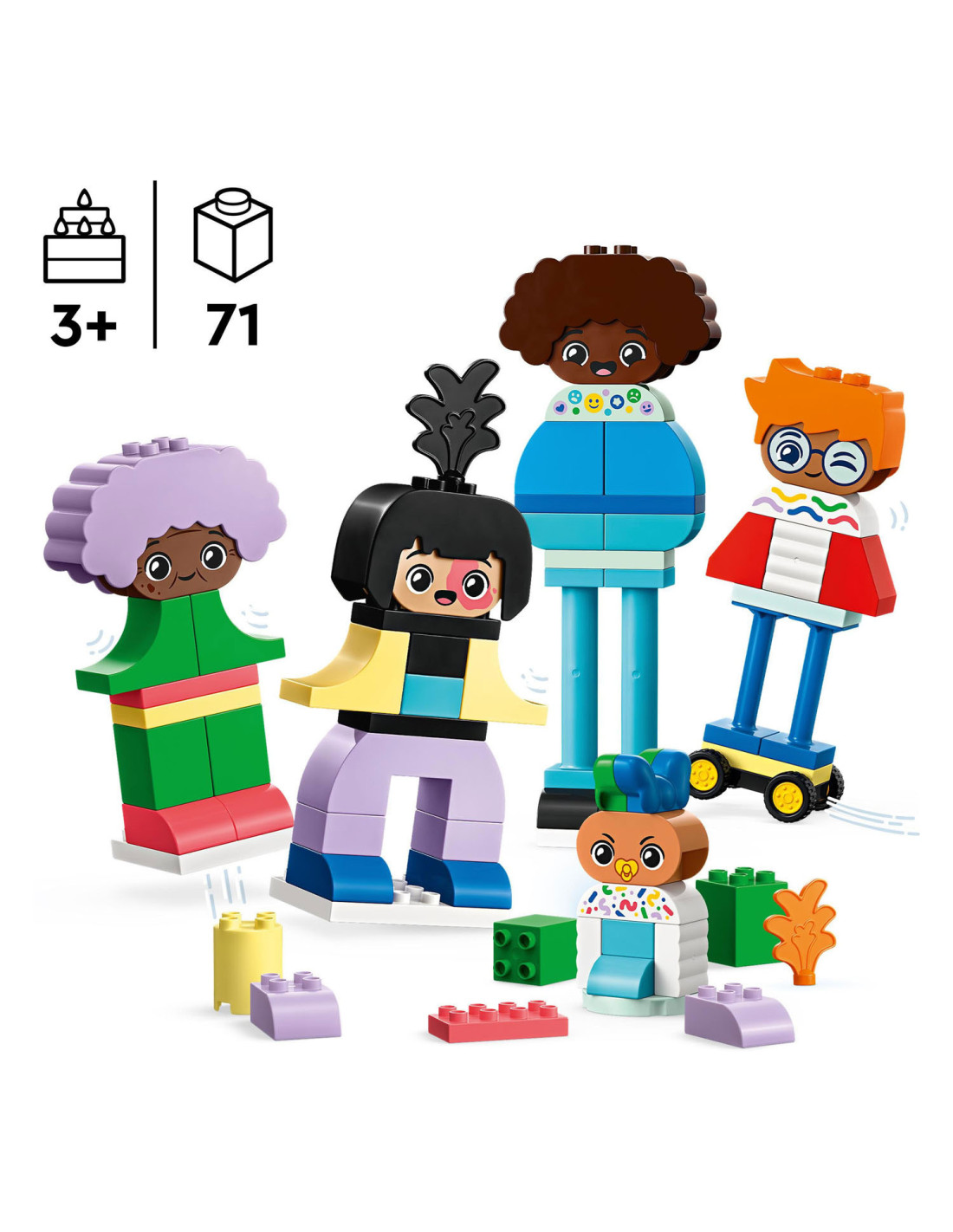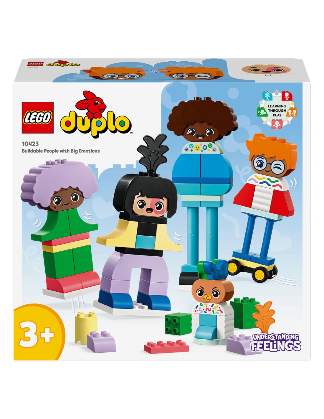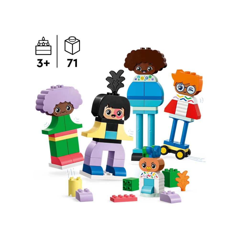 Vul de speeltijd van peuters vanaf 3 jaar met plezier en creativiteit met LEGO DUPLO Stad Mensen en hun emoties (10423). Nieuwsgierige peuters ontdekken dat mensen in alle soorten en maten bestaan en dit educatieve speelgoed helpt ze te begrijpen dat we er misschien heel verschillend uitzien, maar toch allemaal vrienden kunnen zijn.Deze set bevat 71 stenen en onderdelen om 5 bouwbare personages te maken, waaronder 5 pruikstenen en 1 wielbasis. De verbeelding van peuters groeit terwijl ze lichamen, benen, gezichten en kapsels combineren om een eindeloze reeks vriendelijke personages te maken. Met 10 verschillende gezichtsstenen kunnen peuters uitdrukken hoe hun poppetjes zich voelen en beschrijven wat die uitdrukkingen betekenen. De leuke LEGO set met DUPLO figuren is ook een ideale manier om gesprekken te beginnen over hoe anders iedereen is!Dit constructie speelgoed bevat kleurrijke DUPLO bouwstenen in interessante vormen die voor kleine vingertjes aantrekkelijk zijn om te verkennen, waardoor peuters onbeperkt creatief kunnen spelen.Afmetingen �?? deze set bevat 5 figuren die ca. 13 cm tot ca. 26 cm hoog zijn.Bevat 71 onderdelen.