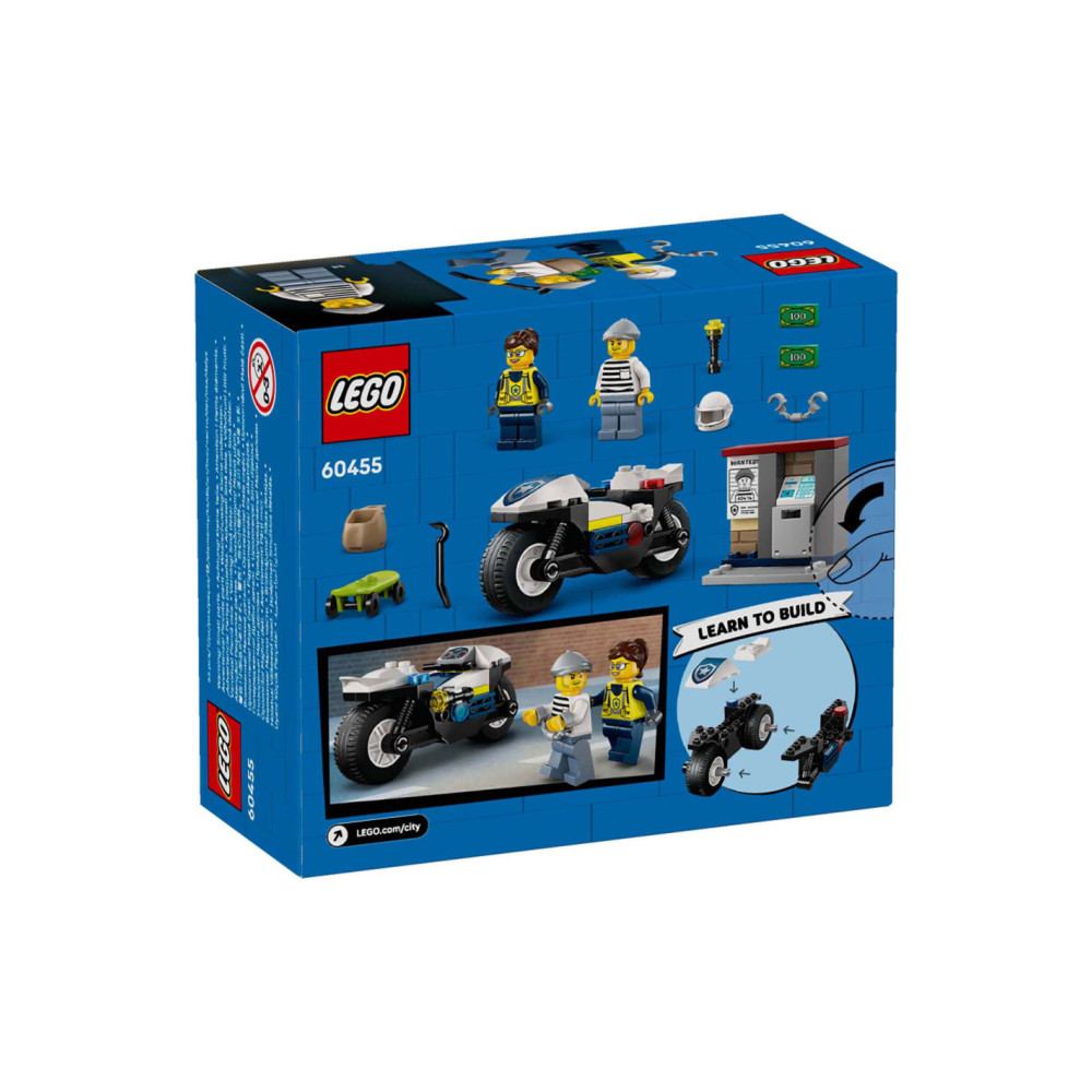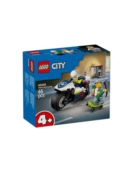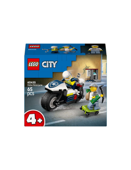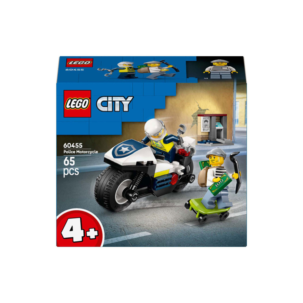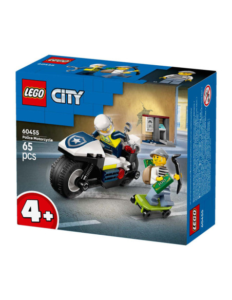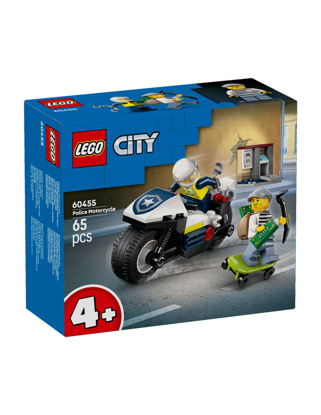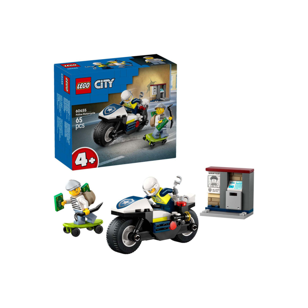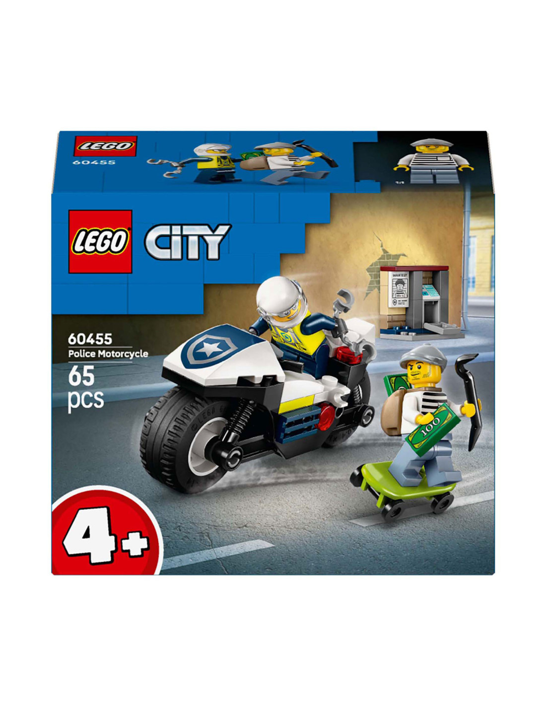 Verras je kleine held met deze LEGO® City Achtervolging op politiemotor (60455) speelset. De set is geschikt voor bouwers vanaf 4 jaar en bevat een coole politiemotor met brede banden, een skateboard waarop een boef ontsnapt en een minigeldautomaat met een speelgoedbankbiljet. Voeg de minifiguren van een politieagent en een boef toe en kinderen kunnen urenlang spelen.