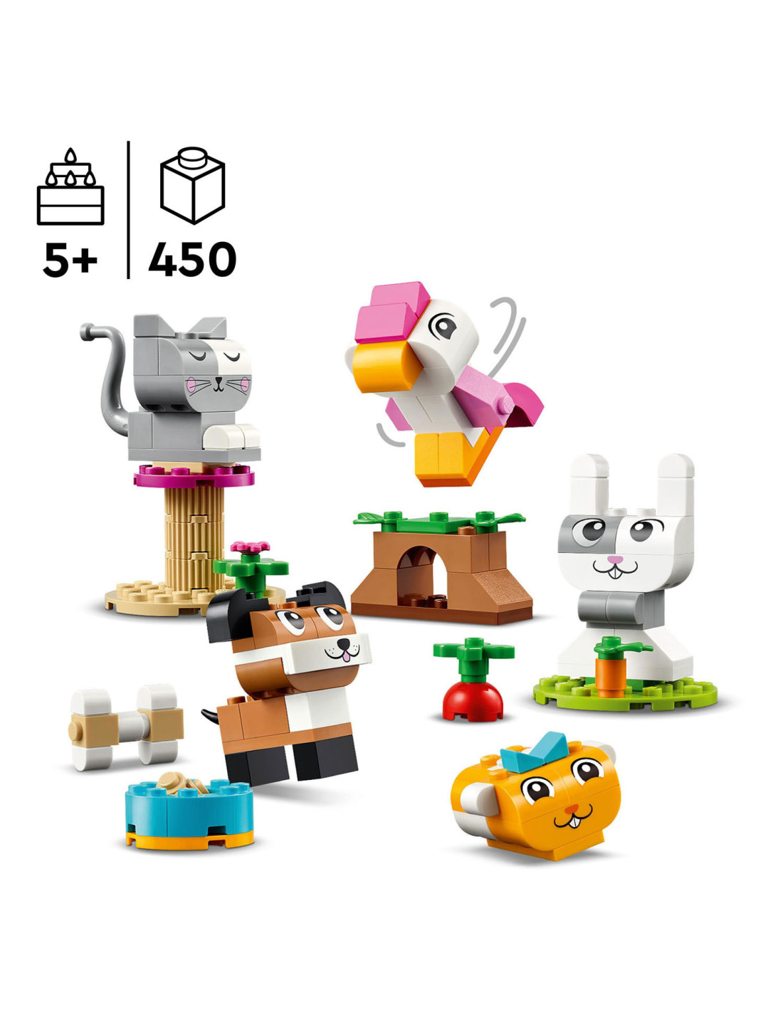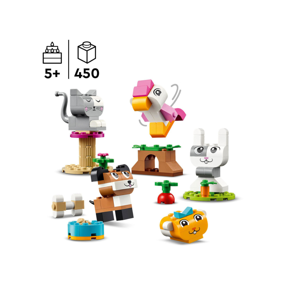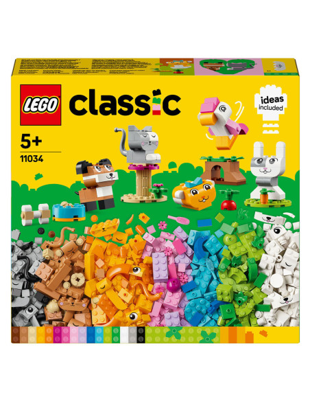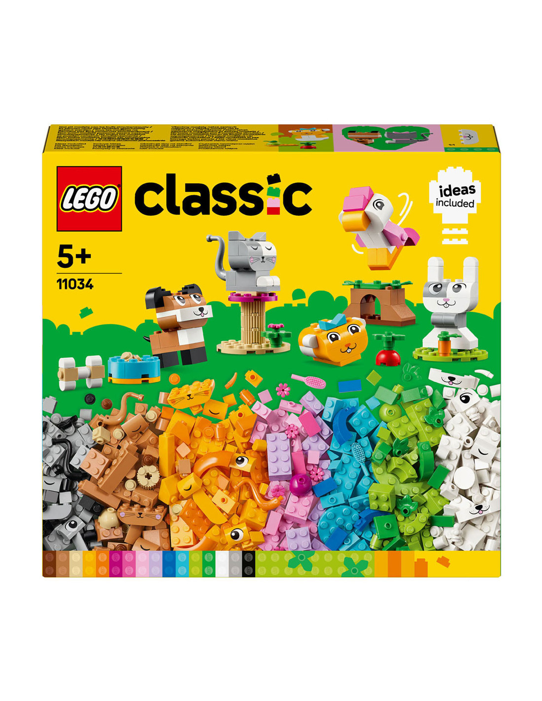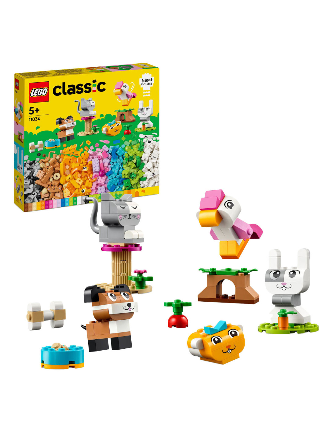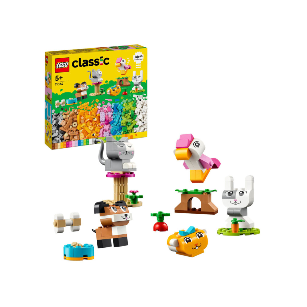 Dierenliefhebbers vanaf 5 jaar kunnen genieten met LEGO Classic Creatieve huisdieren (11034), een inspirerende combinatie van dierenstenen met eenvoudige handleidingen voor een kleurrijke reeks snel te bouwen dieren speelgoed. Het is een geweldige manier om de creatieve vaardigheden van kinderen te stimuleren.Met 450 LEGO bouwstenen, waaronder speciale onderdelen met ogen en monden, en eenvoudige stapsgewijze instructies kunnen kinderen een speelgoed hond bouwen met een voerbak en bot, een speelgoed kat op een krabpaal, een hamster met een appel, een konijn met een wortel en een LEGO vogel op een zitstok. Vervolgens kunnen ze met behulp van de suggesties voor alternatieve kleuren, vormen en functies hun huisdieren op een leuke, nieuwe manier herbouwen en hun eigen ideeën uitproberen. Er wordt een gids met 10 ideeën meegeleverd om het vrije bouwplezier een boost te geven. Kinderen die ervan houden om dieren te verzorgen, zullen dol zijn op deze LEGO dieren set.LEGO Classic speelgoed zit vol ideeën en inspiratie, waarmee ouders bouwplezier en mijlpalen in de ontwikkeling met hun kinderen kunnen delen. Leuk als cadeau voor meisjes en jongens vanaf 5 jaar die van dieren houden!Afmetingen: eenmaal gebouwd is het hondenmodel ca. 5 cm hoog en de kat op de krabpaal ca. 7 cm hoog.Bevat 450 onderdelen.
