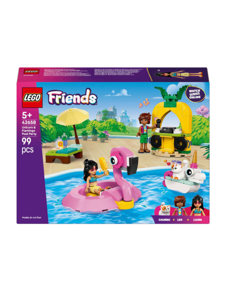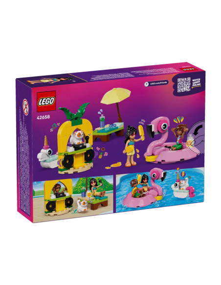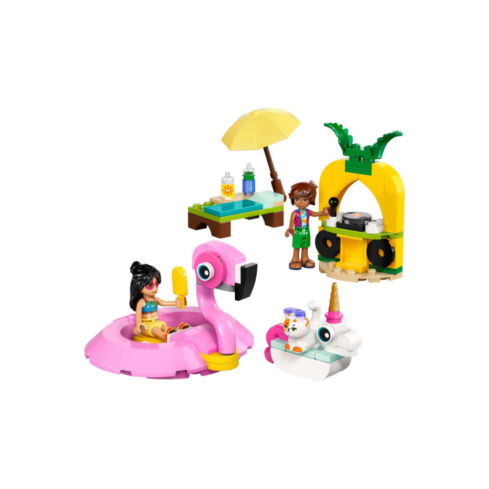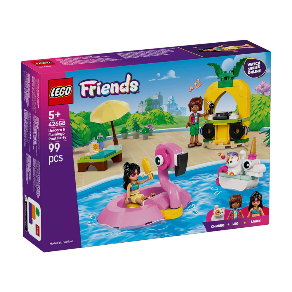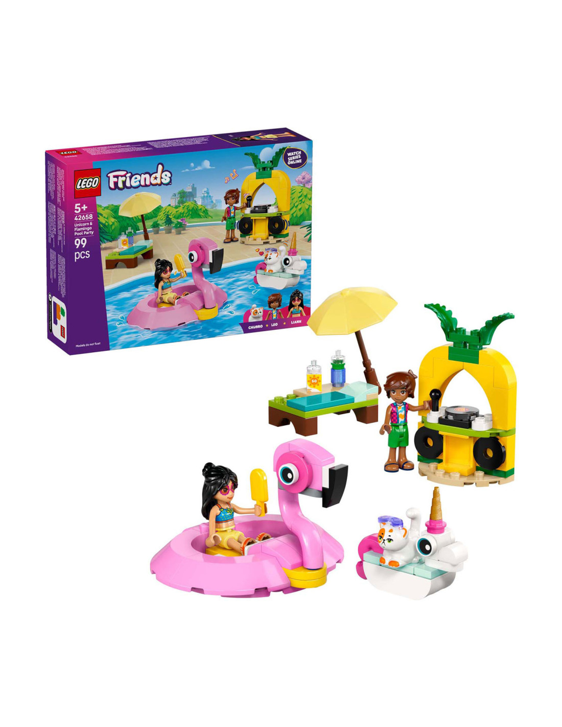 Deze fantasierijke bouwset laat kinderen verhalen vertellen over een LEGO® Friends Zwembadfeestje met flamingo en eenhoorn (42658). De set voor meisjes en jongens vanaf 5 jaar bevat 2 zwembanden om zelf te bouwen, zomerse accessoires, 2 LEGO Friends minipoppetjes en een kat.
