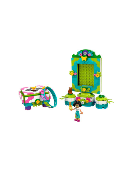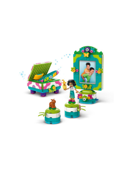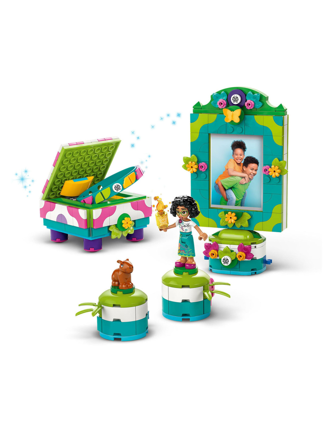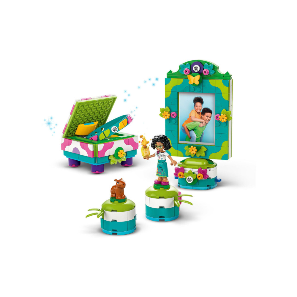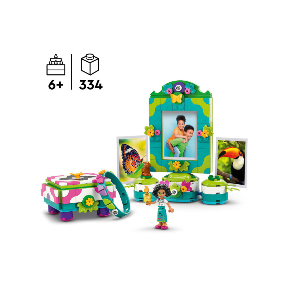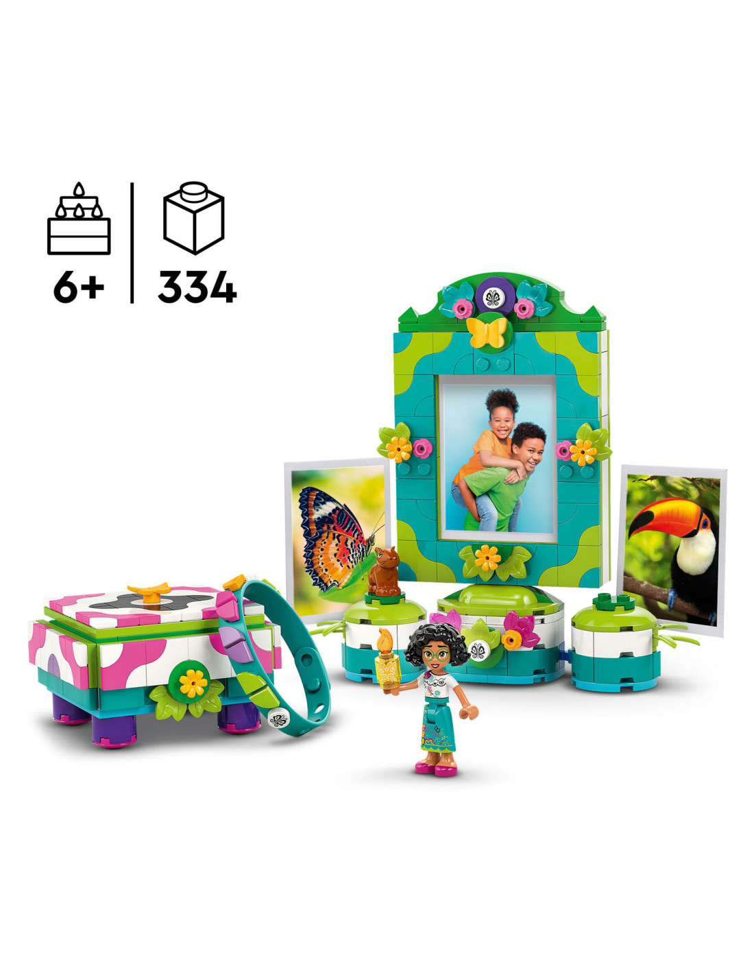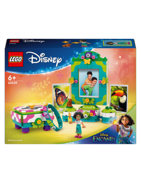Spreek Disney fans van 6 jaar en ouder aan met dit creatieve LEGO �? Disney Encanto Mirabels fotolijstje en sieradendoos (43239) bouwpakket voor kinderen. De set bestaat uit een juwelendoosje met ruimte voor de meegeleverde armband, plus een fotolijstje en standaard met extra clips voor kleine foto's en 2 plekken voor het Mirabel LEGO �? Disney poppetje en de LEGO �? Disney capibarafiguur. Deze kleurrijke Disney set met meerdere voorwerpenis gemaakt om creatieve kinderen te inspireren.Het is een leuk Disney cadeau voor meisjes, jongens en fans die op zoek zijn naar een nieuwe creatieve hobby en houden van de Encanto Disney film en rollenspellen. Bouwers genieten ook van een eenvoudige en intuïtieve bouwervaring met de LEGO Builder app. Hiermee kunnen ze inzoomen en modellen in 3D draaien, sets opslaan en hun voortgang bijhouden.Deze set is gemaakt voor korte speelsessies en kan worden toegevoegd aan andere LEGO sets en bouwbaar LEGO �? Disney speelgoed uit de serie (elke set is apart verkrijgbaar) om het speelplezier uit te breiden. Na het bouwen, kunnen de sets gebruikt worden als Disney decoratie in de slaapkamer of ergens anders.Afmetingen: deze speelset bevat een bouwbaar fotolijstje van ca. 15 cm hoog, 14 cm breed en 5 cm diep.Bevat 334 onderdelen.