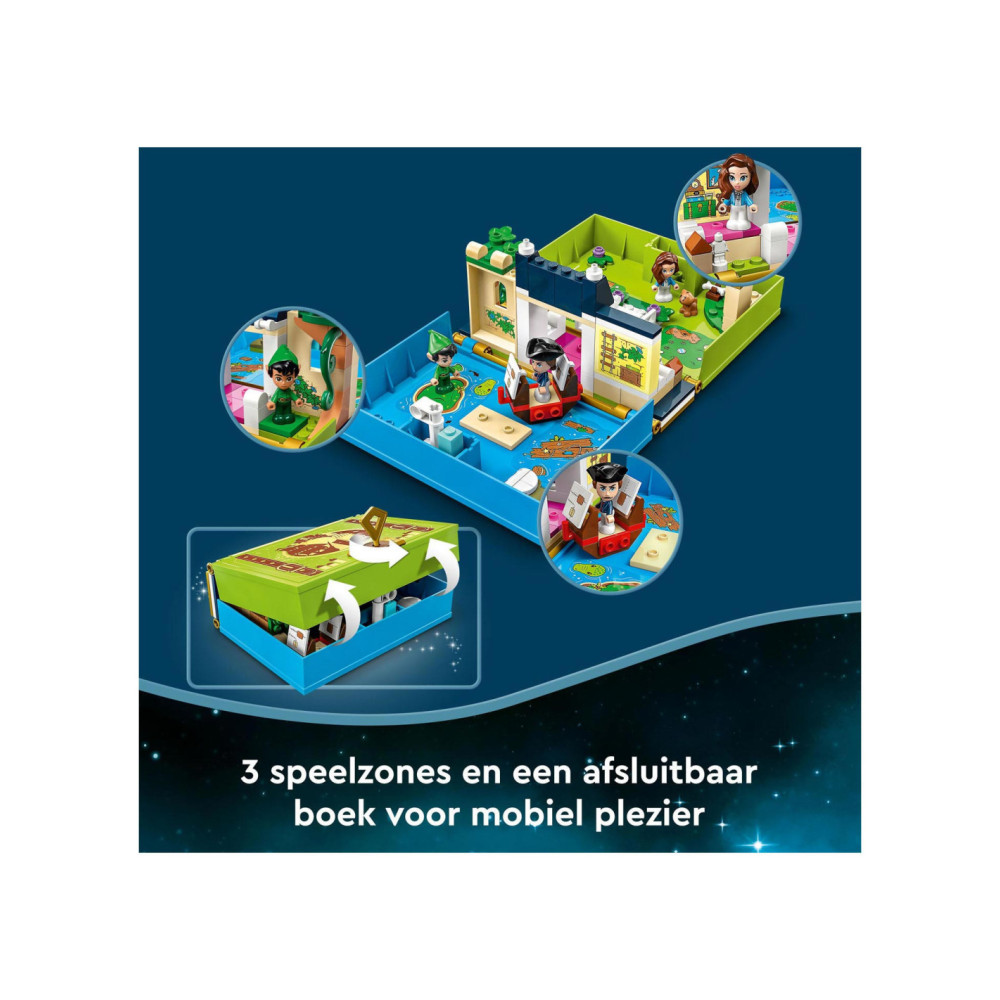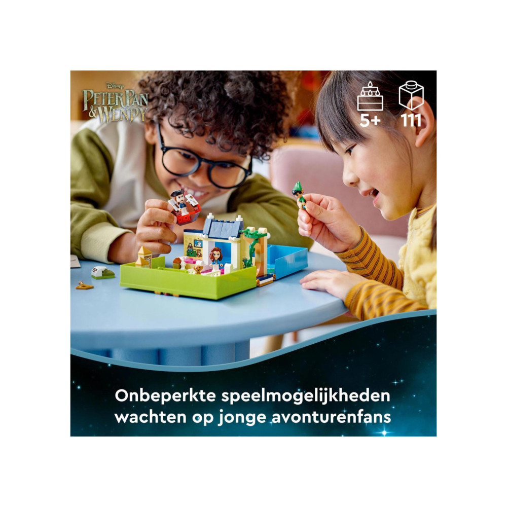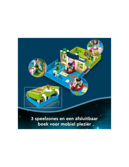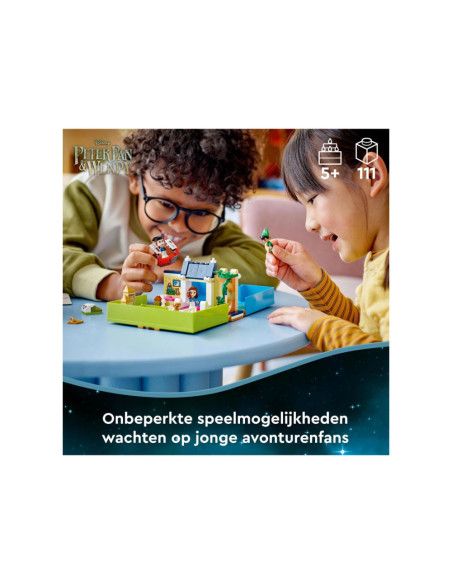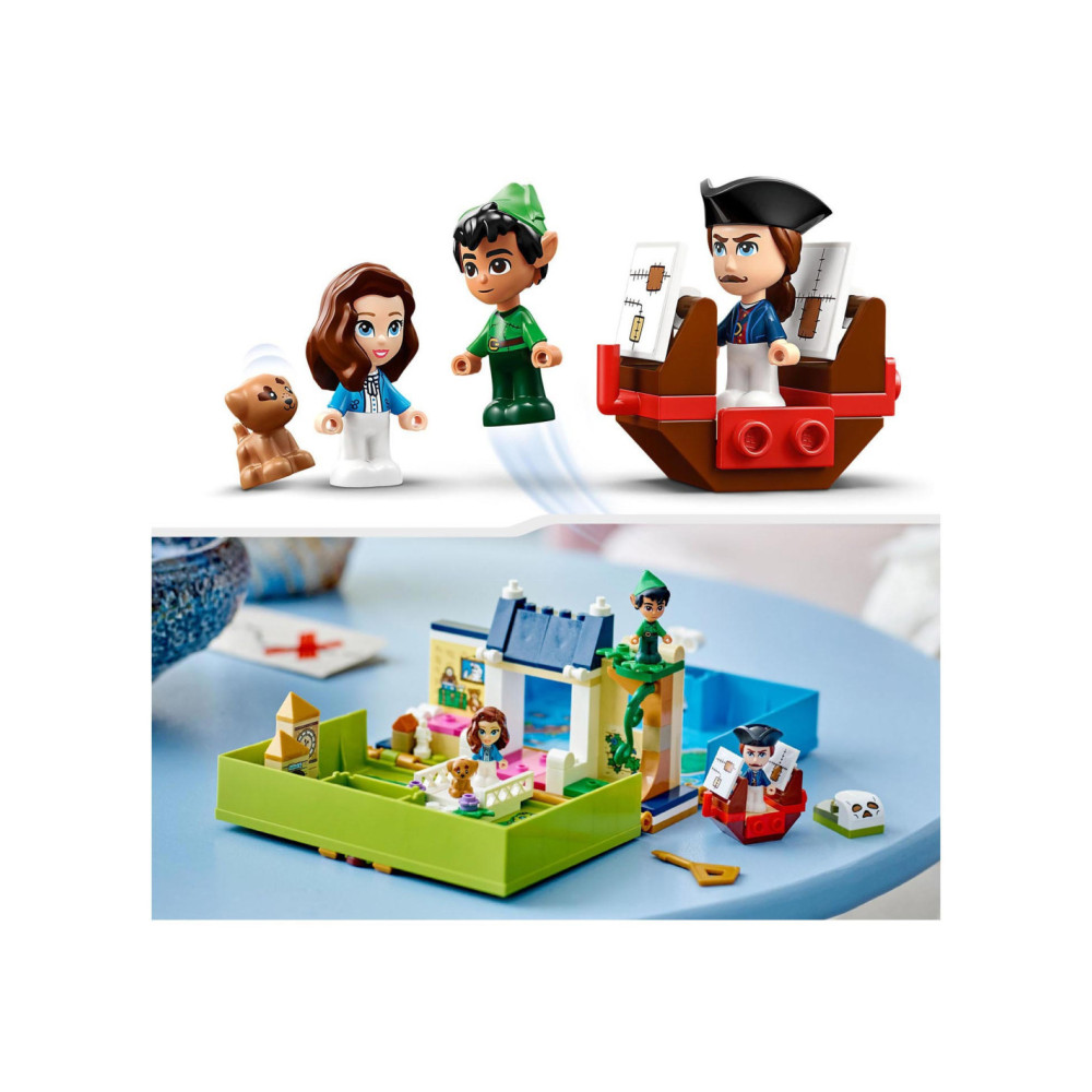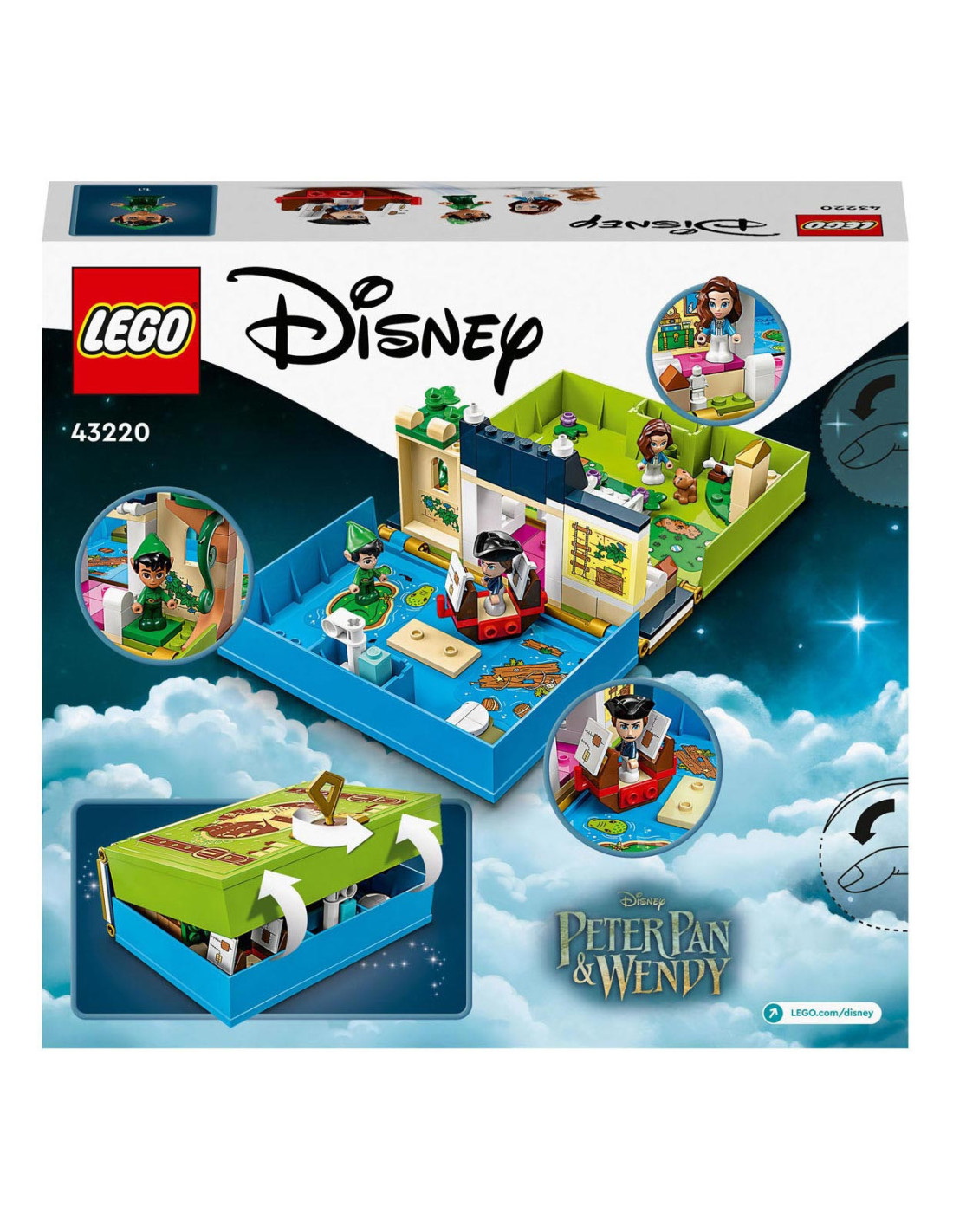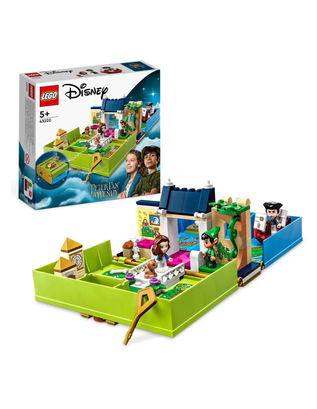 Eindeloze verhalen wachten op kleine Disney-fans in deze bouwbare LEGO Disney Peter Pan Verhalenboekavontuur (43220) speelset. Het boek is gebaseerd op de nieuwe Peter Pan & Wendy film en bevat het Darling huis met een slaapkamer, Big Ben, de schuilplaats van de Verloren Jongens, Skull Island, een piratenschip, 3 minipoppetjes, waaronder Kapitein Haak, een schattig Nana hondenfiguurtje en een sleutel voor eindeloos bouwplezier.