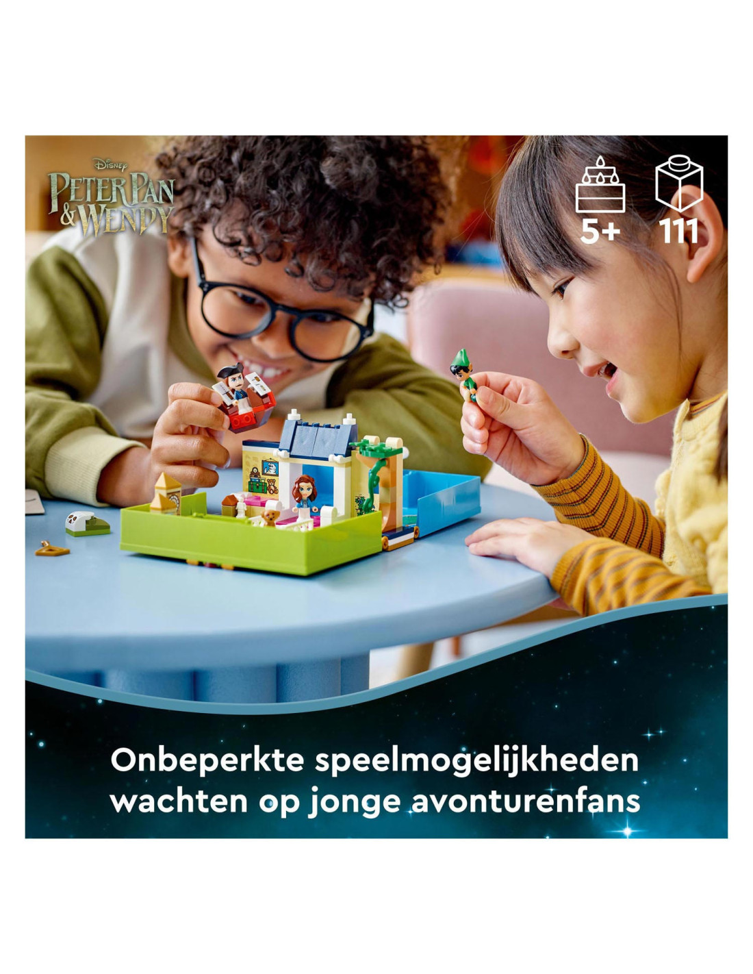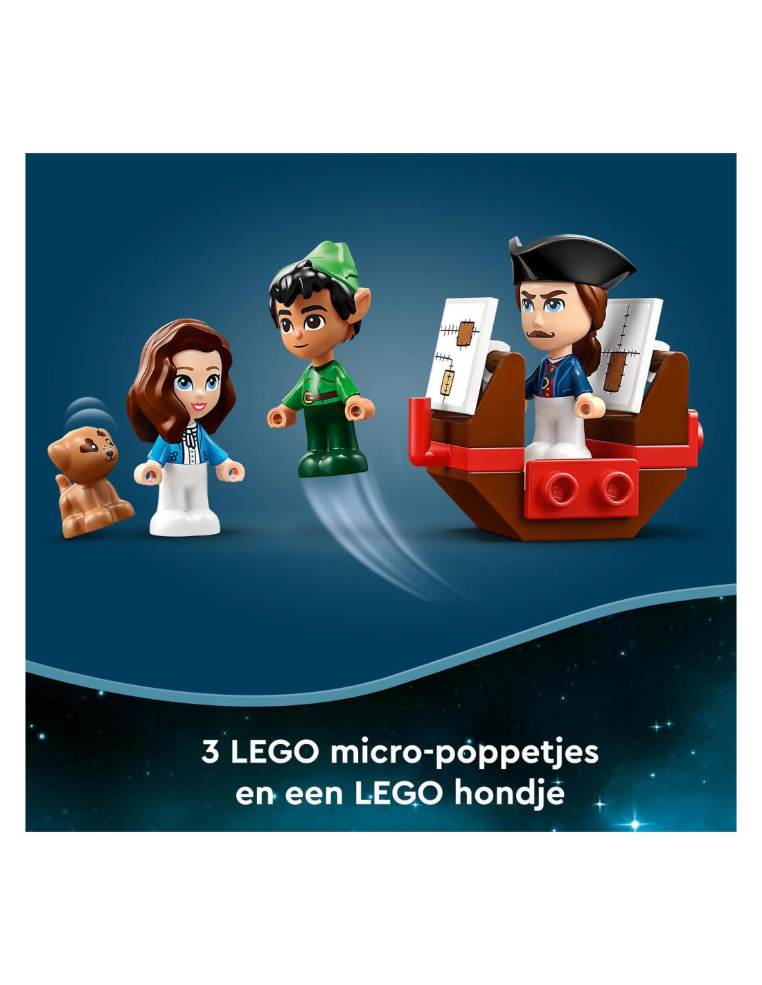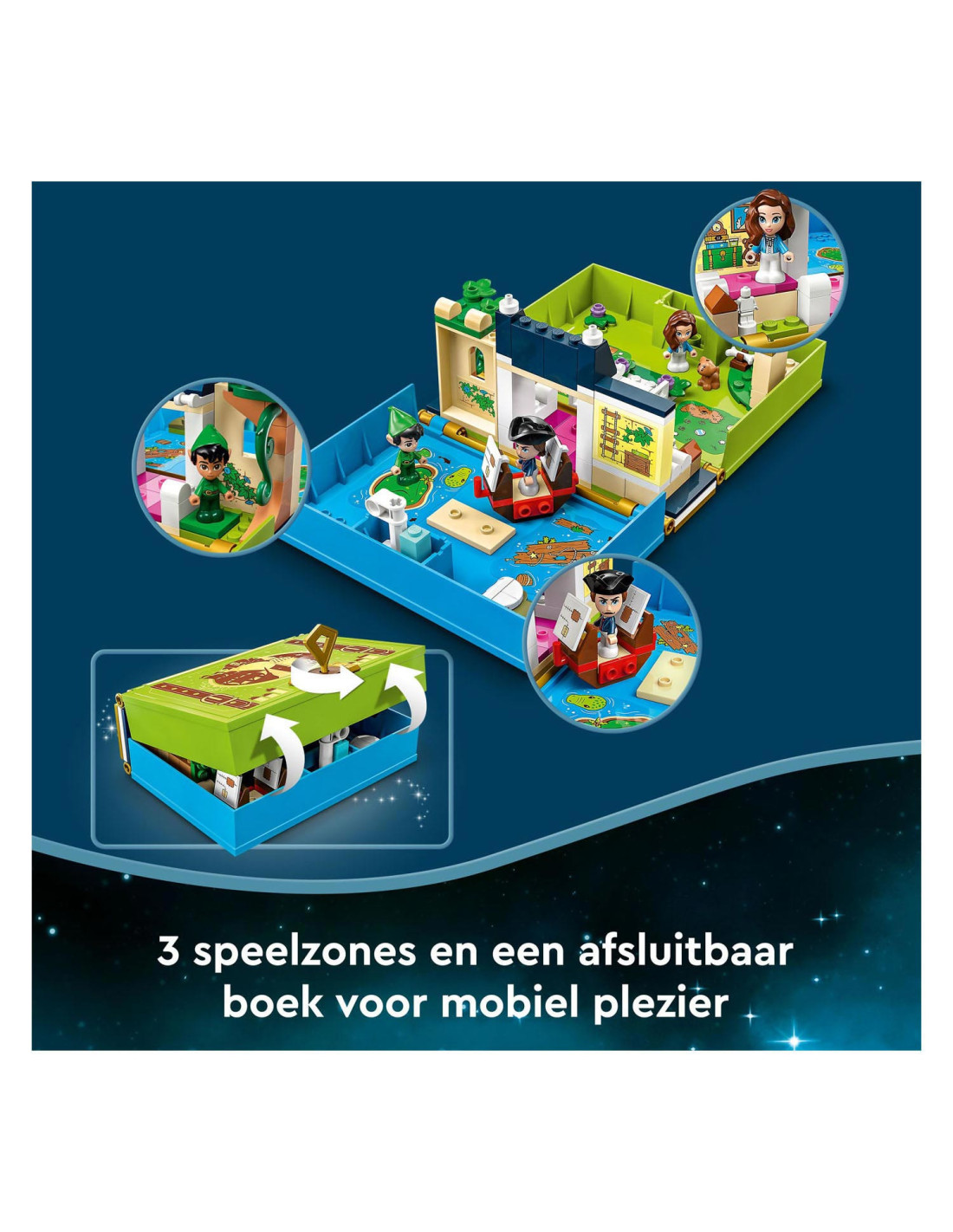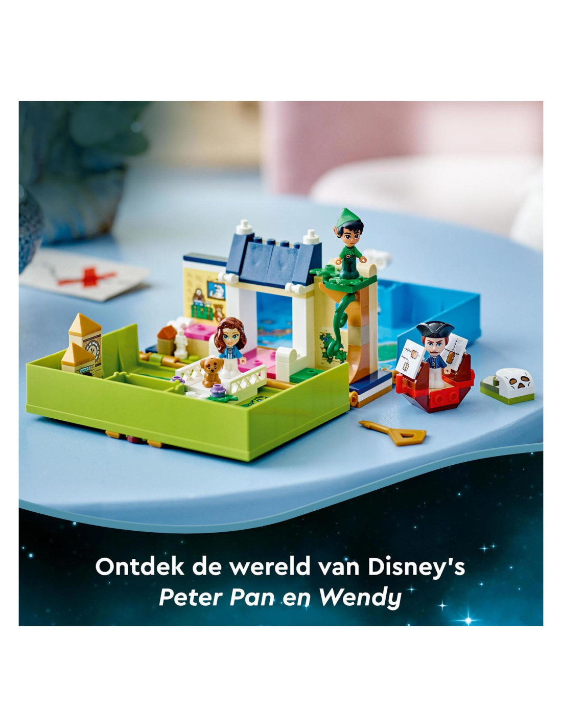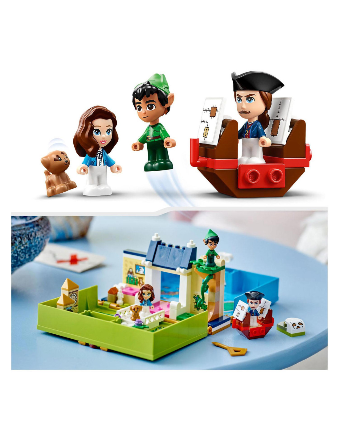 Eindeloze verhalen wachten op kleine Disney-fans in deze bouwbare LEGO Disney Peter Pan Verhalenboekavontuur (43220) speelset. Het boek is gebaseerd op de nieuwe Peter Pan & Wendy film en bevat het Darling huis met een slaapkamer, Big Ben, de schuilplaats van de Verloren Jongens, Skull Island, een piratenschip, 3 minipoppetjes, waaronder Kapitein Haak, een schattig Nana hondenfiguurtje en een sleutel voor eindeloos bouwplezier.
