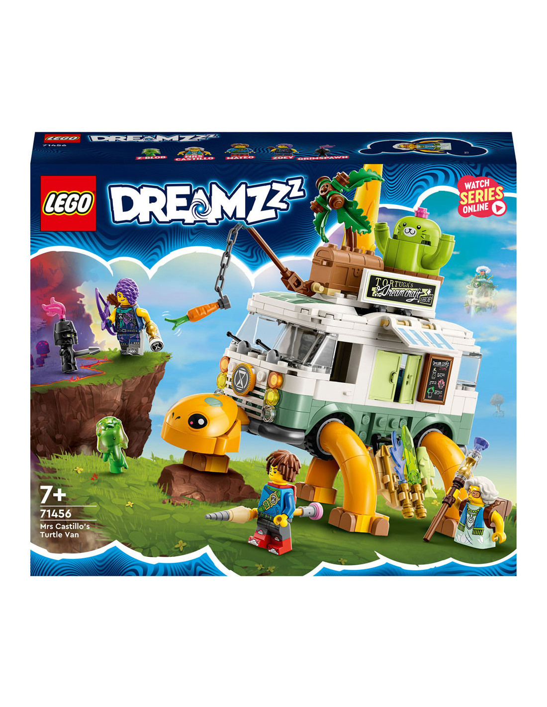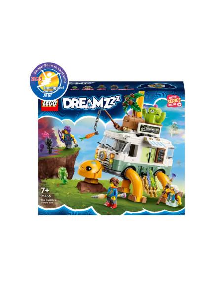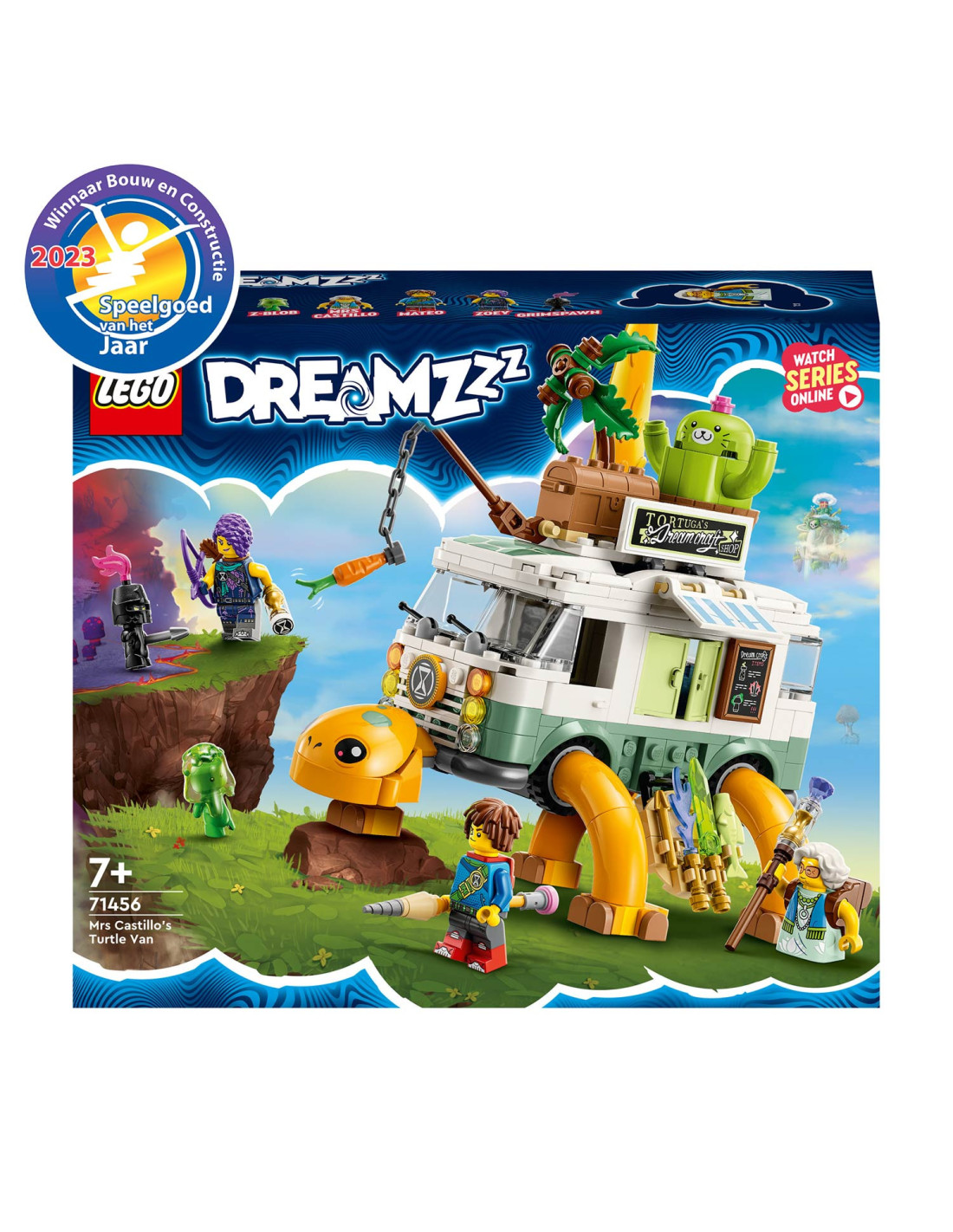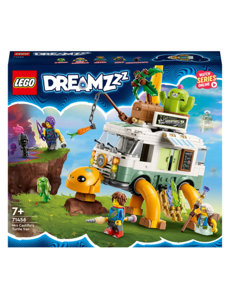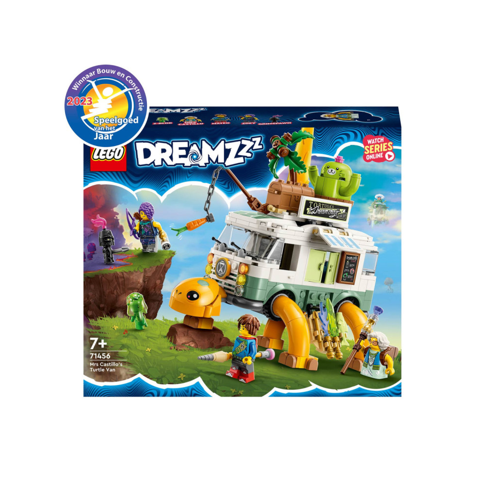 Laat kinderen van 7 jaar en ouder op avontuur gaan in de droomwereld met mevr. Castillo, Mateo en Zoey in deze LEGO DREAMZzz Mevr. Castillo's schildpadbusje (71456) bouwset. De set is gebaseerd op de spannende tv-serie DREAMZzz en biedt 2 manieren om een geweldig voertuig te bouwen.1 busje, 2 manieren om te bouwenDe wagen van mevrouw Castillo heeft beweegbare wielen en een afneembaar dak. Kinderen kunnen hem op 2 manieren aanpassen met behulp van de bouwinstructies op basis van verhalen. In de feestmodus kan het schildpadbusje worden uitgerust met een beweegbare boom, een draaiende cactus en een schatkist die open kan. In de vliegende onderzeeërmodus kunnen kinderen een raket en een bewegende periscoop toevoegen. Deze versie bevat ook een versie van de Cactuskat, die ernaast kan vliegen. Dubbel zo veel creativiteit en speelplezier dus!Fantastische minifigurenDe bouw- en speelset is inclusief minifiguren van mevrouw Castillo, Mateo en Zoey, die allemaal in het busje kunnen zitten.