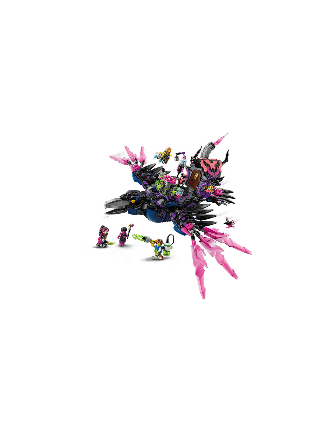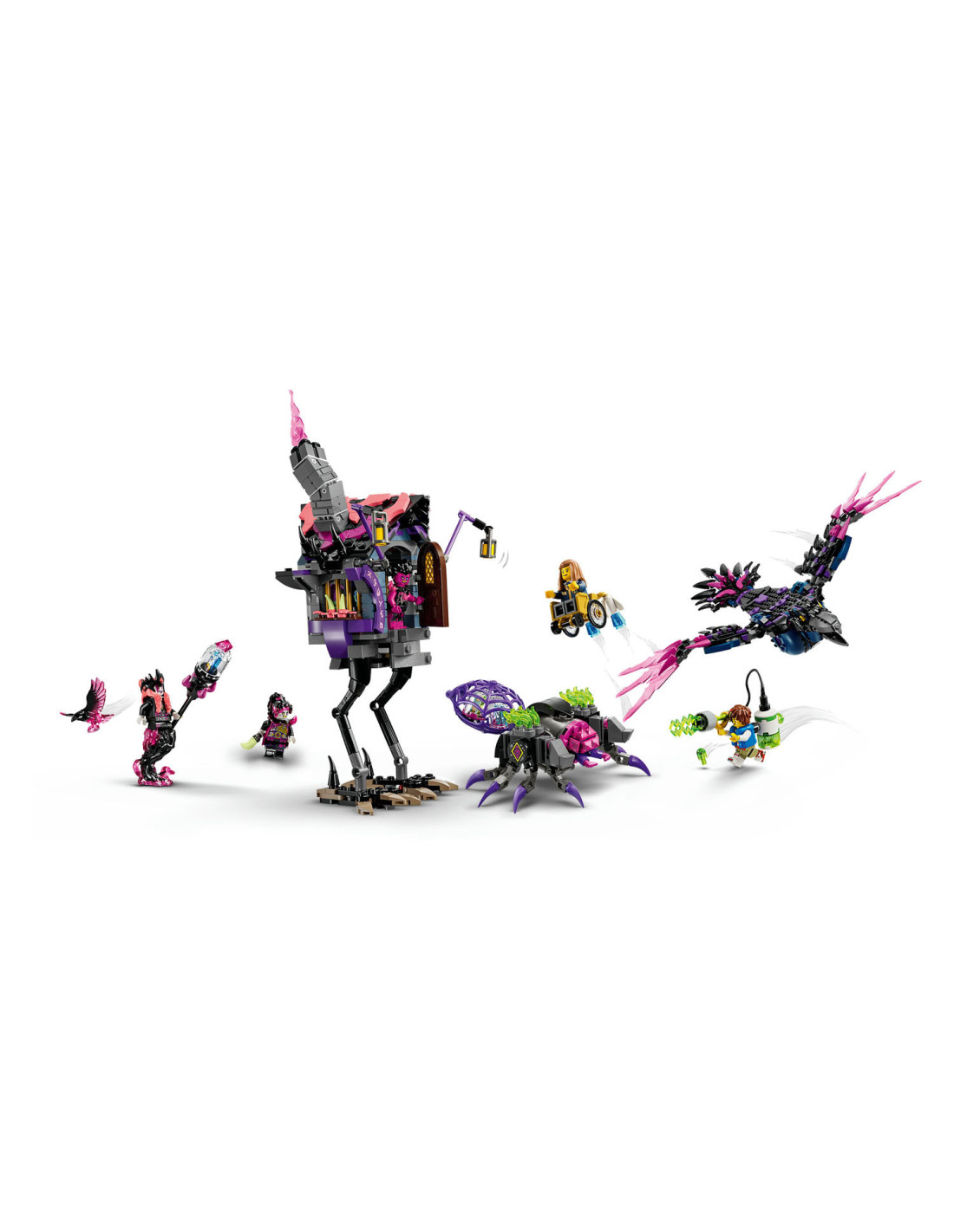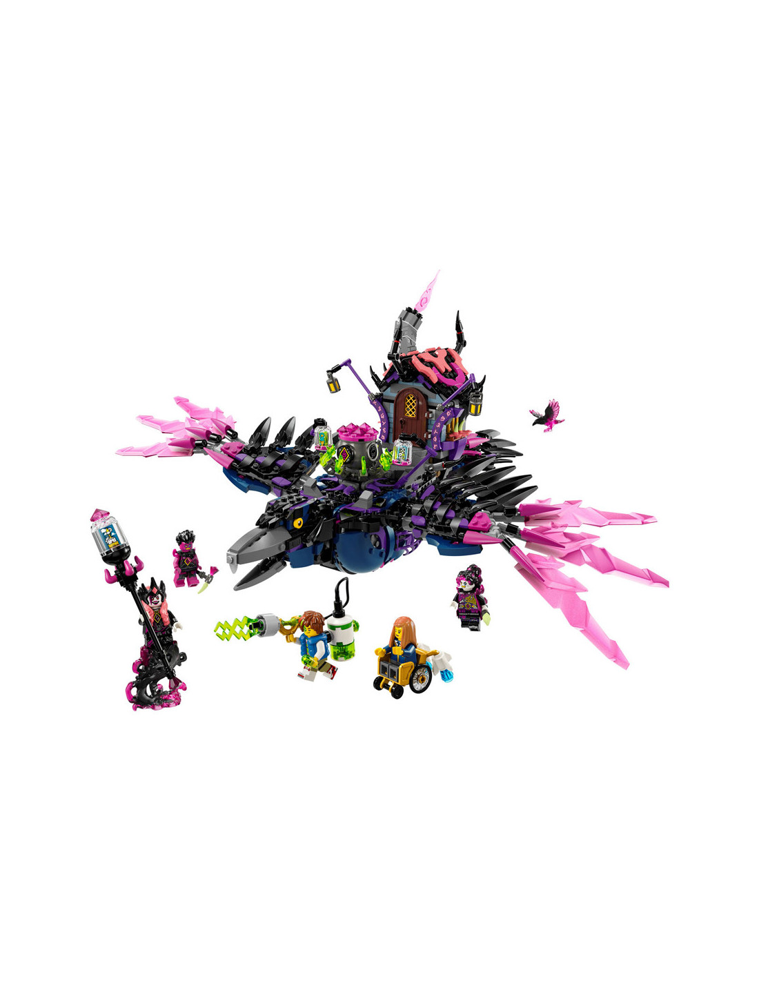 Jonge dromers zullen veel plezier beleven aan het bouwen van de Middernachtraaf van de Neder Heks voordat ze hem veranderen in een ravenhut of 3 nachtmerriewezens: een wandelend huis, een ketelspin en een gigantische raaf! Het speelgoed huis heeft een dak en deur die open kunnen, de spin heeft een beweegbare kooi en poten en de LEGO vogel heeft verstelbare vleugels en veren.