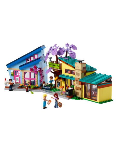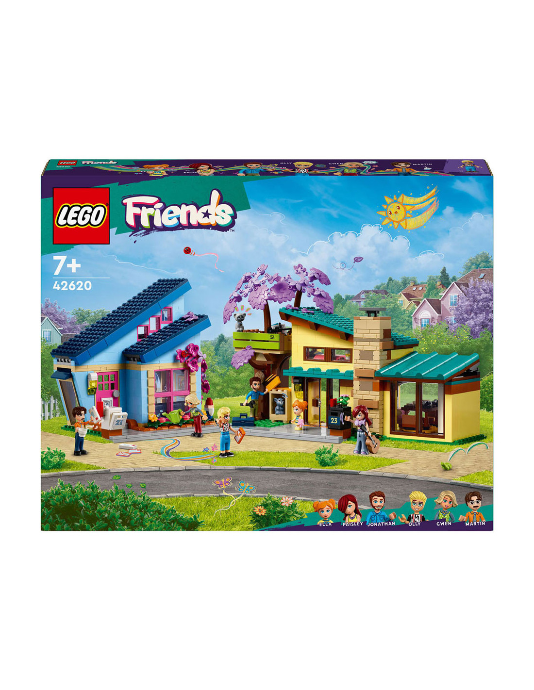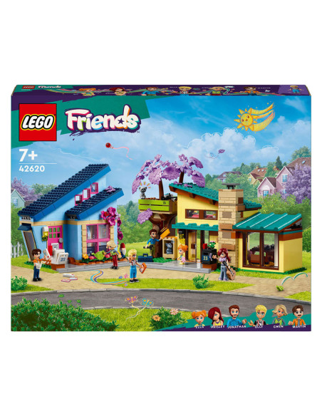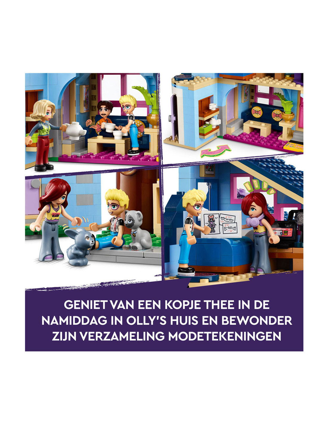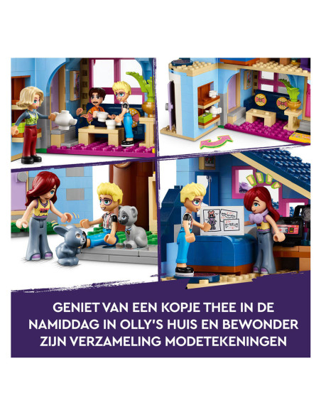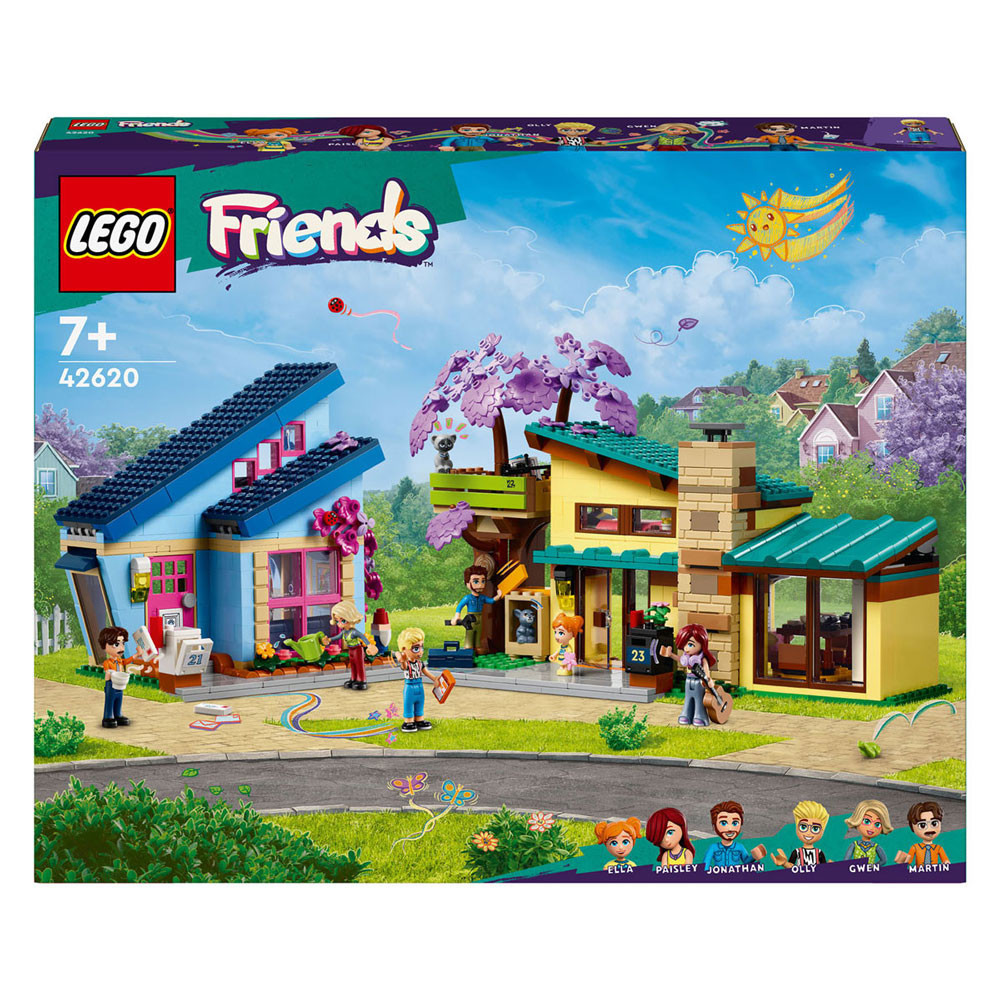 Creatief spelen is heel leuk met deze LEGO Friends Olly en Paisley's huizen (42620) set voor meisjes en jongens vanaf 7 jaar. Met deze speelgoed poppenhuizen set kunnen kinderen de vriendschap tussen de buurkinderen LEGO Friends Olly en Paisley ontdekken. De set wordt geleverd met 5 LEGO Friends mini poppetjes, een micropoppetje, 2 speelgoed dieren en accessoires.Deze LEGO poppenhuis bouw- en speelset bevat de speelgoed huizen van Olly en Paisley met twee verdiepingen, plus de boomhut die ertussen staat. Olly's huis heeft een gezellige woonkamer met accessoires om een kopje thee te drinken en een badkamer beneden. In Olly's kamer staat een bed en een voerbakje voor zijn speelgoed kat, plus een nachtkastje en Olly's verzameling modetekeningen.Paisley's huis heeft een keuken met een eettafel, een fornuis en een koelkast met etensaccessoires. Boven is de slaapkamer die Paisley deelt met haar zusje. Hier bewaart ze haar gitaar en foto's van haar vrienden. Deze set is een leuk cadeau voor kinderen die houden van familiespeelgoed, rollenspellen en speelhuizen.Afmetingen: deze set is ca. 19 cm hoog, 46 cm breed en 23 cm diep.Bevat 1126 onderdelen.