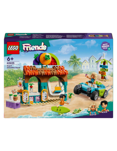 Stimuleer kinderen om creatief aan de slag te gaan met deze LEGO® Friends Strand smoothiekraam (42625) speelset met etenswaren voor meisjes en jongens vanaf 6 jaar. De set bevat een bouwbare smoothiekraam en strandbuggy, plus LEGO Friends Nova en Niko minipoppetjes.
