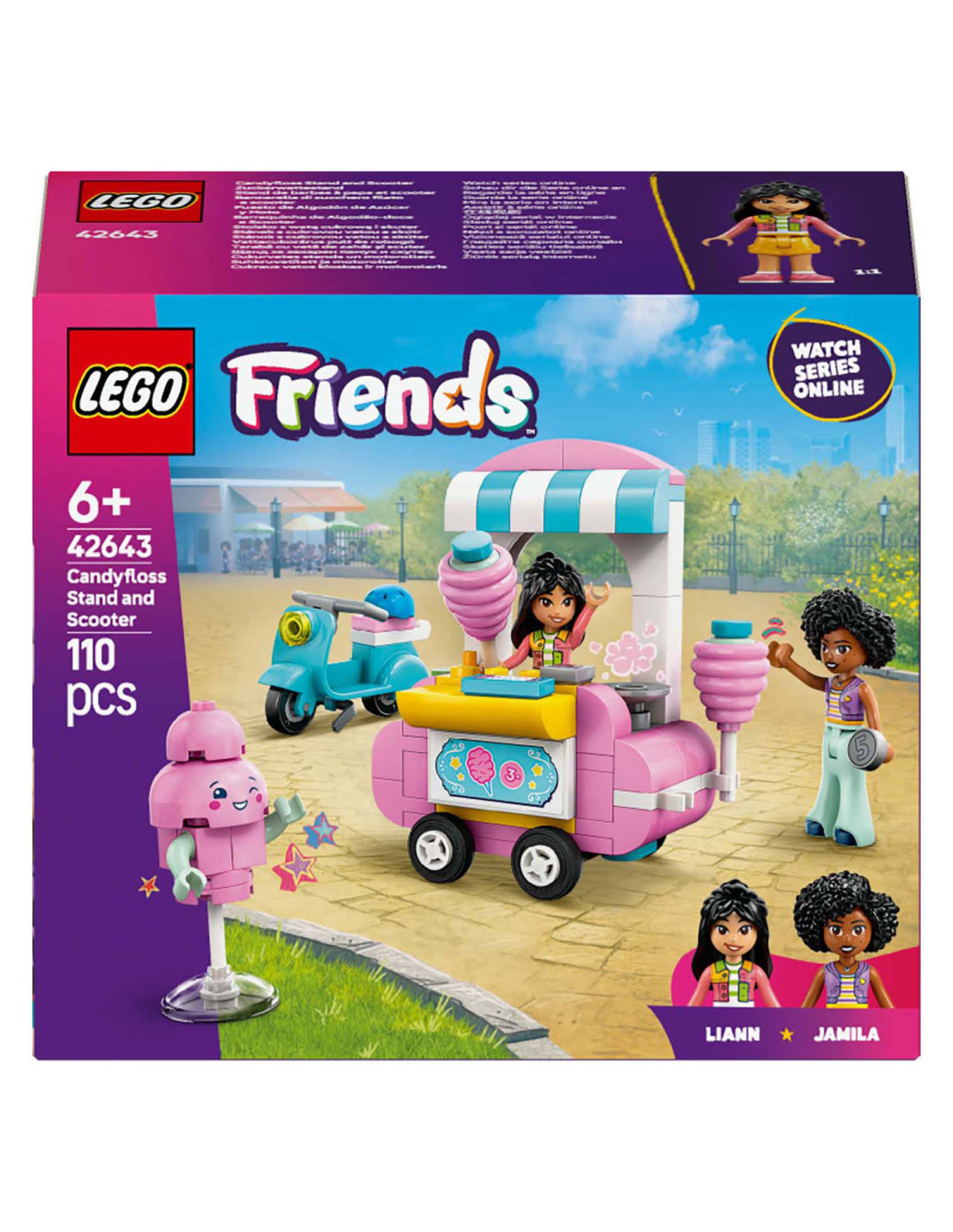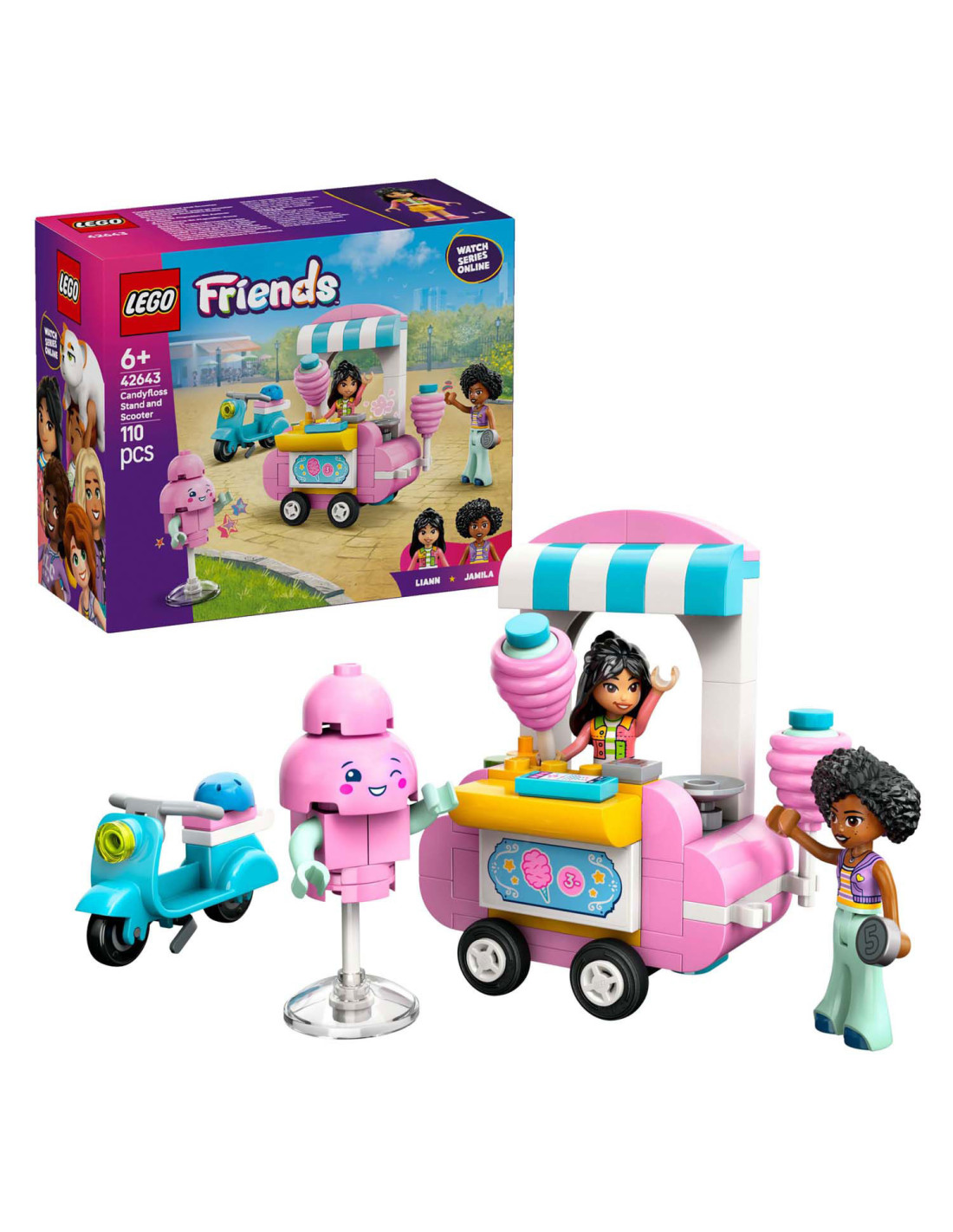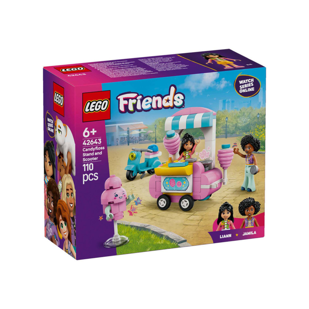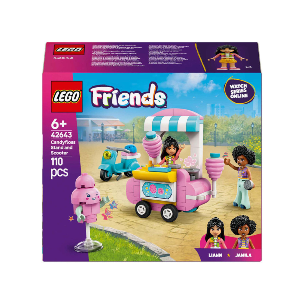 Inspireer kinderen vanaf 6 jaar met zoet fantasiespel met de LEGO® Friends Suikerspinkraam en scooter (42643) speelgoedset. De set bevat 2 LEGO Friends minipoppetjes plus een bouwbare mobiele eetkraam, scooter, mascotte en accessoires.