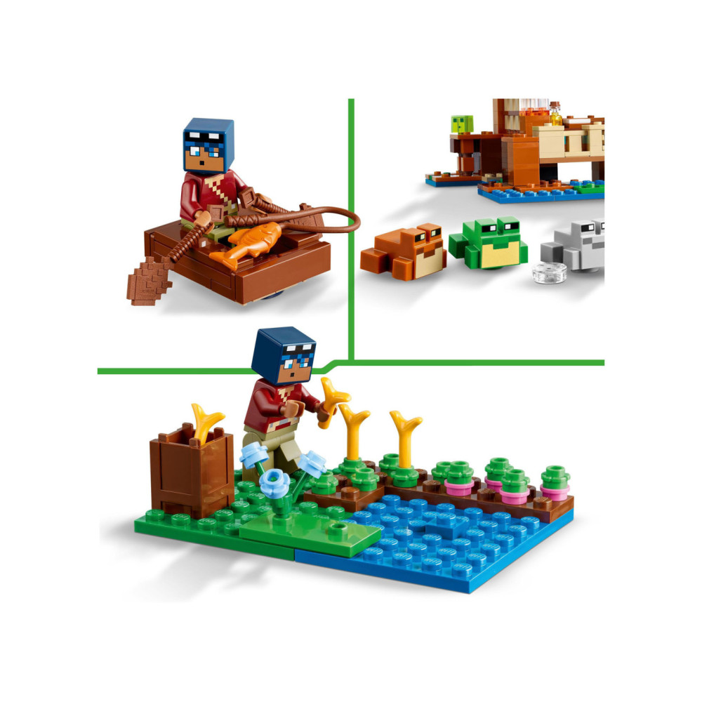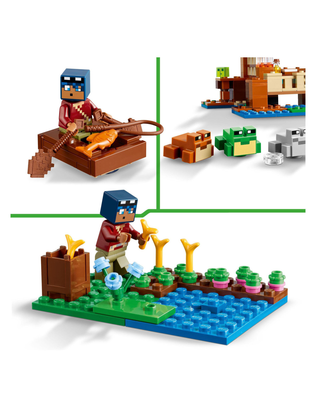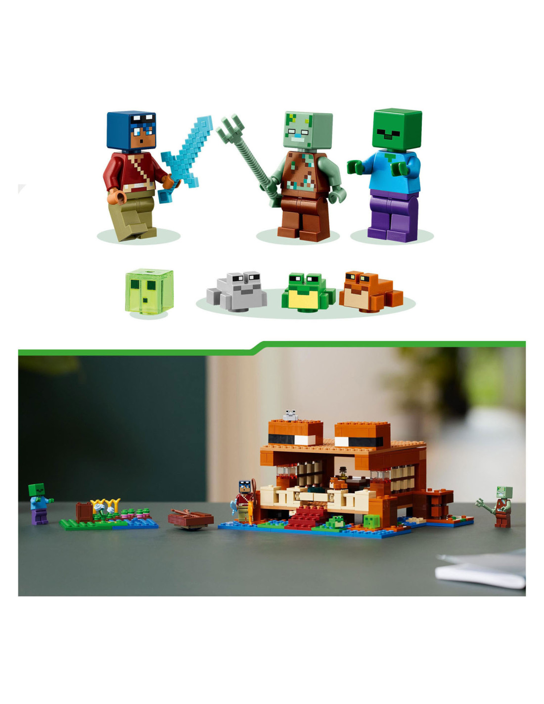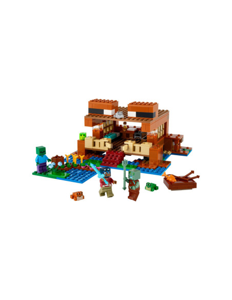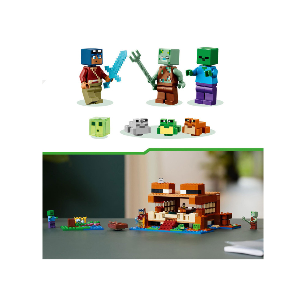 Dit LEGO Minecraft speelgoed huis heeft de vorm van een kikker en wordt geleverd met Minecraft figuren van populaire personages uit de game. LEGO Minecraft Het kikkerhuis (21256) is een leuke en praktische set voor kinderen!Het kikkerhuis zit vol authentieke Minecraft details: een bed, tafel, werkbank, oven, kist, taart en honing en een afneembaar dak voor gemakkelijke toegang. Buiten is een boerderij waar spelers bieten, tarwe en bloemen kunnen oogsten en een meer waar kinderen een hengel en een donker eikenhouten speelgoed boot met roeispanen kunnen gebruiken. Er zijn 3 soorten kikker dieren figuren (groen, grijs en bruin) en een slijm dat, zoals spelers zullen weten, een speciale interactie heeft met kikkers.Deze veelzijdige LEGO Minecraft set bevat een held, een zombie en een drenkeling met drietand voor urenlang plezier met rollenspellen. Jonge bouwers zullen ook dol zijn op de LEGO Builder app, waarmee ze kunnen inzoomen, modellen kunnen draaien in 3D en hun voortgang kunnen bijhouden. Een leuk cadeau voor kinderen van 8 jaar en ouder.Afmetingen: het huis is ca. 11 cm hoog, 22 cm breed en 17 cm diep.Bevat 400 onderdelen.