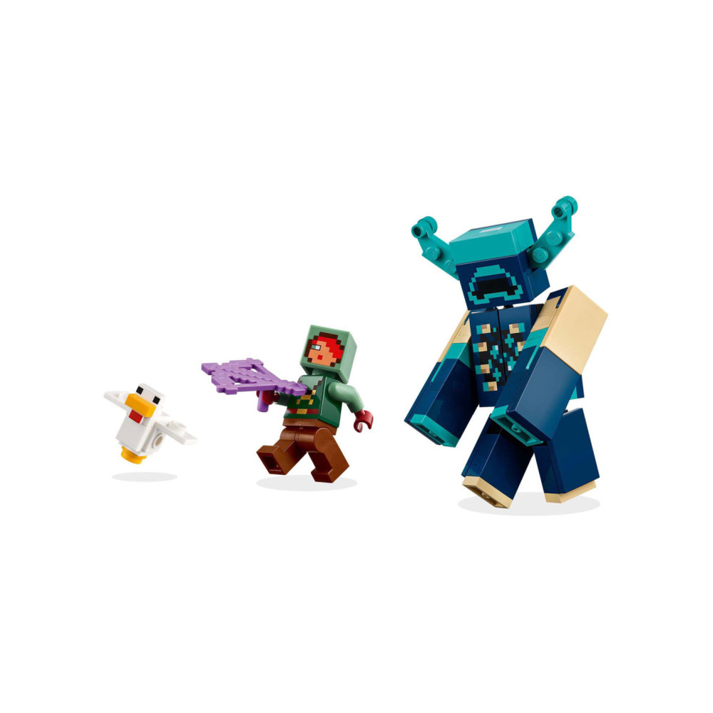 Minecraft® speelgoedfiguren – deze LEGO® set bevat een minifiguur van de Minecraft Stille Opzichter, een Minecraft kip en een grote, bouwbare figuur van de Minecraft Opzichter met een verstelbaar hoofd, armen en benen