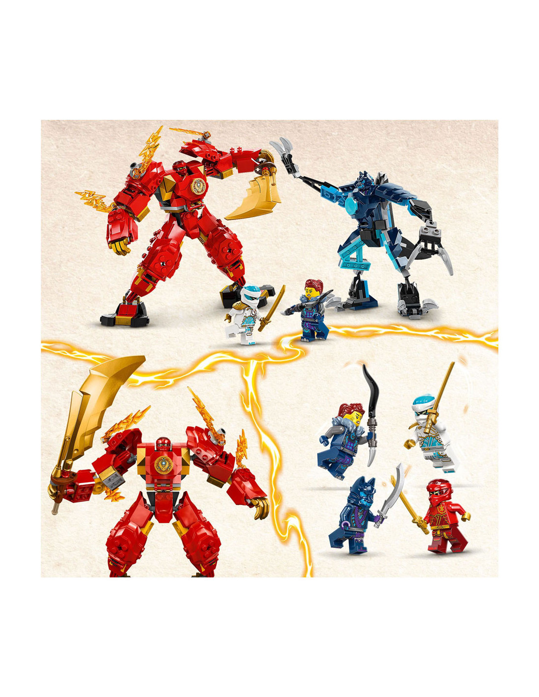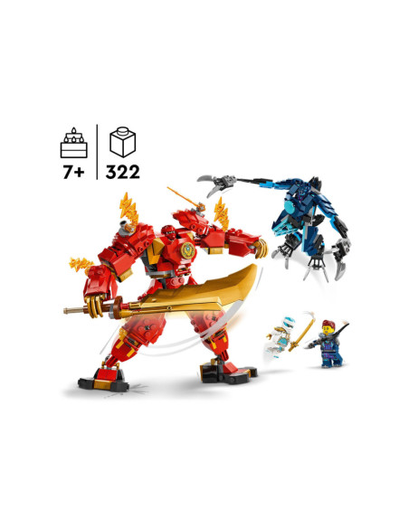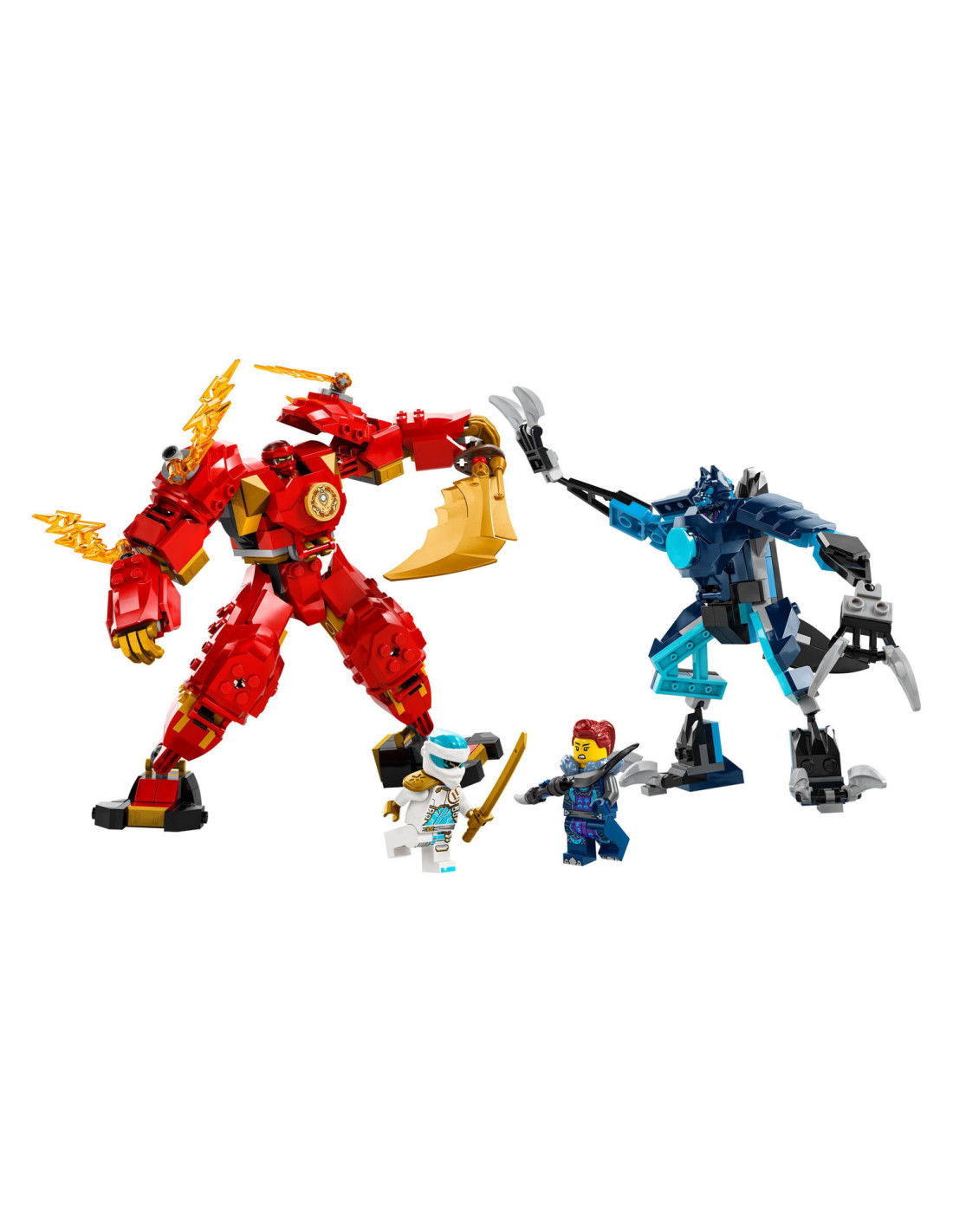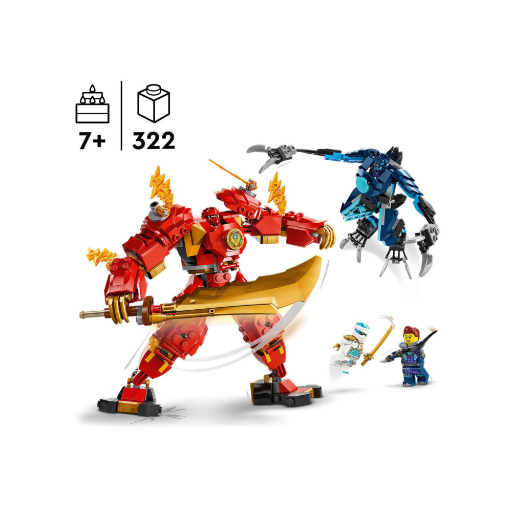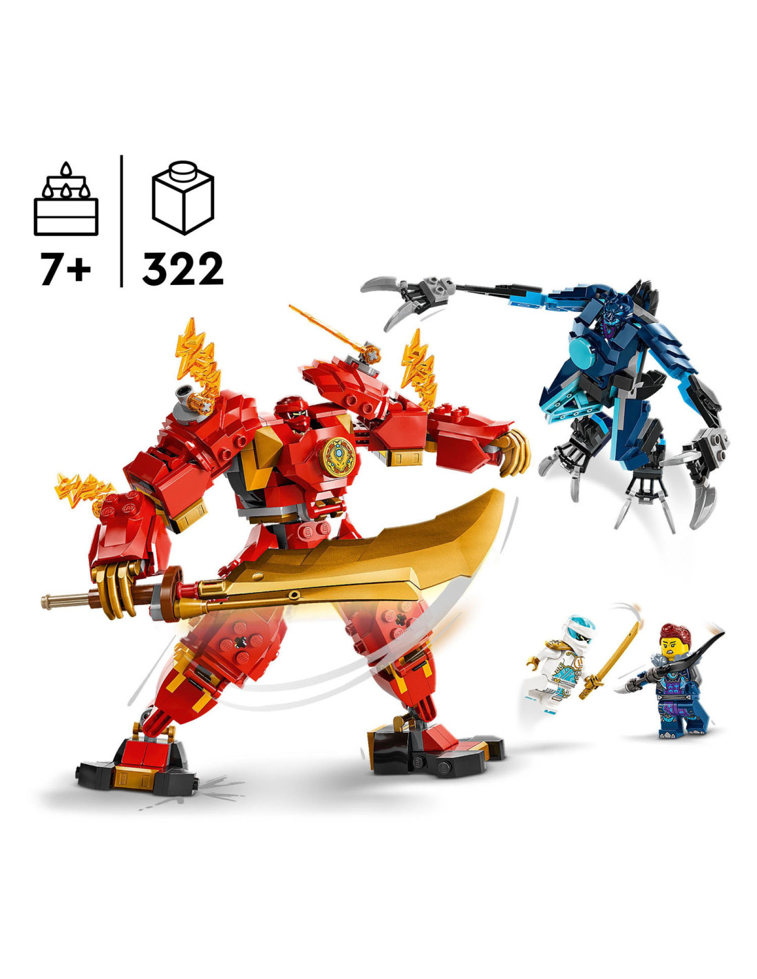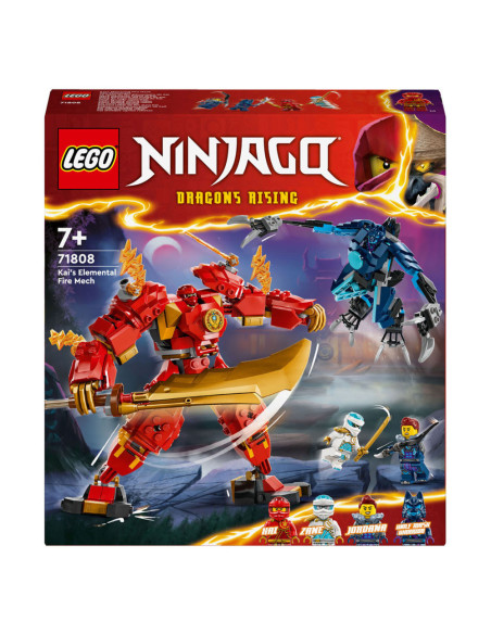Kinderen vanaf 7 jaar kunnen verhalen uit seizoen 2 van de NINJAGO Dragons Rising tv-serie naspelen met het ninja speelgoed Kai's elementaire vuurmecha (71808). De LEGO NINJAGO mech heeft verstelbare armen en benen die naar alle kanten kunnen worden gedraaid, een cockpit voor de ninja minifiguur en een groot gouden zwaard voor rollenspel confrontaties met de Wolvenmecha. Met deze aanpasbare mecha kunnen kinderen hun eigen mecha ontwerpen! De afneembare benen, armen en borst kunnen worden gecombineerd met onderdelen van 2 andere mecha: Cole's elementaire aardemecha (71806) en Sora's elementaire techmecha (71807) (apart verkrijgbaar). Kinderen kunnen eindeloos plezier beleven terwijl ze onderdelen mixen en matchen om een unieke actiefiguur te maken. Deze sets zijn een leuk cadeau voor kinderen!De rode mecha wordt geleverd met 4 minifiguren: NINJAGO Kai en Zane met mini katana's, Jordana met een zwaard en een Wolvenmasker strijder. De NINJAGO speelgoed set kan ook worden gemaakt met behulp van de LEGO Builder app, die jou en je kind begeleidt op een eenvoudig en intuïtief bouwavontuur.Afmetingen: deze LEGO set bevat een NINJAGO mecha van ca. 16 cm hoog.Bevat 322 onderdelen.