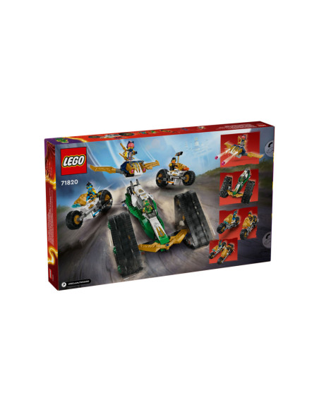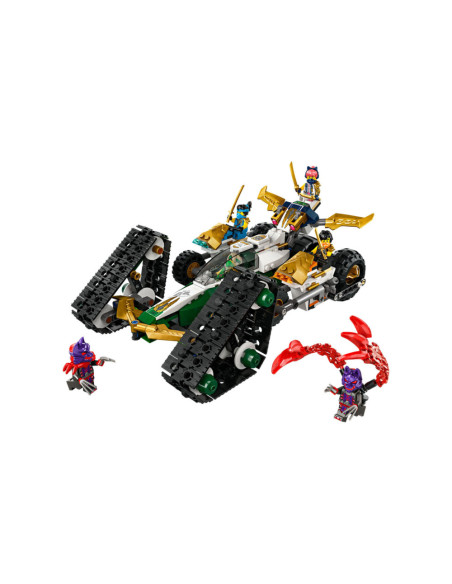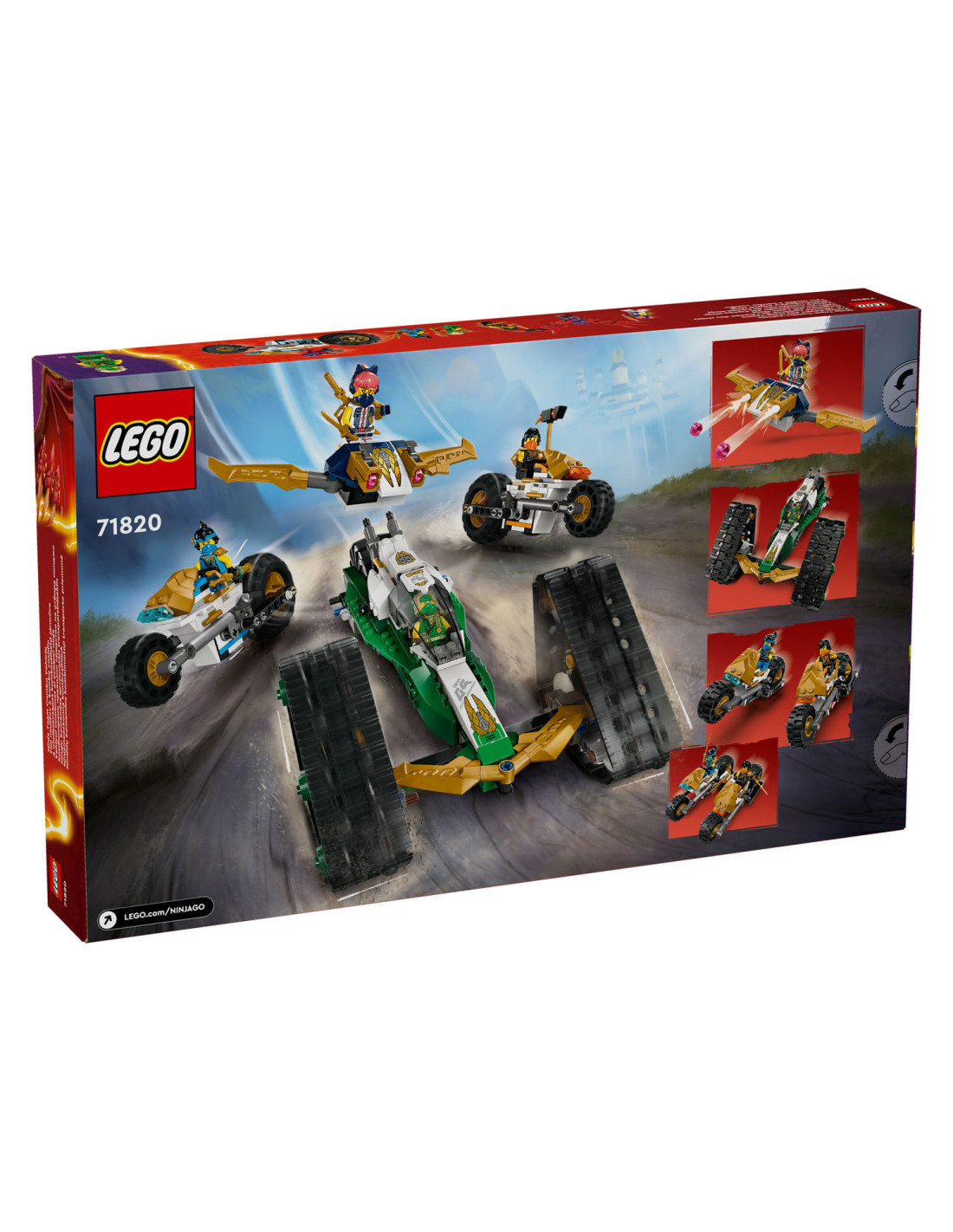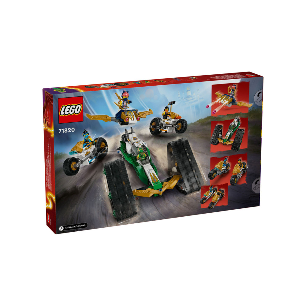 Jongens en meisjes vanaf 9 jaar kunnen avonturen boordevol actie uit seizoen 2 van de tv-serie NINJAGO® Dragons Rising naspelen met dit 4-in-1 avonturenspeelgoed met het Ninjateam combivoertuig (71820). Kinderen kunnen met het grote NINJAGO voertuig spelen voordat ze het splitsen in 4 kleinere voertuigen: Sora's zweefvliegtuig met 2 noppenschieters, Lloyd's offroad racewagen en Cole en Nya's motoren.