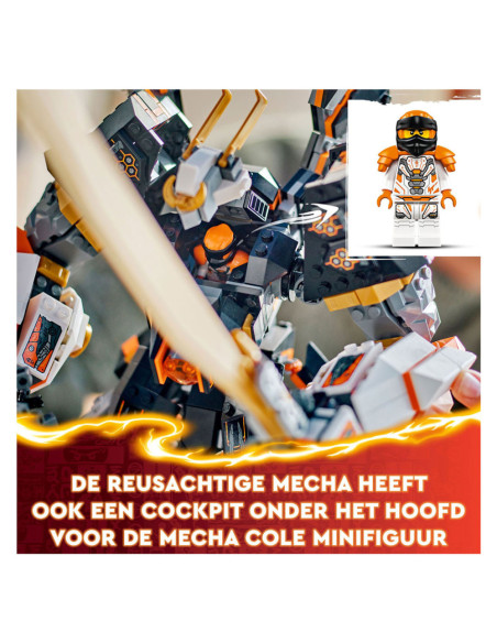 Deze speelgoedmecha is inclusief 1 NINJAGO minifiguur: Mecha Cole met 2 katana's. Er is ook een cockpit waarin ninjafans Mecha Cole kunnen plaatsen om samen spannende duels aan te gaan. Na het spelen is de drakenmecha een cool displaymodel.