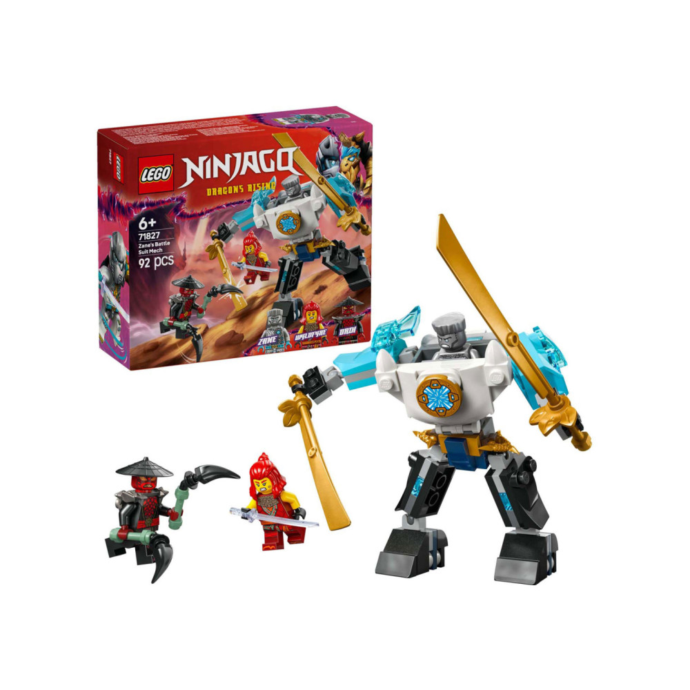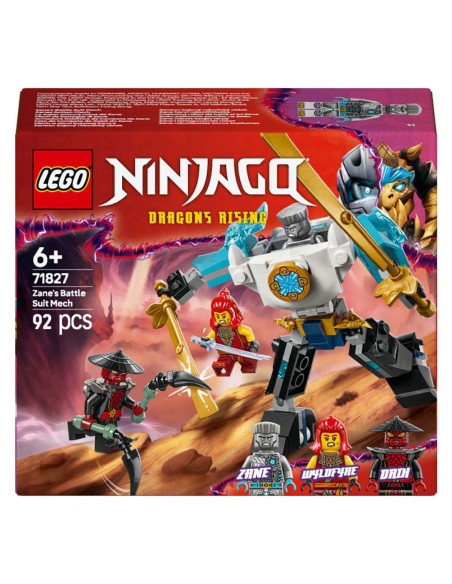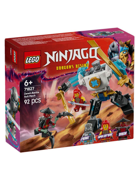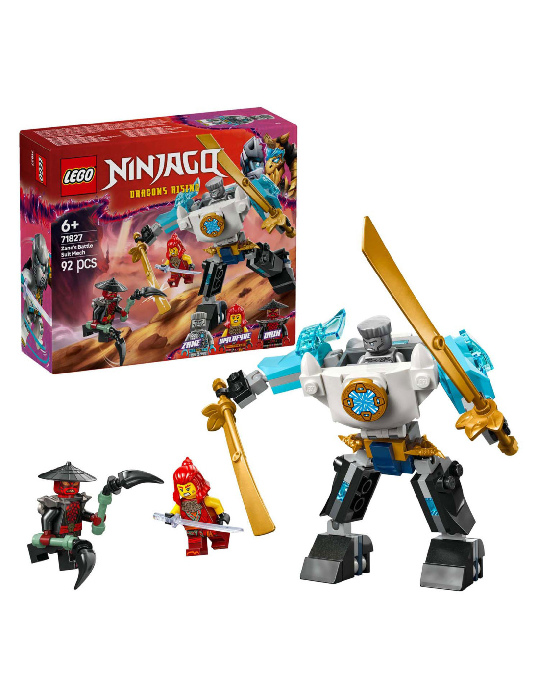 Met de speelgoedset LEGO® NINJAGO® Zane's strijdmecha (71827) kunnen jongens en meisjes vanaf 6 jaar spannende actie naspelen uit seizoen 3 van de tv-serie NINJAGO De Drakenstrijd. Deze bouwset voor kinderen bestaat uit een NINJAGO mecha met verstelbare armen, benen en handen, een bovenlichaam dat 360 graden kan draaien, een borstkas die open kan om een minifiguur in te plaatsen en 2 grote zwaarden.Deze LEGO speelset bevat 3 minifiguren van NINJAGO personages: Zane met 2 shuriken, Wyldfyre met een kristallen katana en Drix, de Meester van Zwermen van de Verboden Vijf, met 2 sikkels zodat kinderen kunnen genieten van urenlange rollenspelavonturen in de NINJAGO wereld.Het LEGO NINJAGO assortiment met bouwbaar actiespeelgoed omvat mecha, draken en tempels waarmee fans de actie kunnen naspelen. Elke ninjaspeelset kan in elkaar worden gezet met behulp van de LEGO Builder app, die jou en je kind begeleidt op een eenvoudig en intuïtief bouwavontuur.