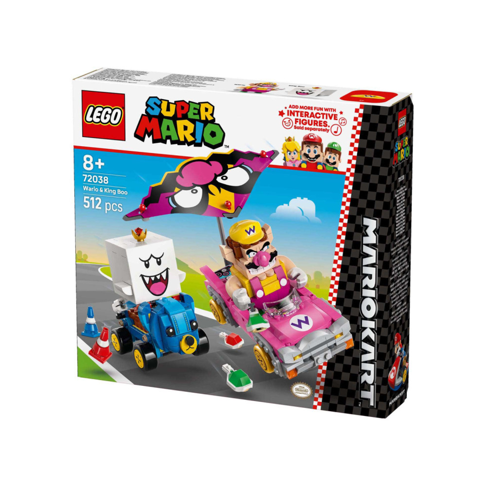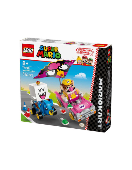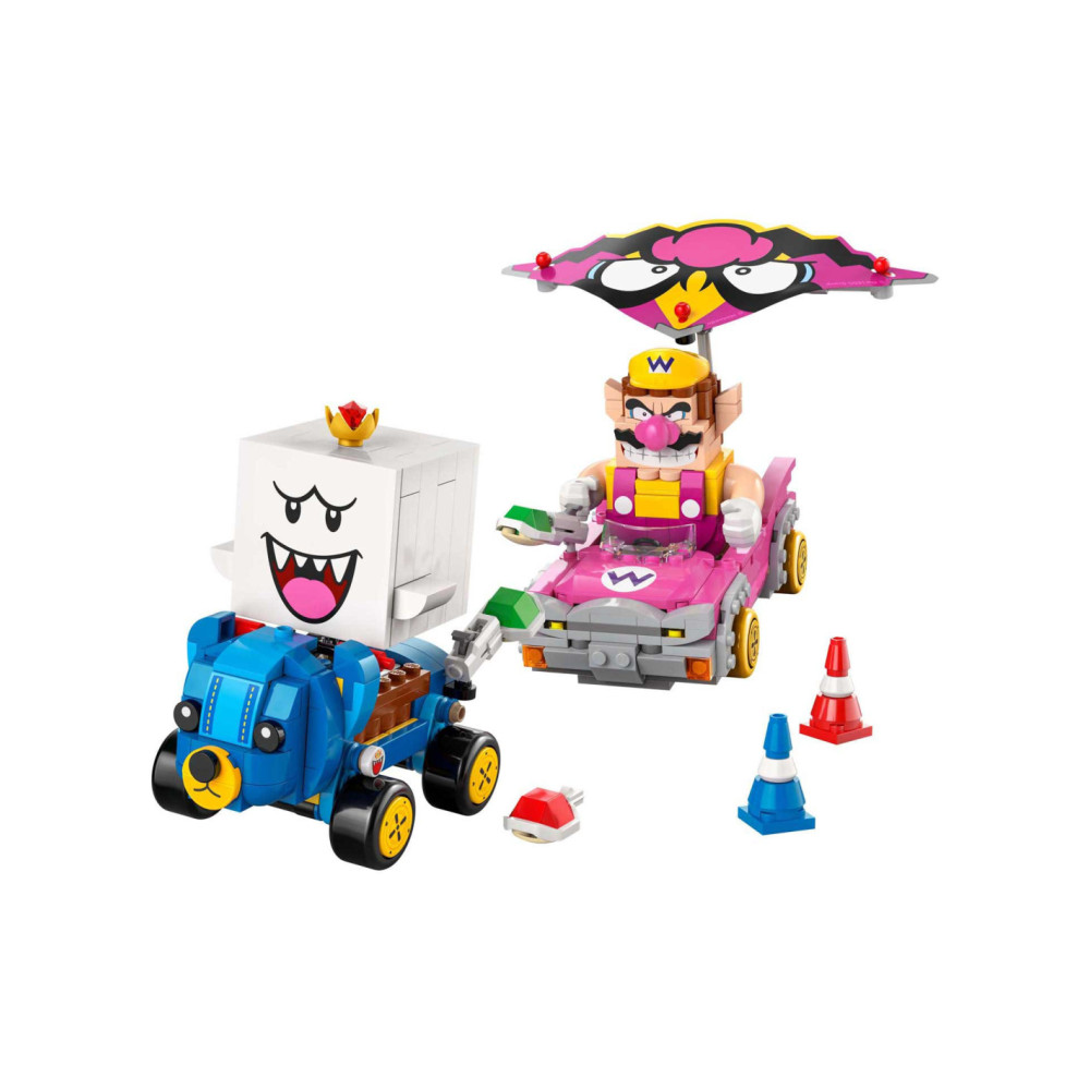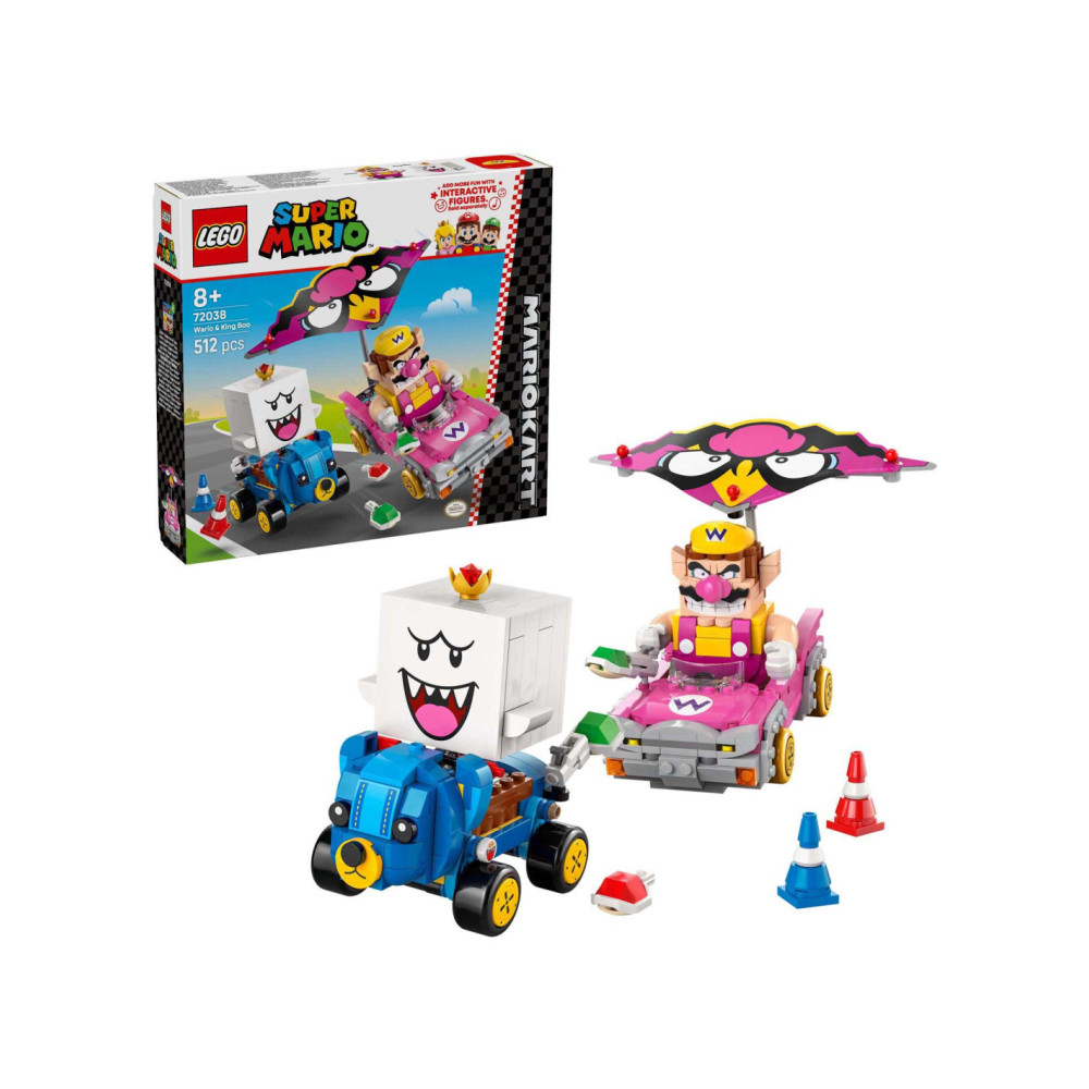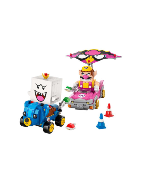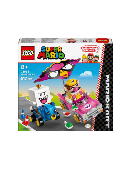 Race, drift en zweef met deze LEGO® Super Mario™: Mario Kart™ – Wario en King Boo speelset voor kinderen (72038). De set is een leuk cadeau met Nintendo® personages voor gamers vanaf 8 jaar en bevat 2 LEGO Super Mario figuren en modellen van de bekende Blingbolide en Knuffelquad voertuigen, plus 2 pylonnen. Elke kart heeft een lanceringsfunctie voor schilden en kan driften. De Blingbolide heeft een afneembare vlieger die ook op de Knuffelquad past.