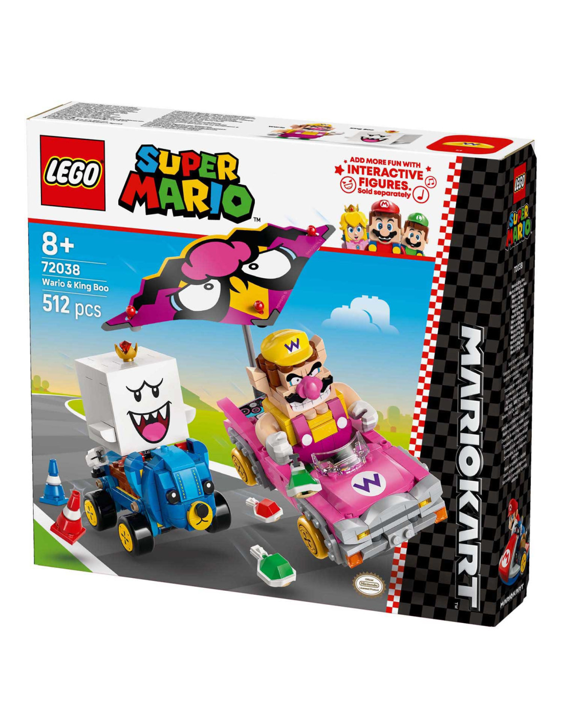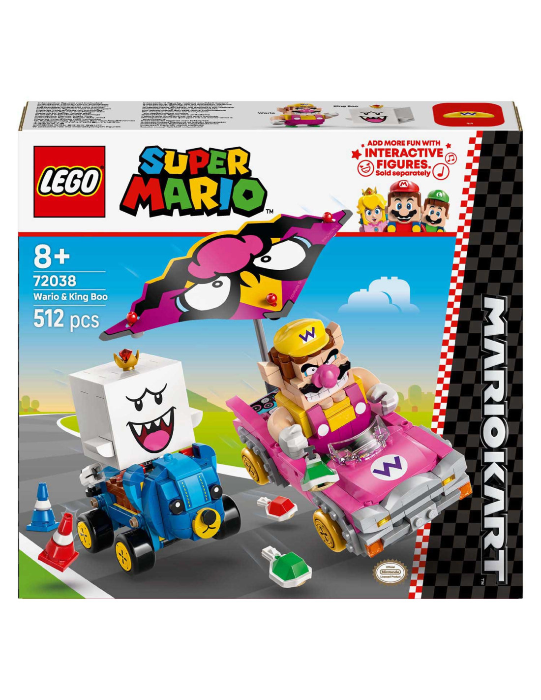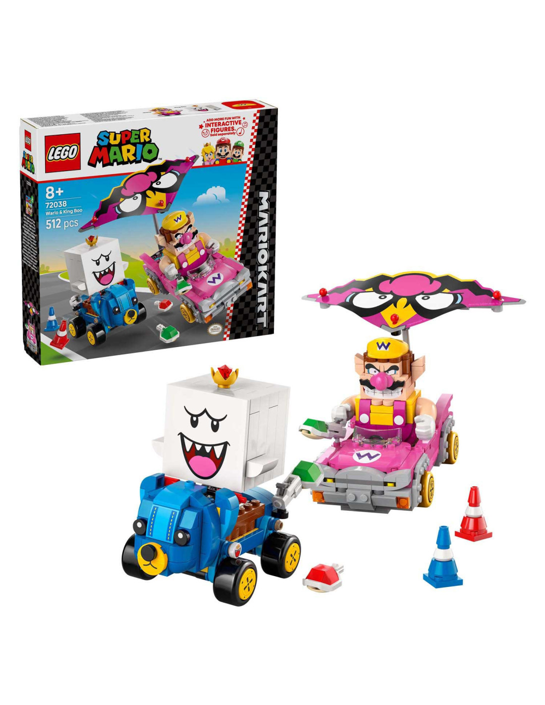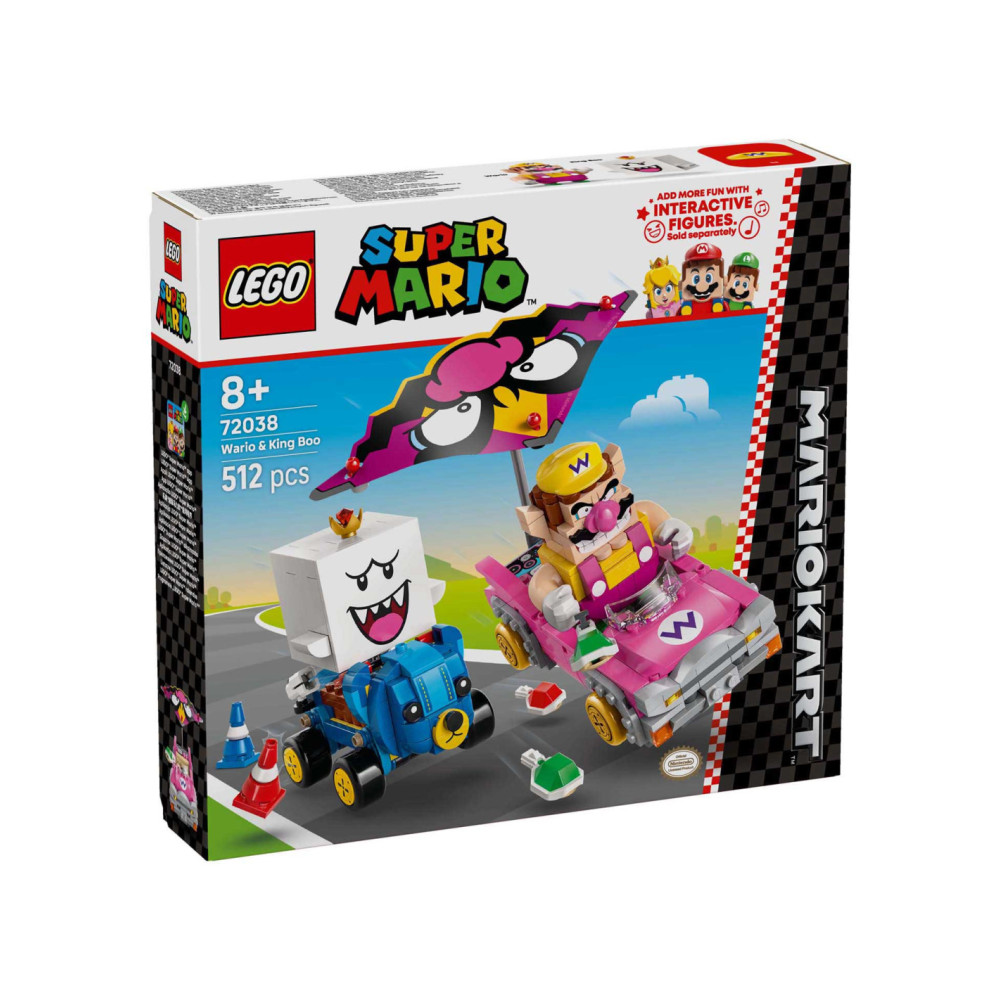 Race, drift en zweef met deze LEGO® Super Mario™: Mario Kart™ – Wario en King Boo speelset voor kinderen (72038). De set is een leuk cadeau met Nintendo® personages voor gamers vanaf 8 jaar en bevat 2 LEGO Super Mario figuren en modellen van de bekende Blingbolide en Knuffelquad voertuigen, plus 2 pylonnen. Elke kart heeft een lanceringsfunctie voor schilden en kan driften. De Blingbolide heeft een afneembare vlieger die ook op de Knuffelquad past.